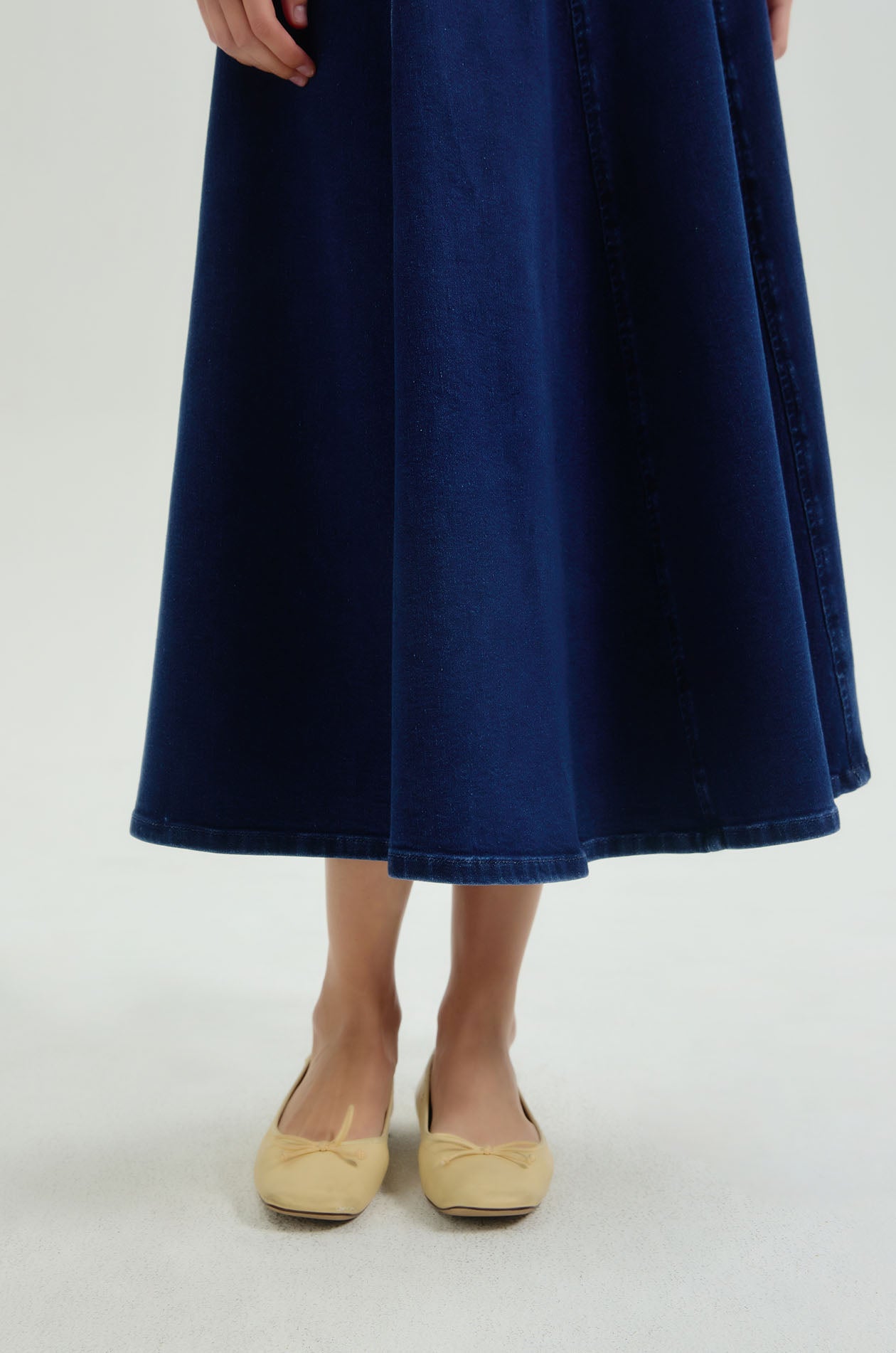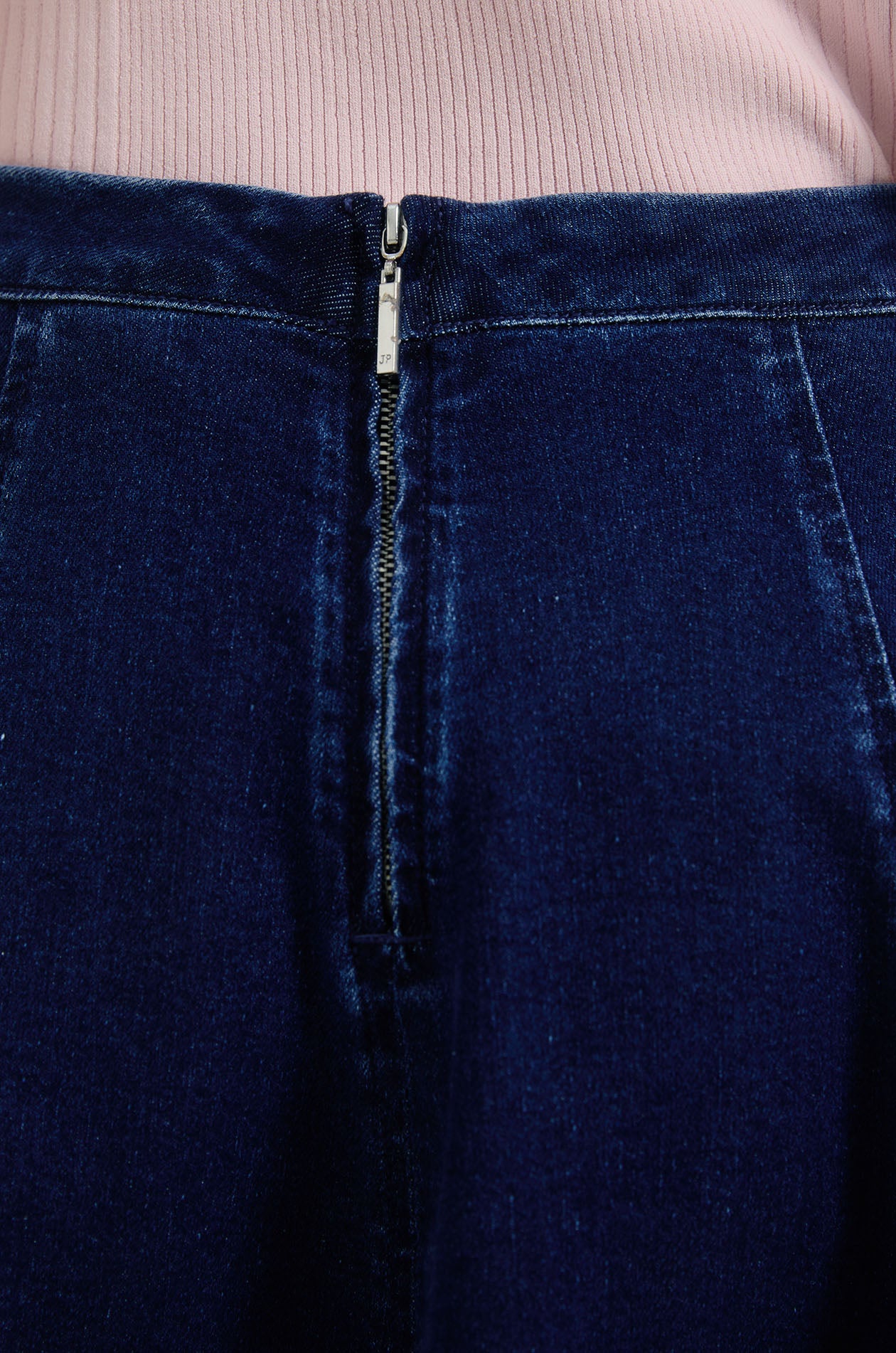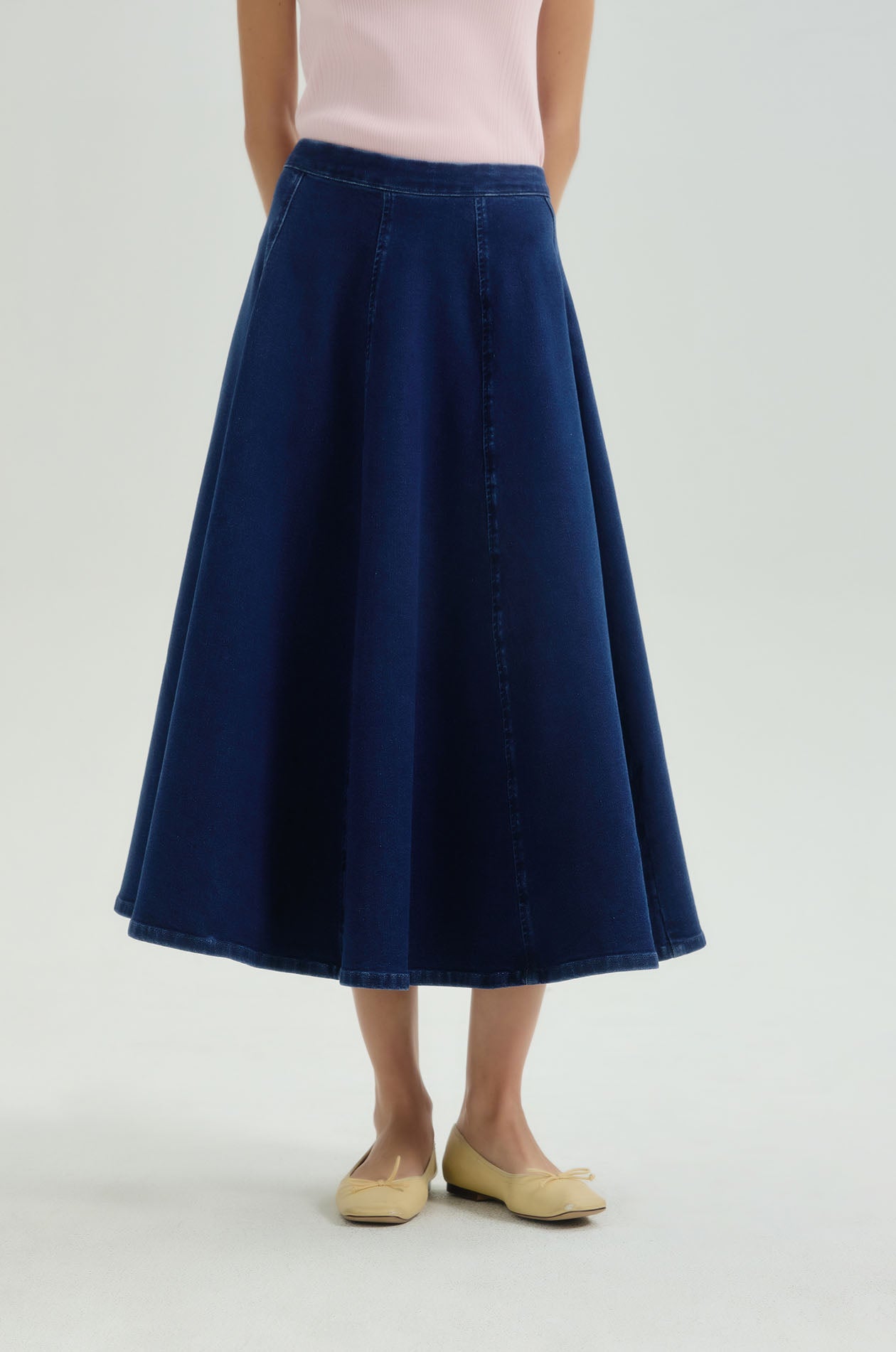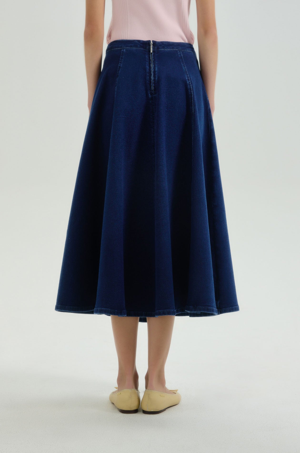 Mid-rise midi skirt in denim. Circle silhouette with seamed detail. Back zip closure. Available in dark blue.