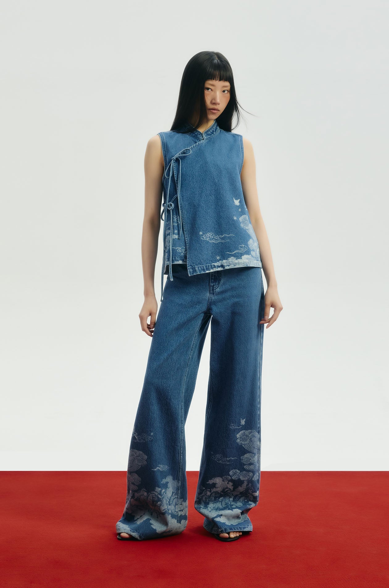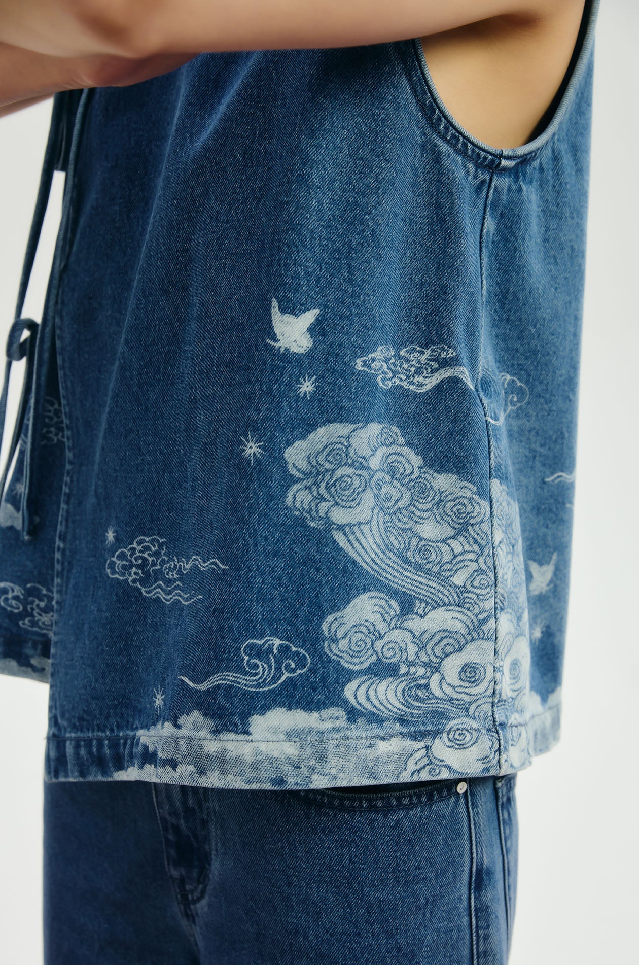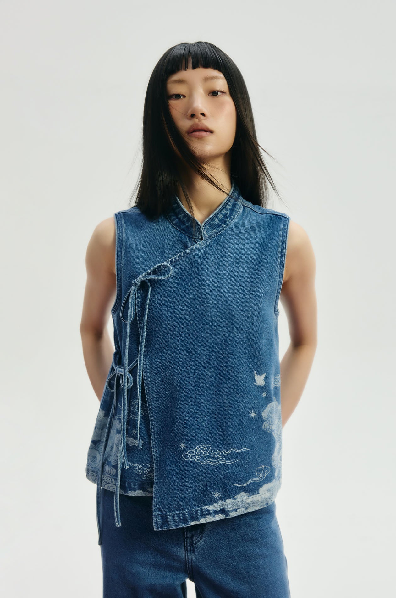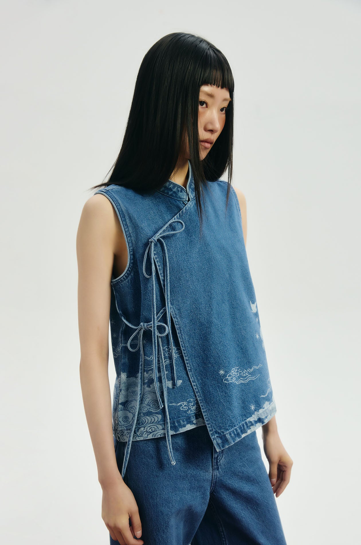 Jaspal x nussdaydream for Lunar New Year | Sleeveless top in denim. Auspicious motif print. Regular fit with mandarin collar. Wrap-tie closure. Available in dark blue.