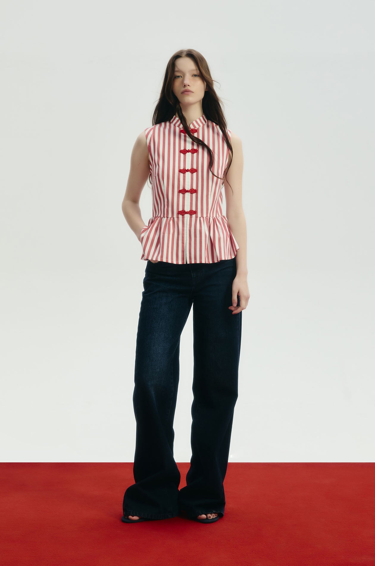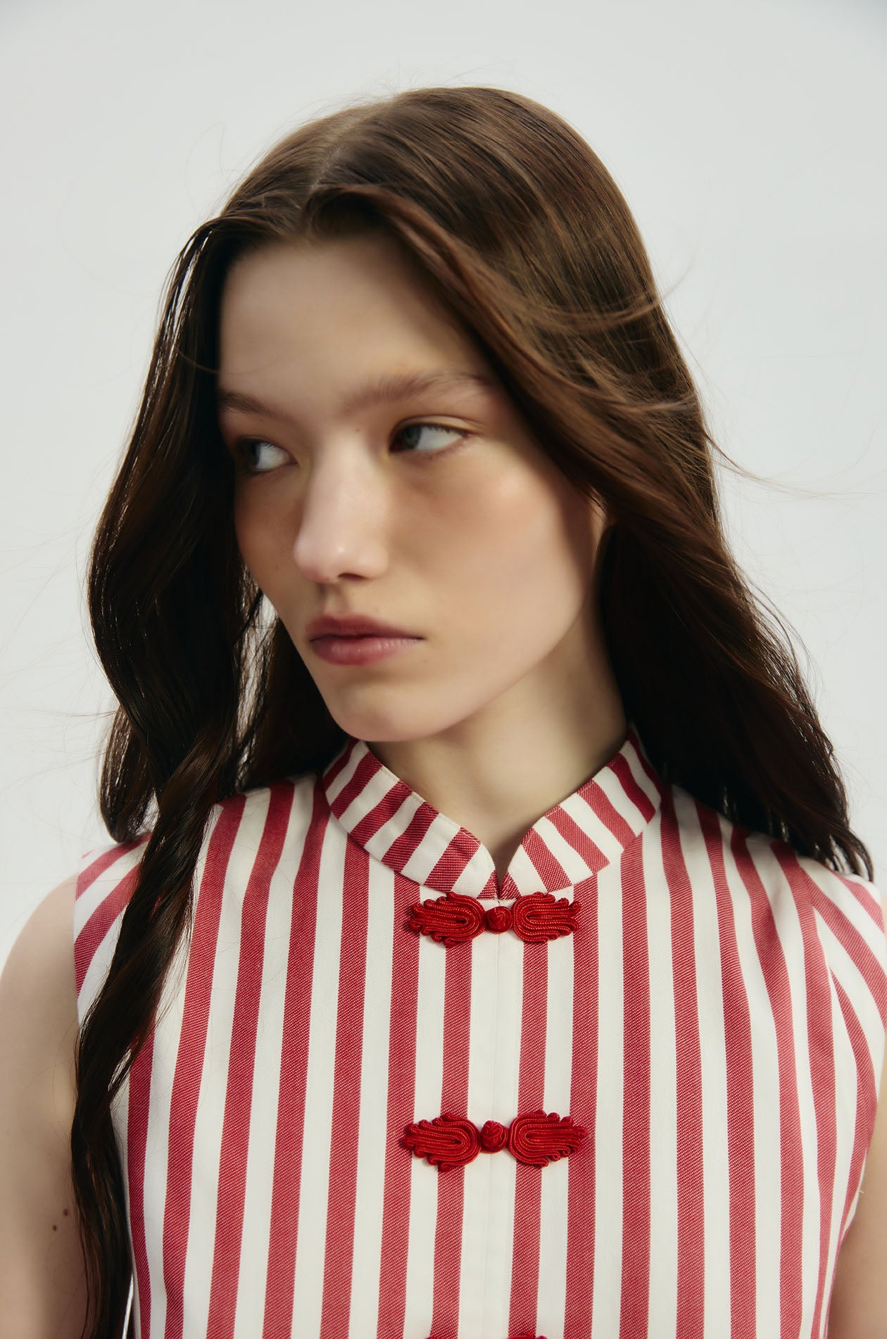 Jaspal x nussdaydream for Lunar New Year | Sleeveless top in broadcloth with awning stripes. Regular fit with Cheongsam-inspired design. Mandarin collar, pankou knot button detail, and flounce hem. Back zip closure. Available in Chinese Red/white.