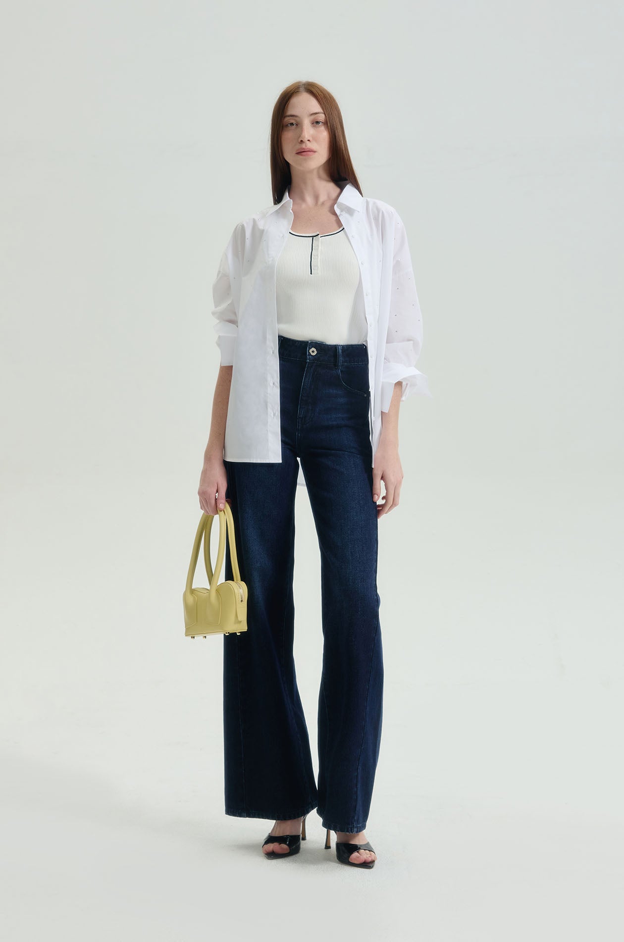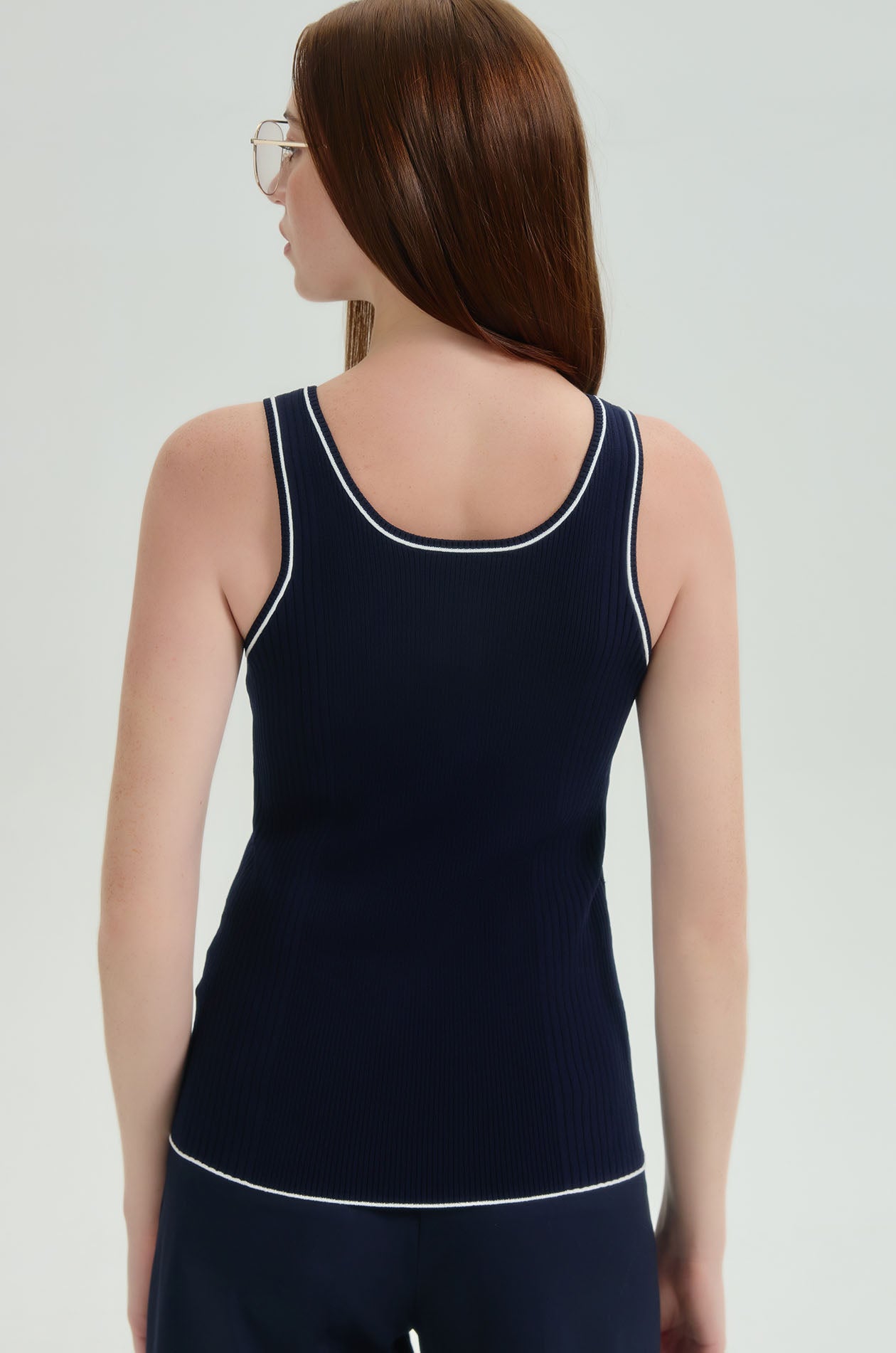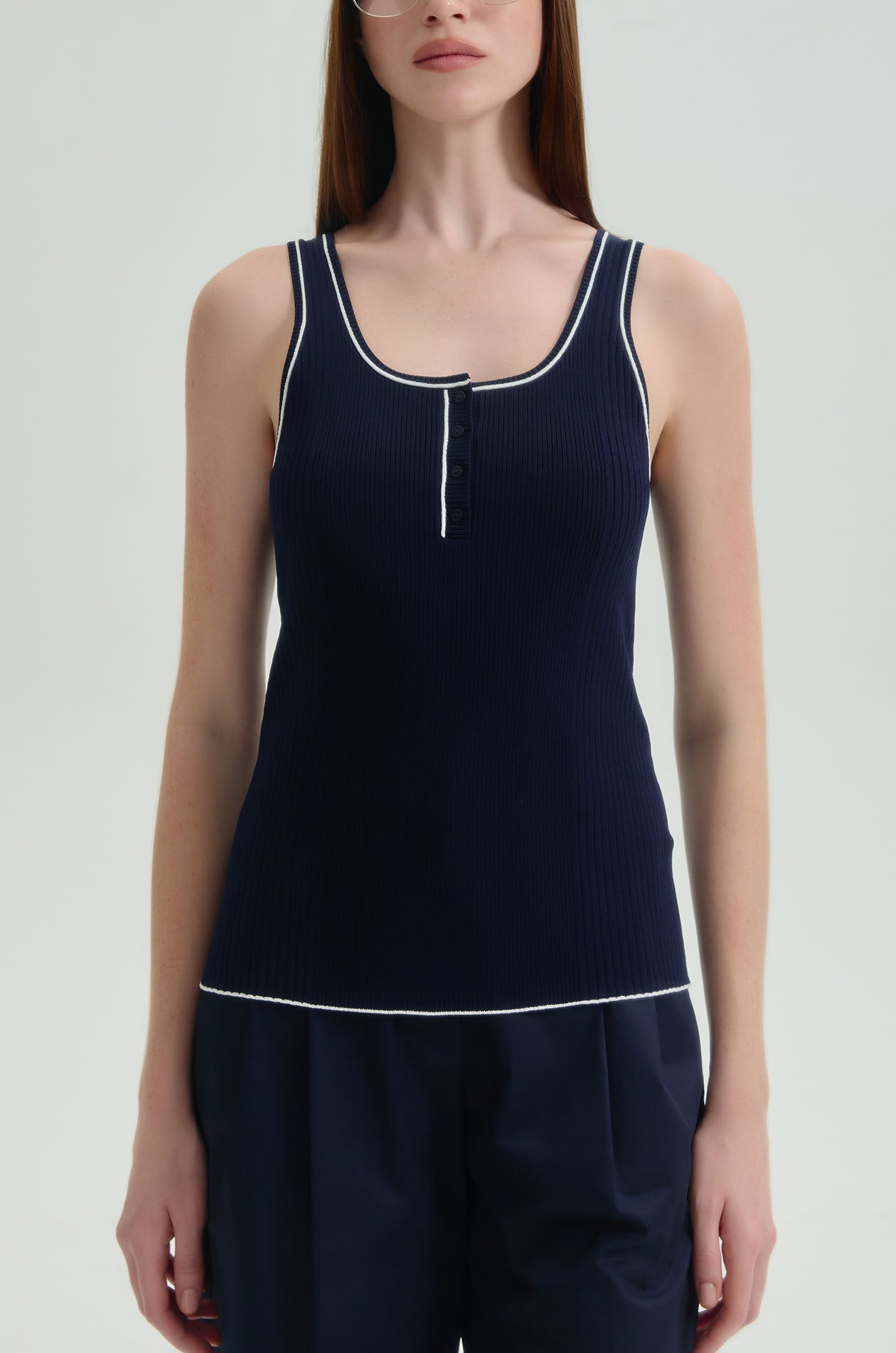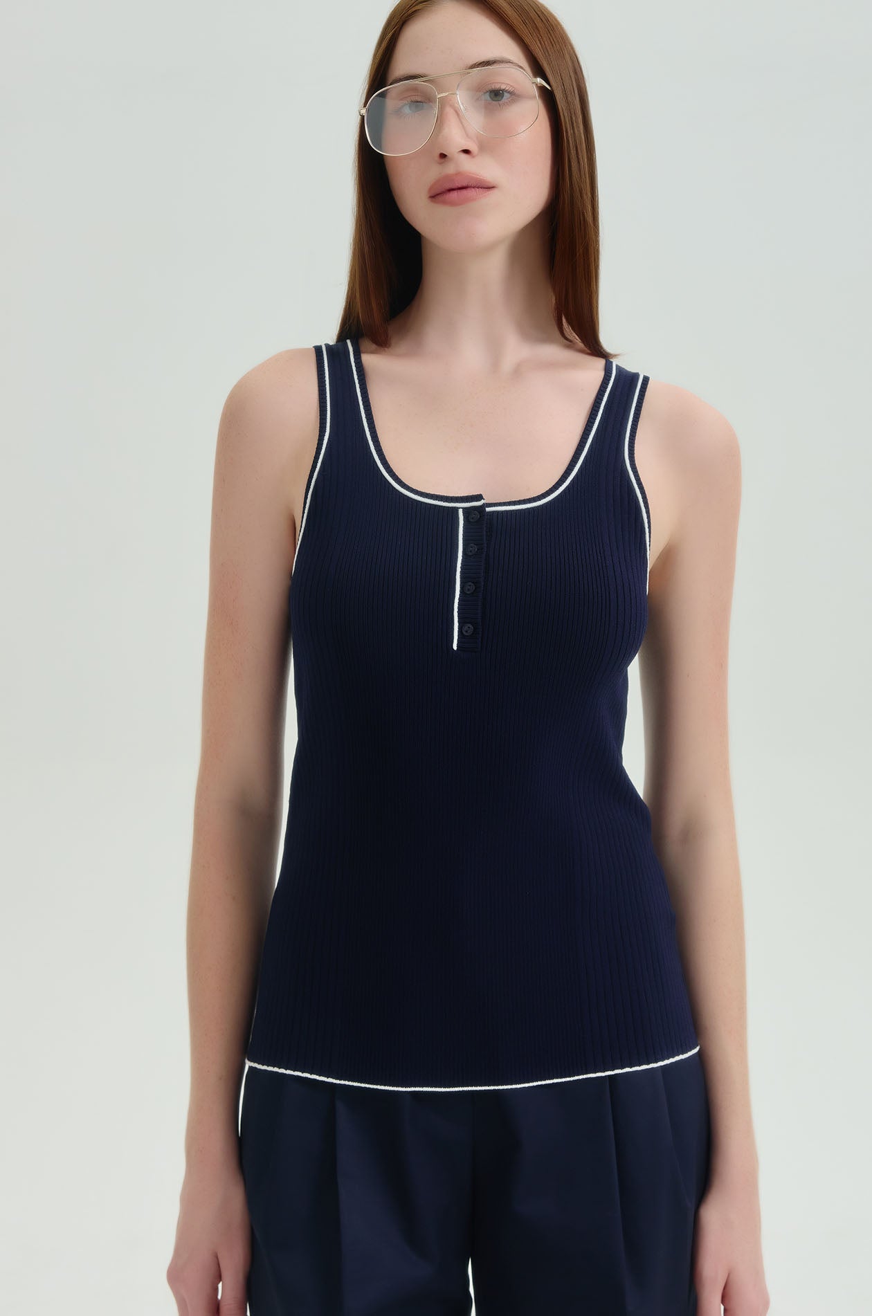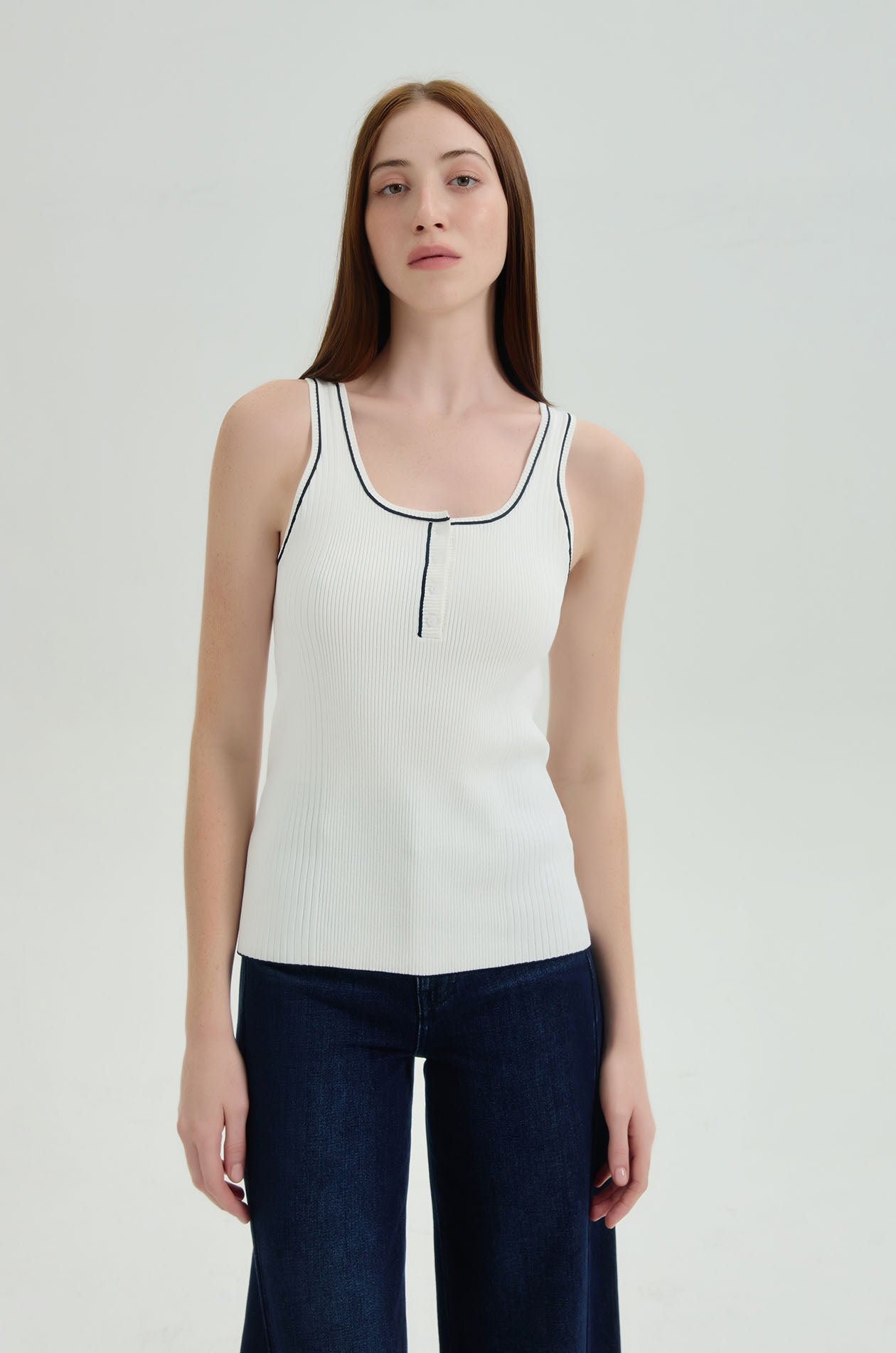 Scoop neck tank top in ribbed knit fabric. Fitted silhouette with button accent at the neckline. Available in white and navy.