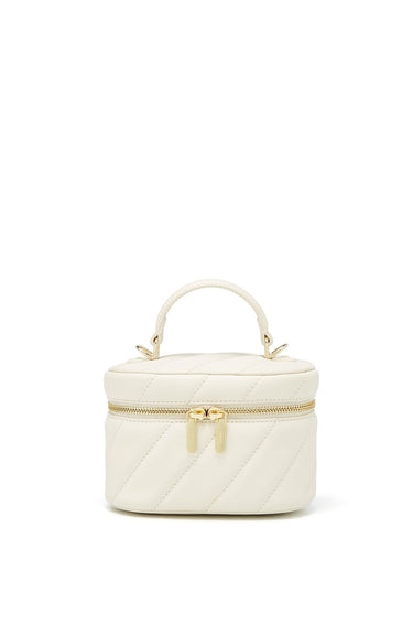 Bucket bag in quilt leather with golden hardware. Matching top handle and removable shoulder strap. Zip closure. Available in black, off-white, and pink.