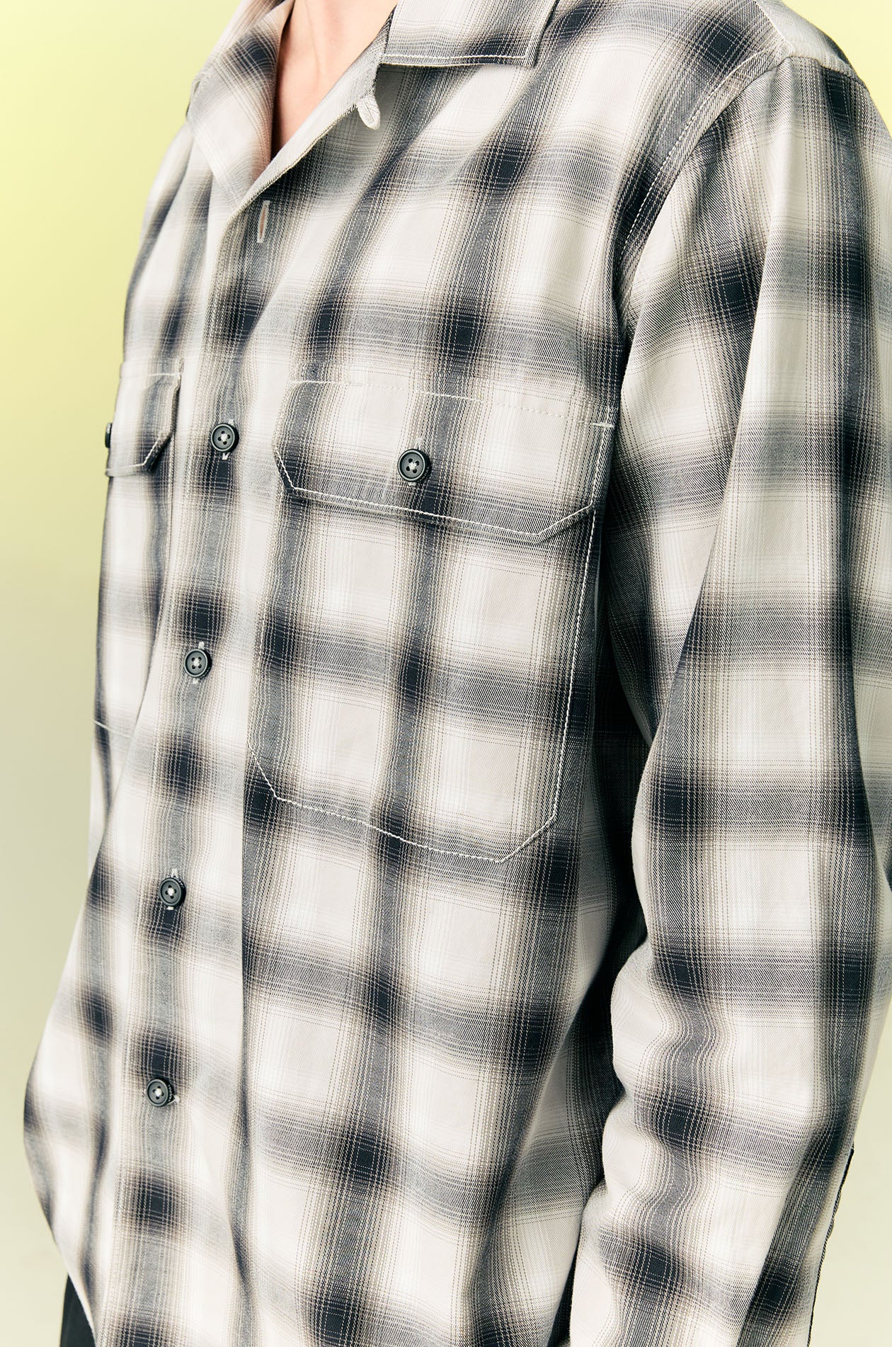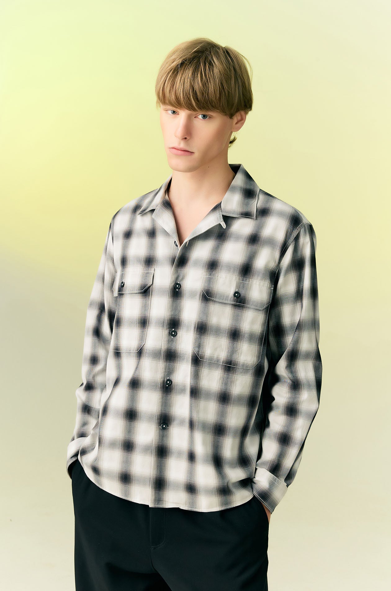 Long-sleeved shirt in cotton with check pattern. Relax fit with camp collar, oversized chest pockets, and buttoned cuffs. Front button closure. Available in light grey.