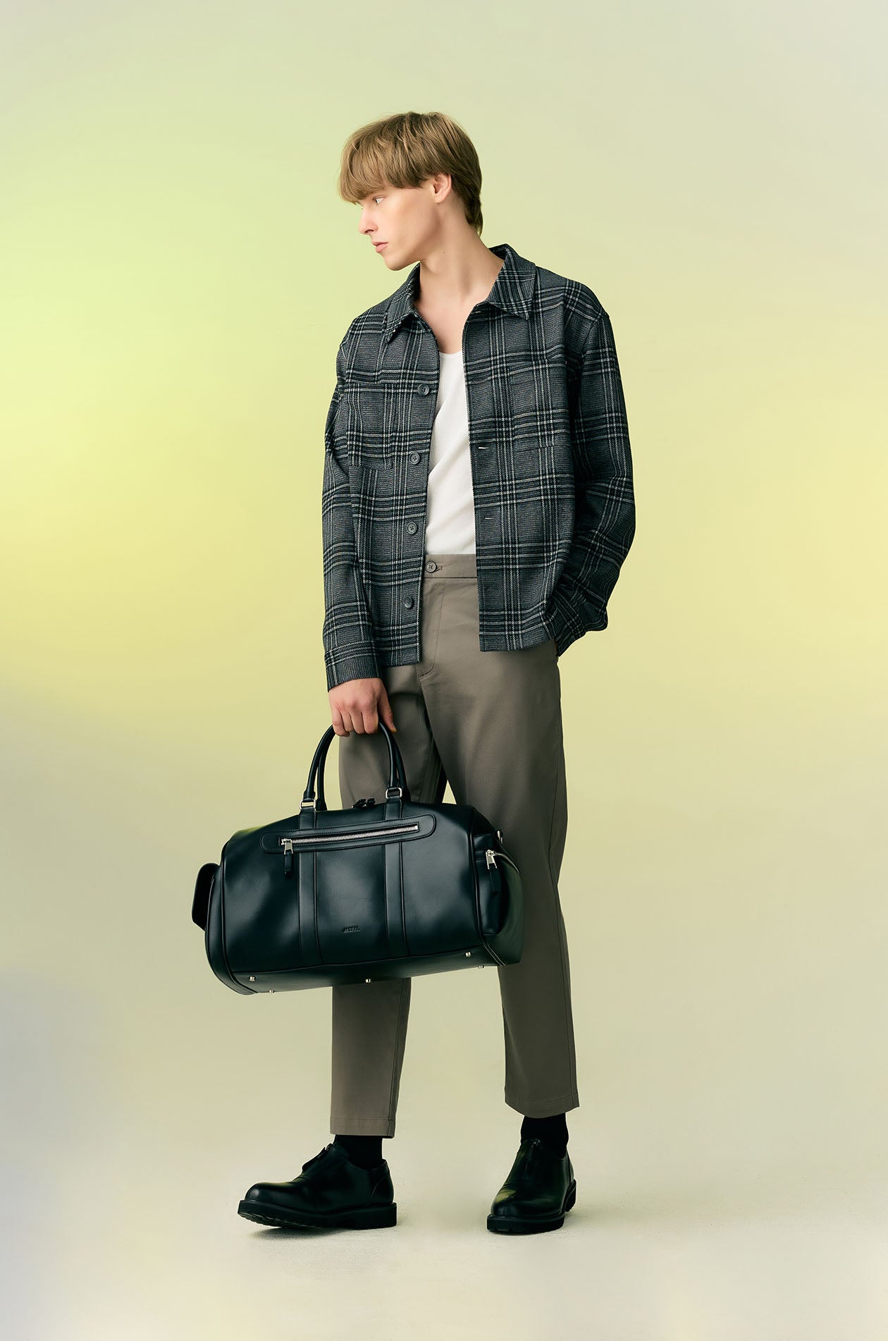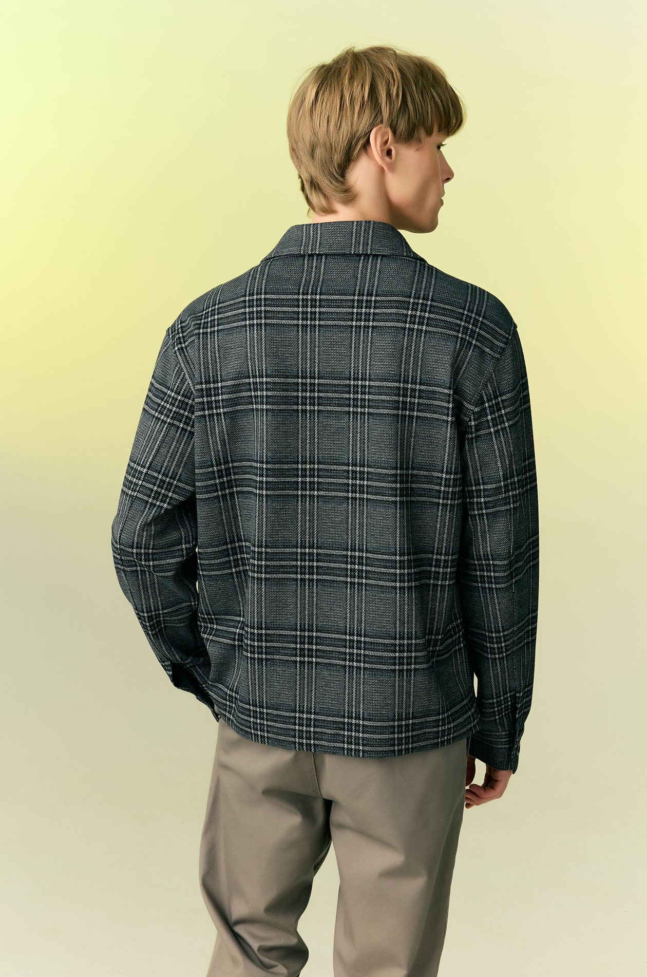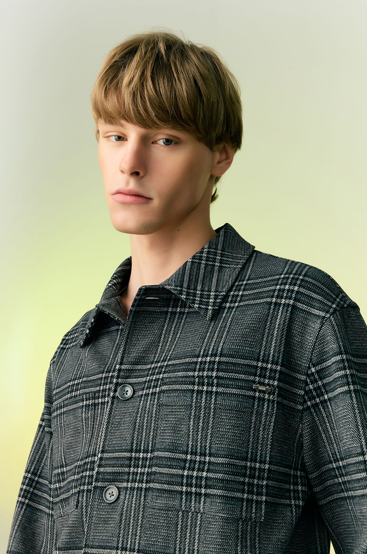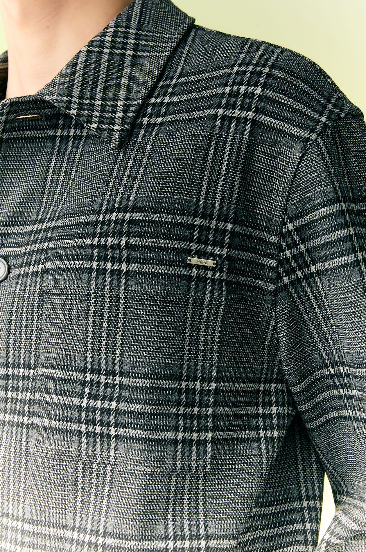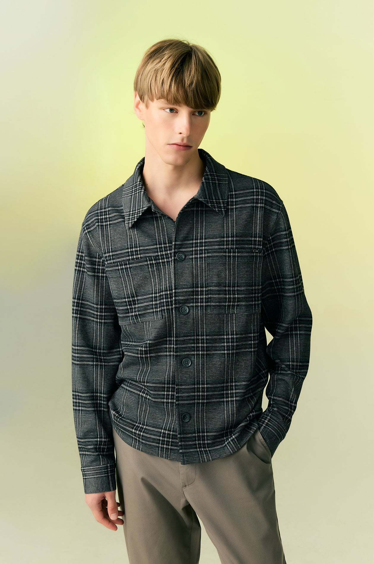 Long-sleeved overshirt in terry viscose with plaid pattern. Classic collar, chest pocket, and buttoned cuffs. Front button closure. Available in dark grey.