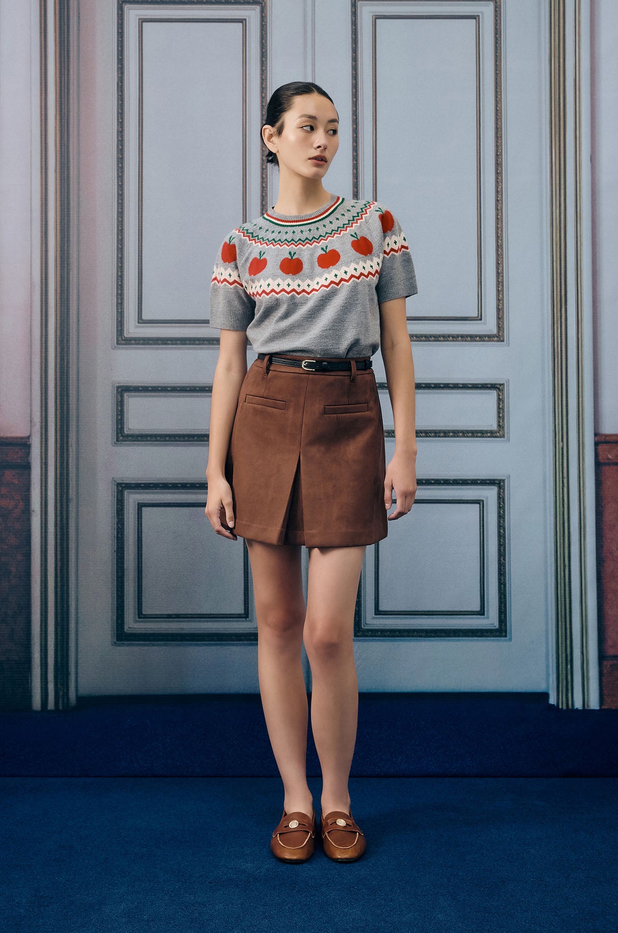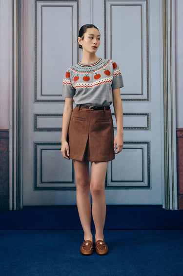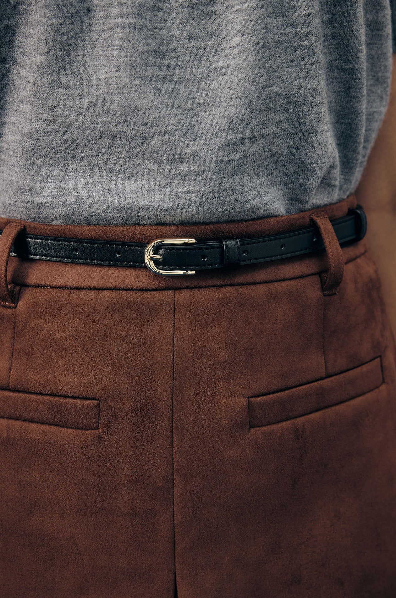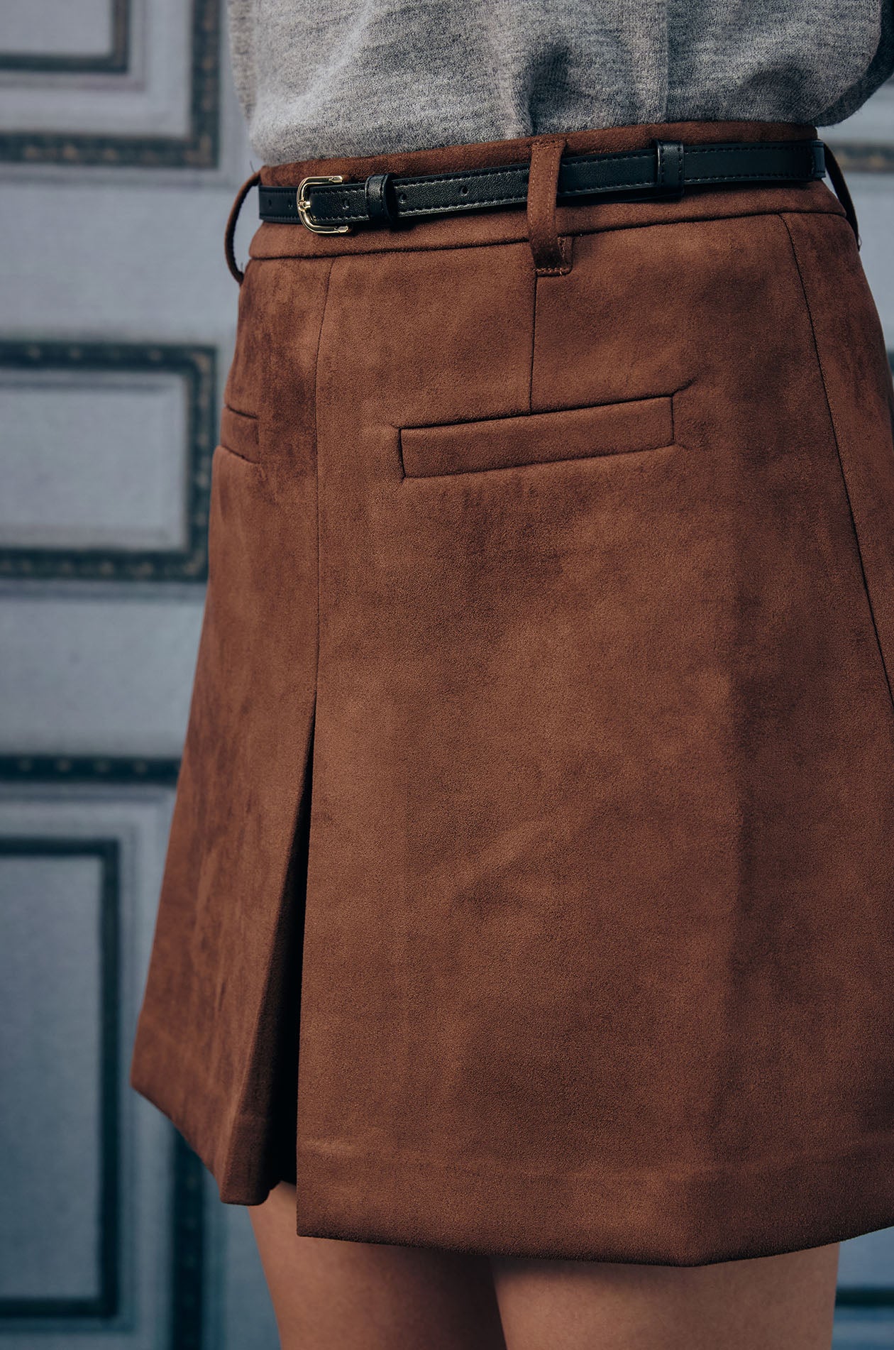 High-rise mini skirt in faux suede. A-line silhouette with invert box pleat and faux pockets. Skinny faux leather belt. Back button closure. Available in dark brown.