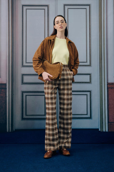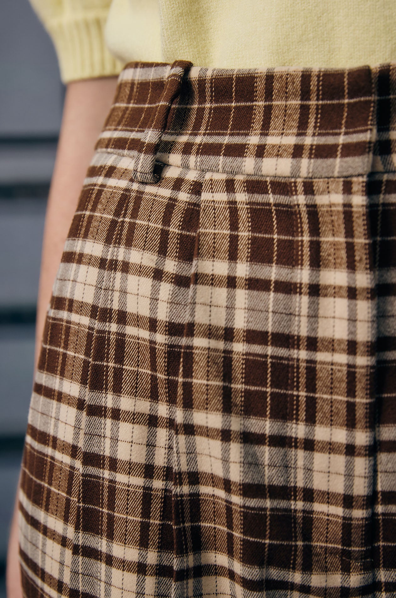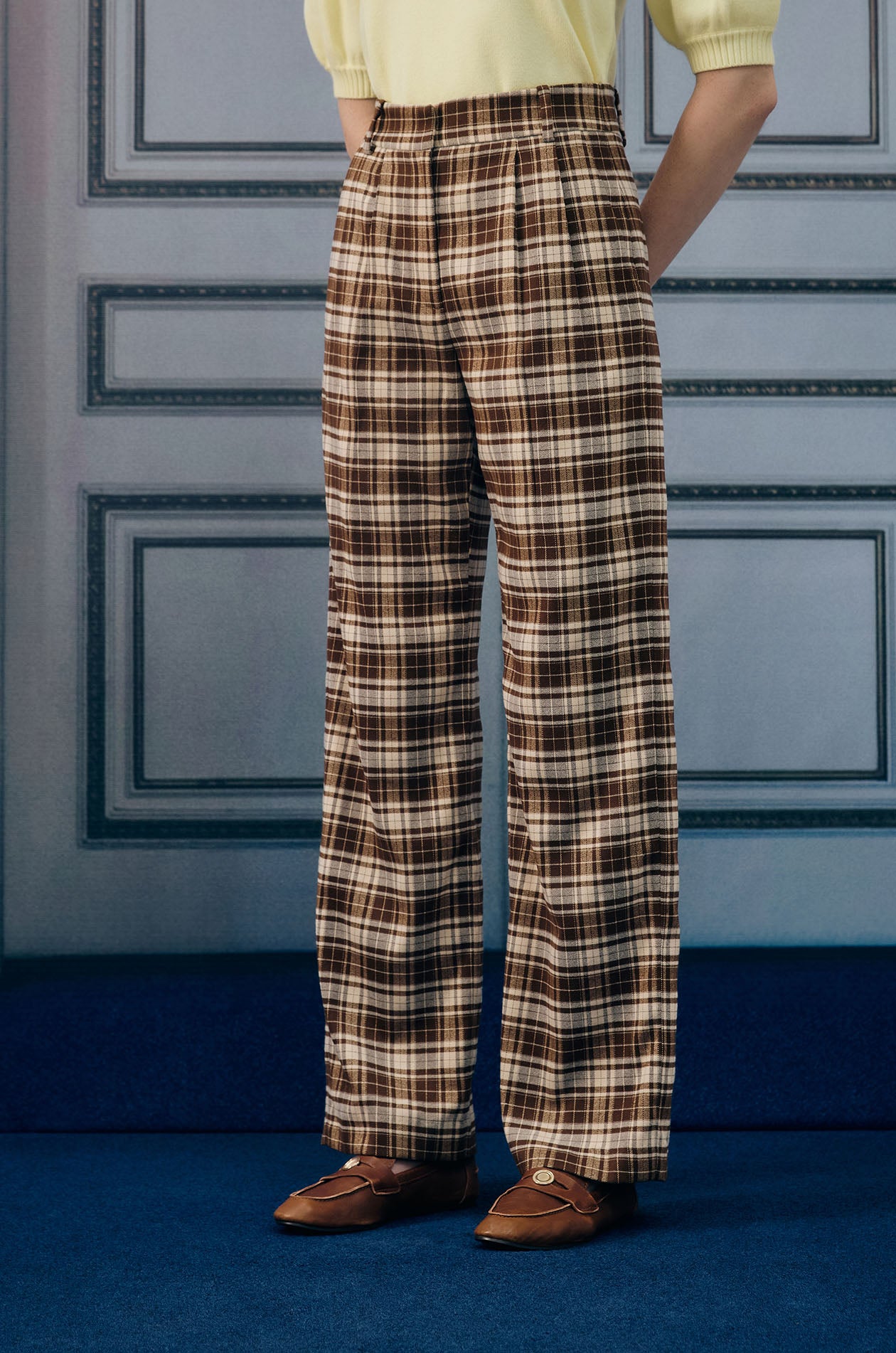High-rise pants in suiting fabric with plaid pattern. Loose-straight legs with front pleats and side pockets. Front hook and zip closure. Available in brown.