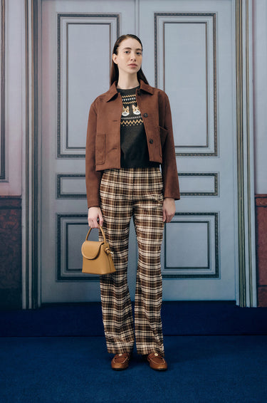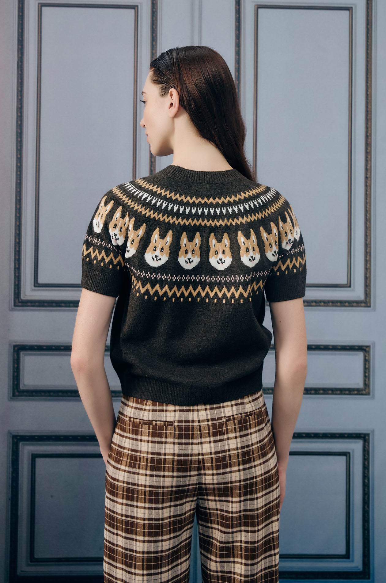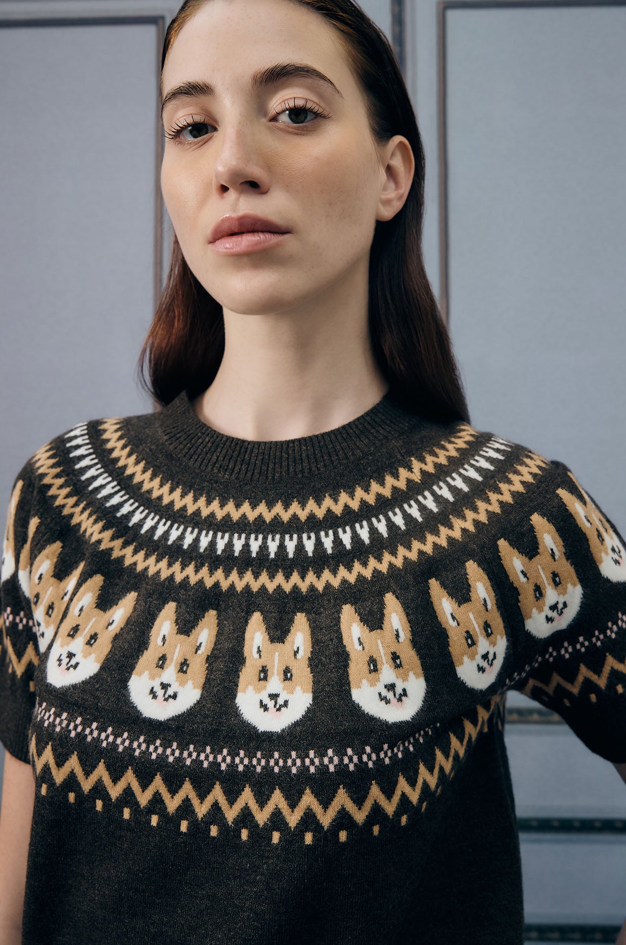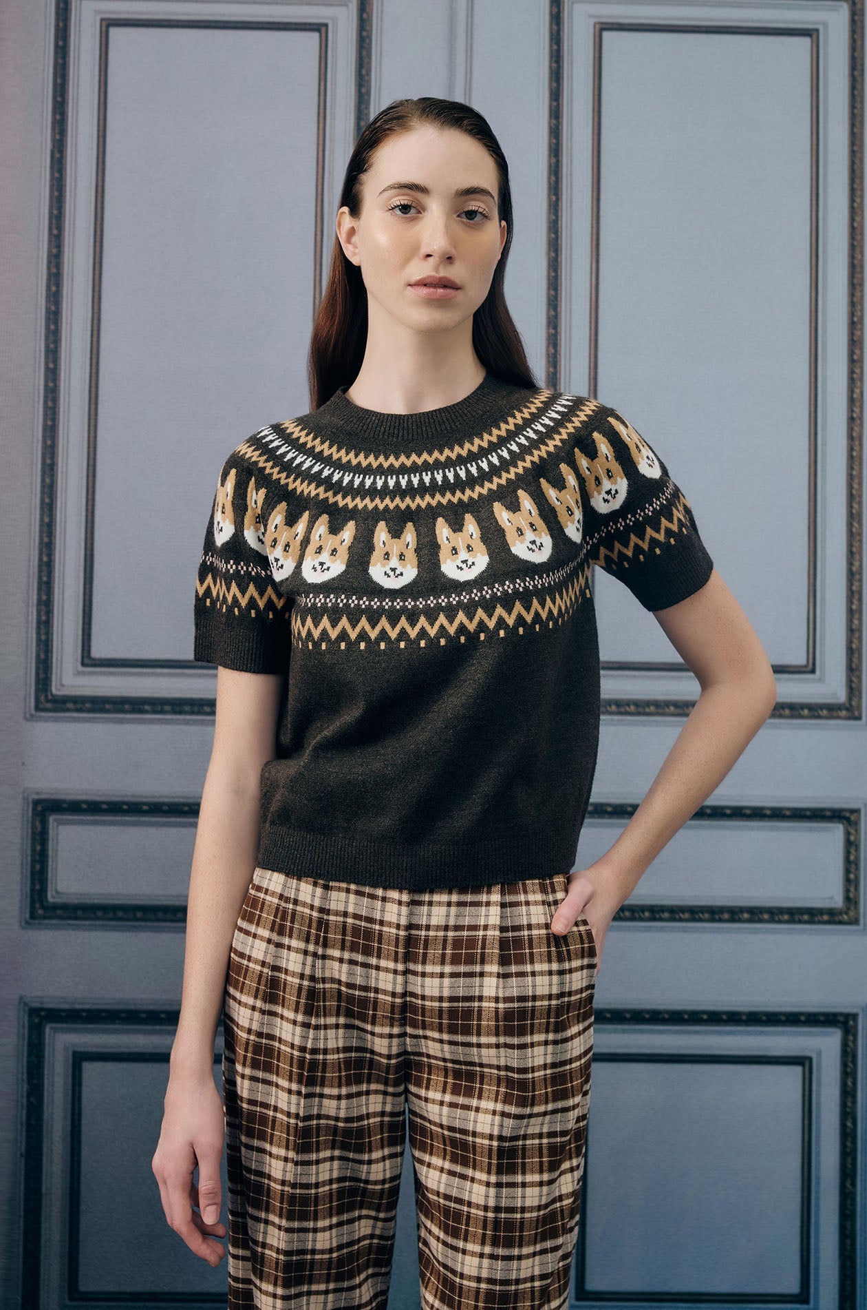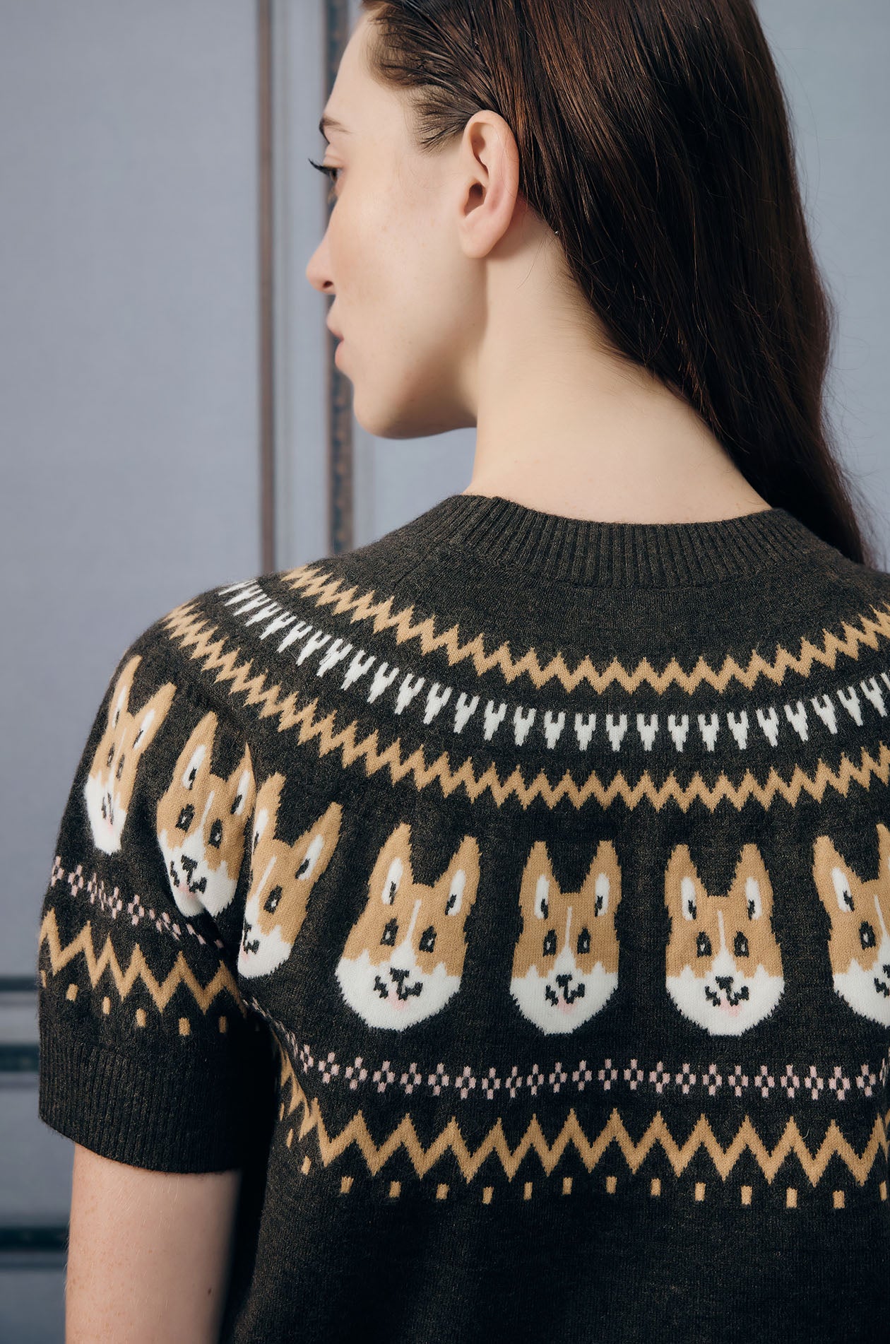 Short-sleeved sweater in jacquard knit fabric. This sweater is adorned with a charming pattern of corgi faces. Regular fit with crew neckline and ribbed edges. Available in dark brown.