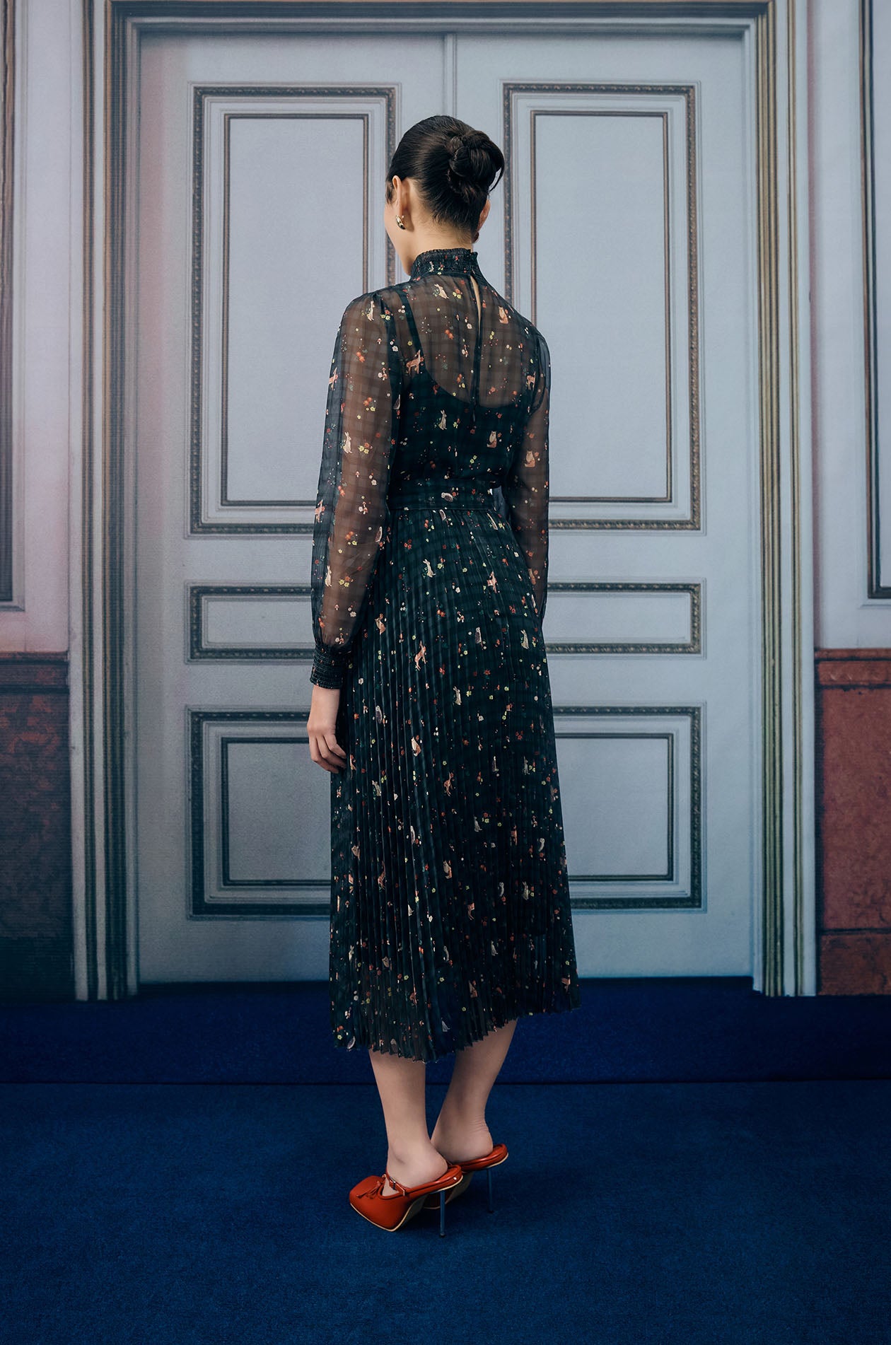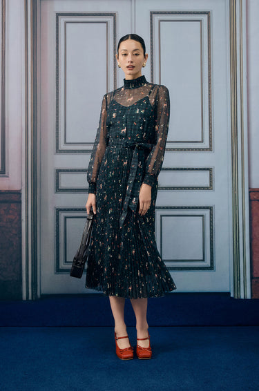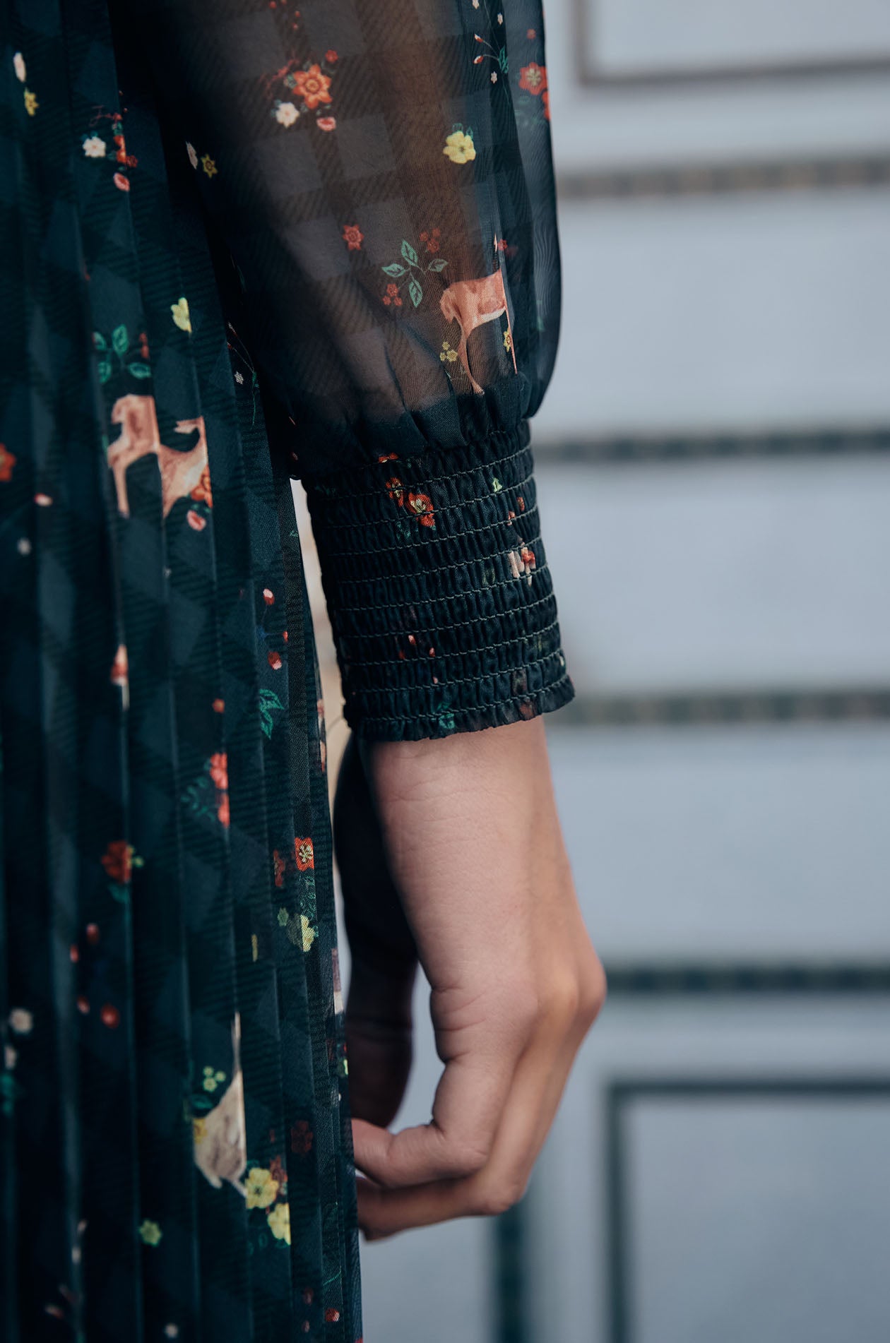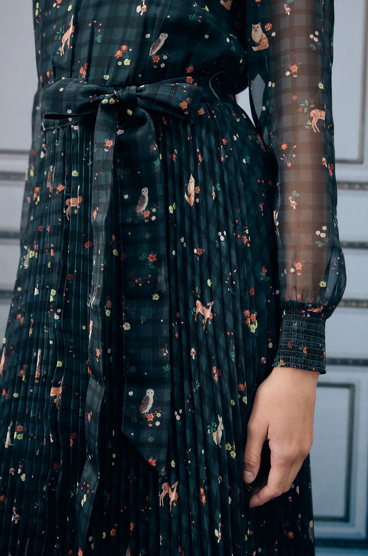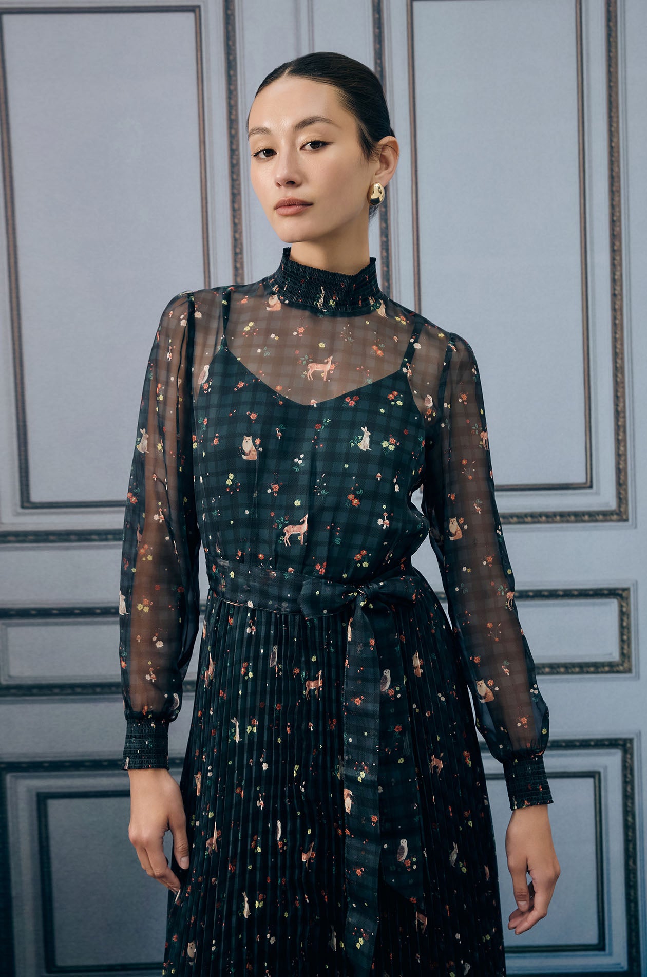 Long-sleeved midi dress in sheer fabric with plaid pattern. Floral and animals print. Elastic high neck and cuffs. Pleated skirt with matching waist tie. Partial lining. Back zip closure. Available in dark jungle green.