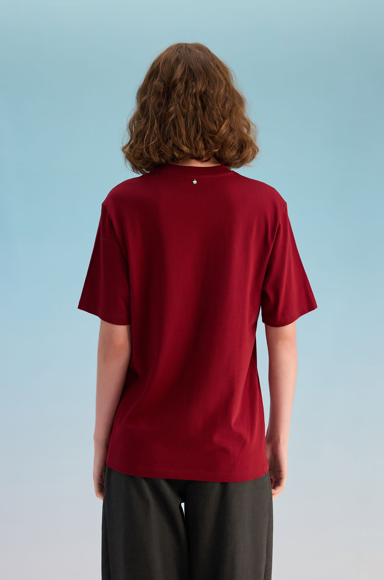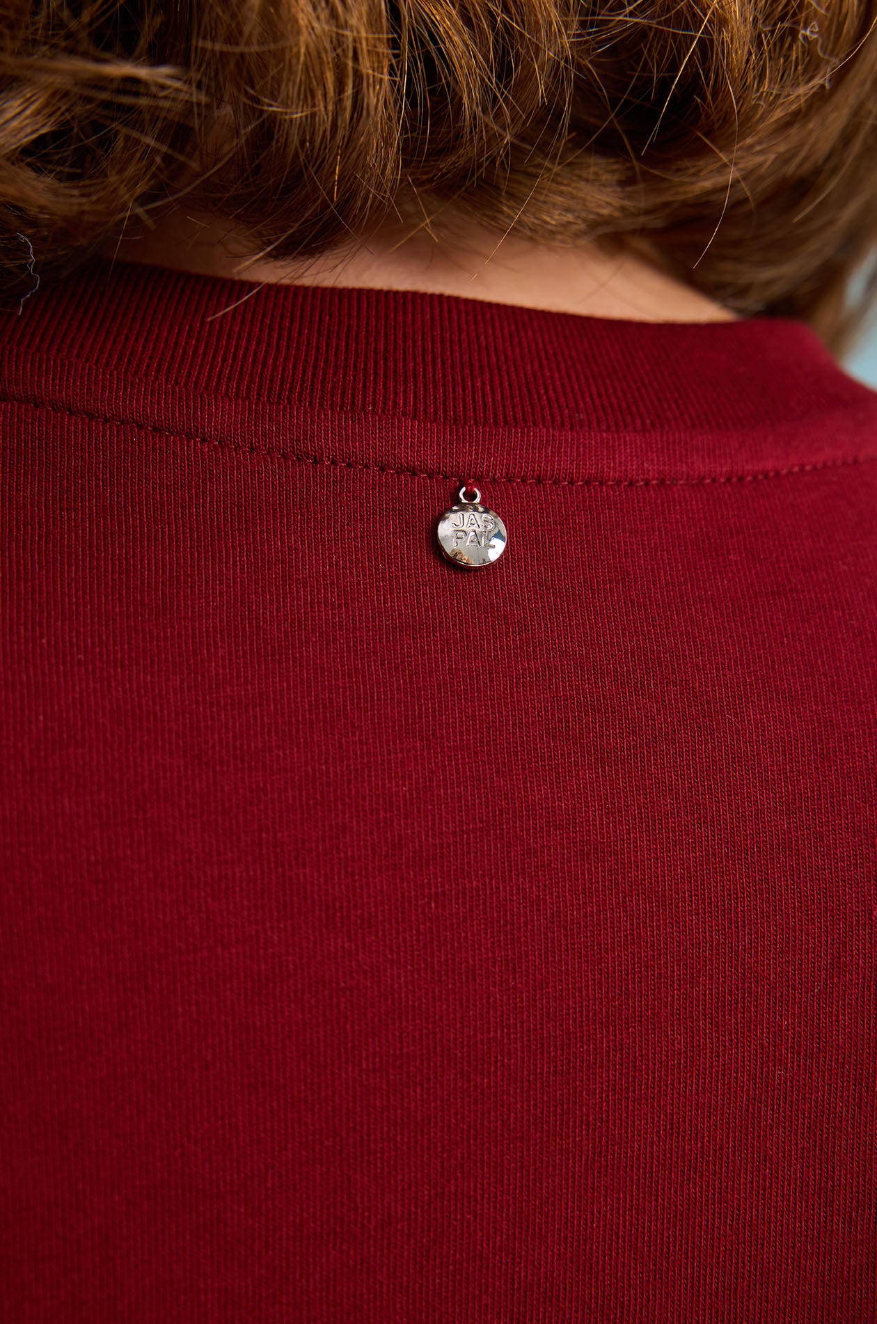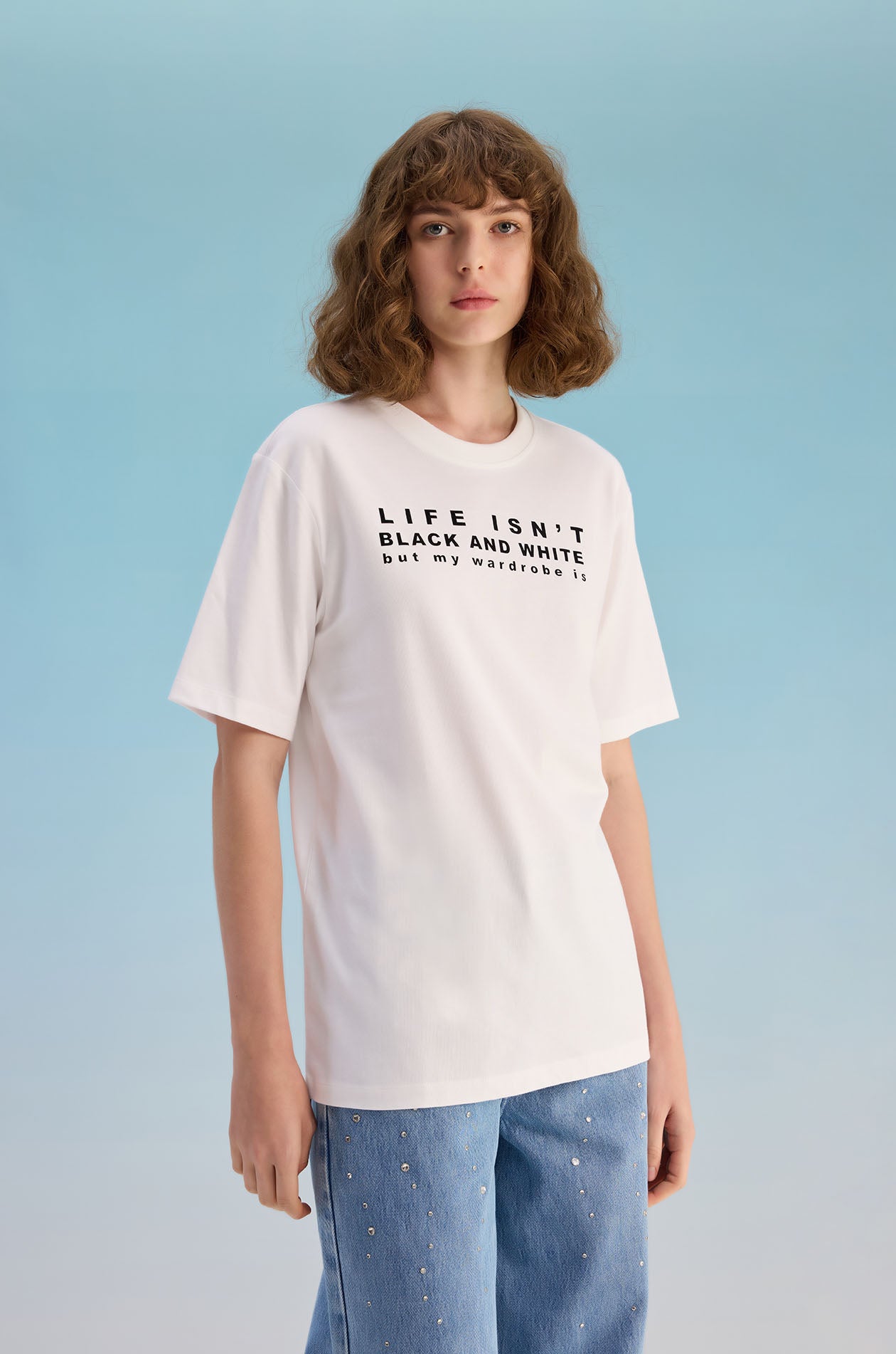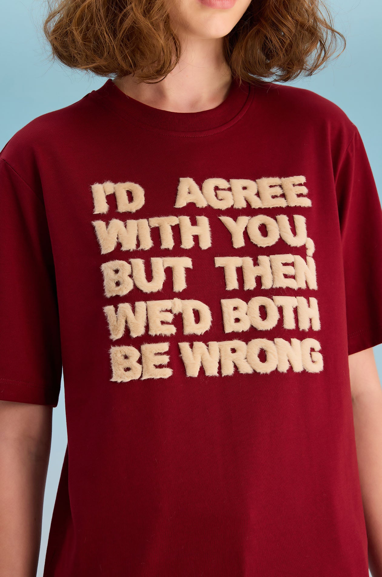 Short-sleeved T-shirt in jersey. Relax fit with round neck and quote at the front. Available in white, navy, and dark red.