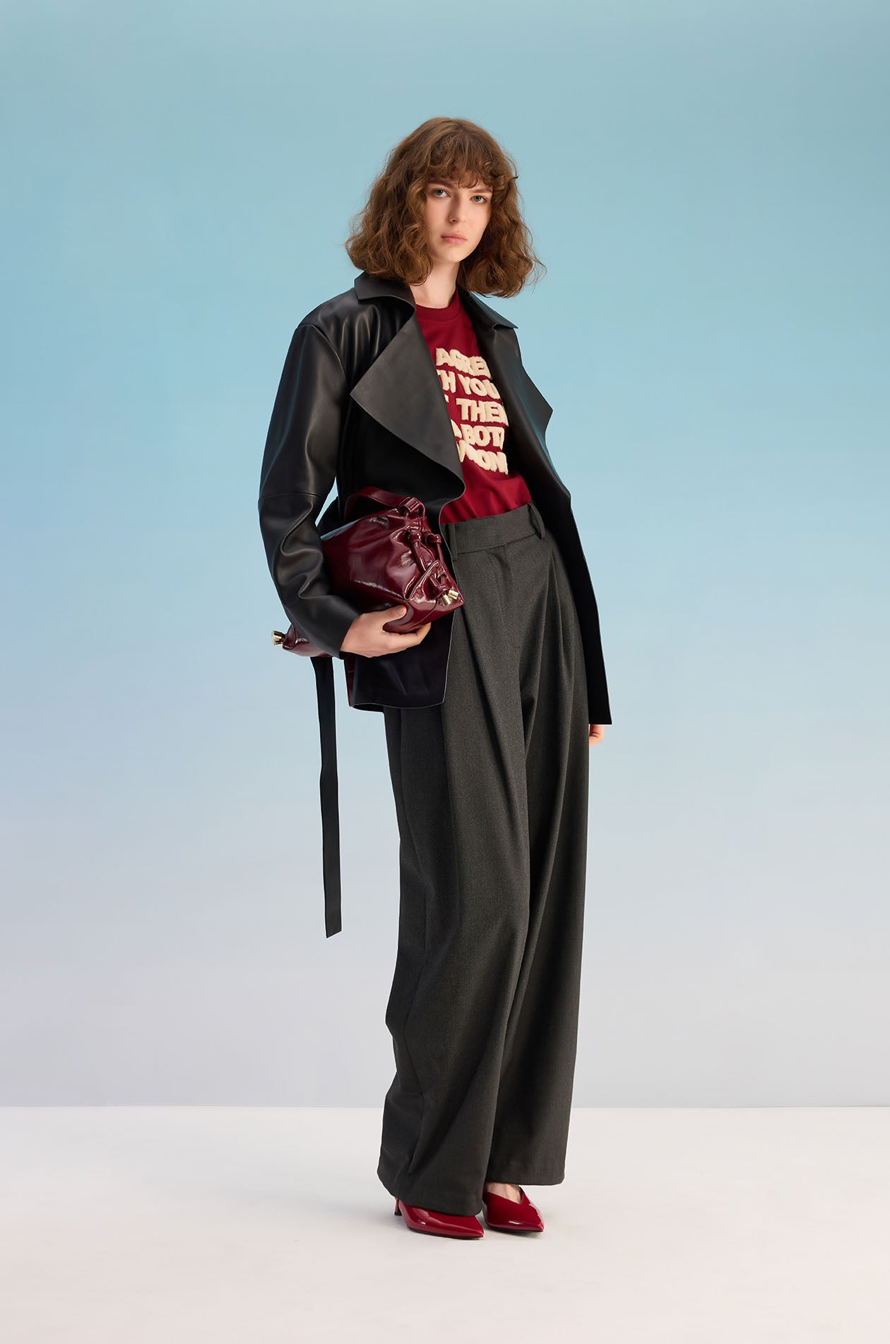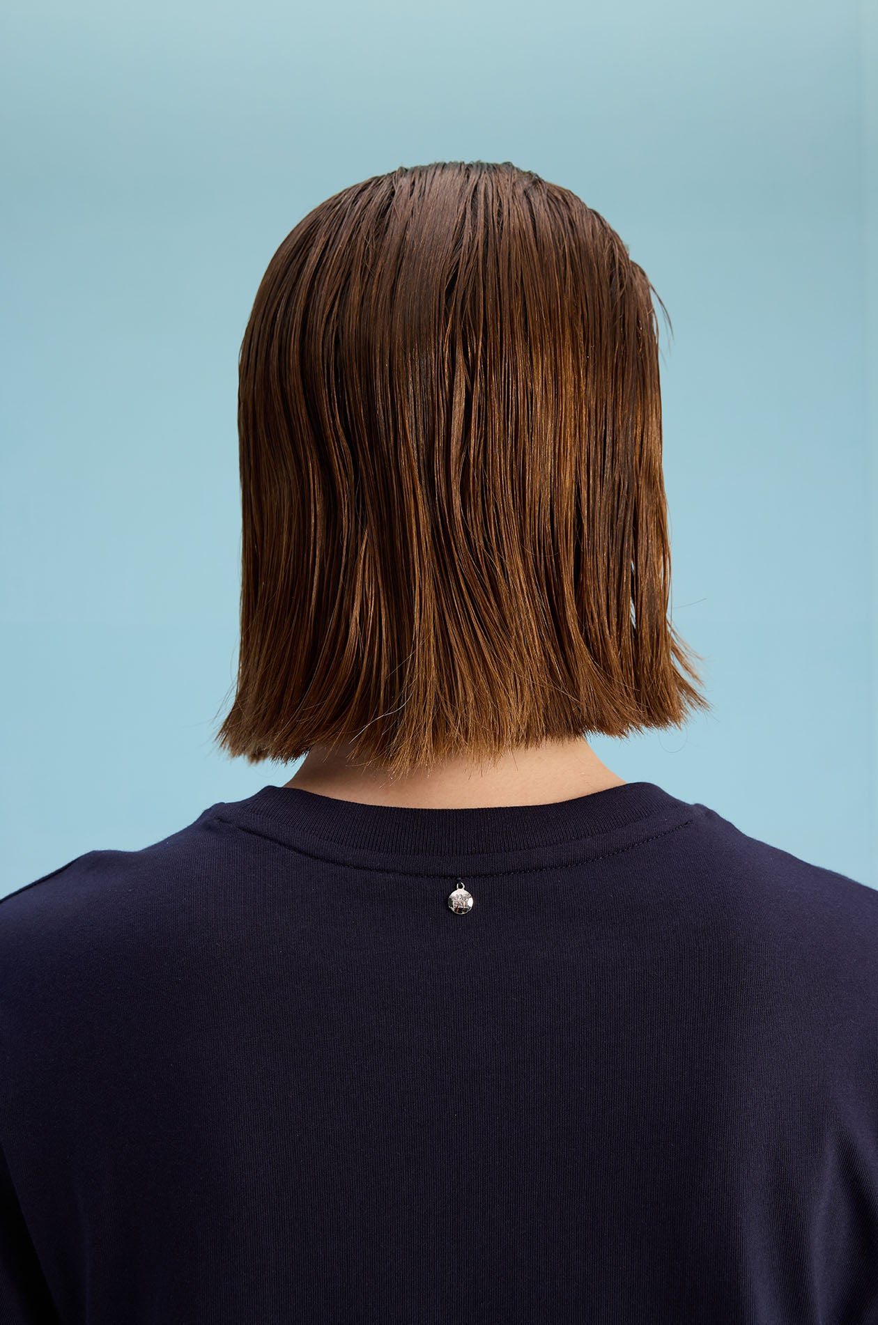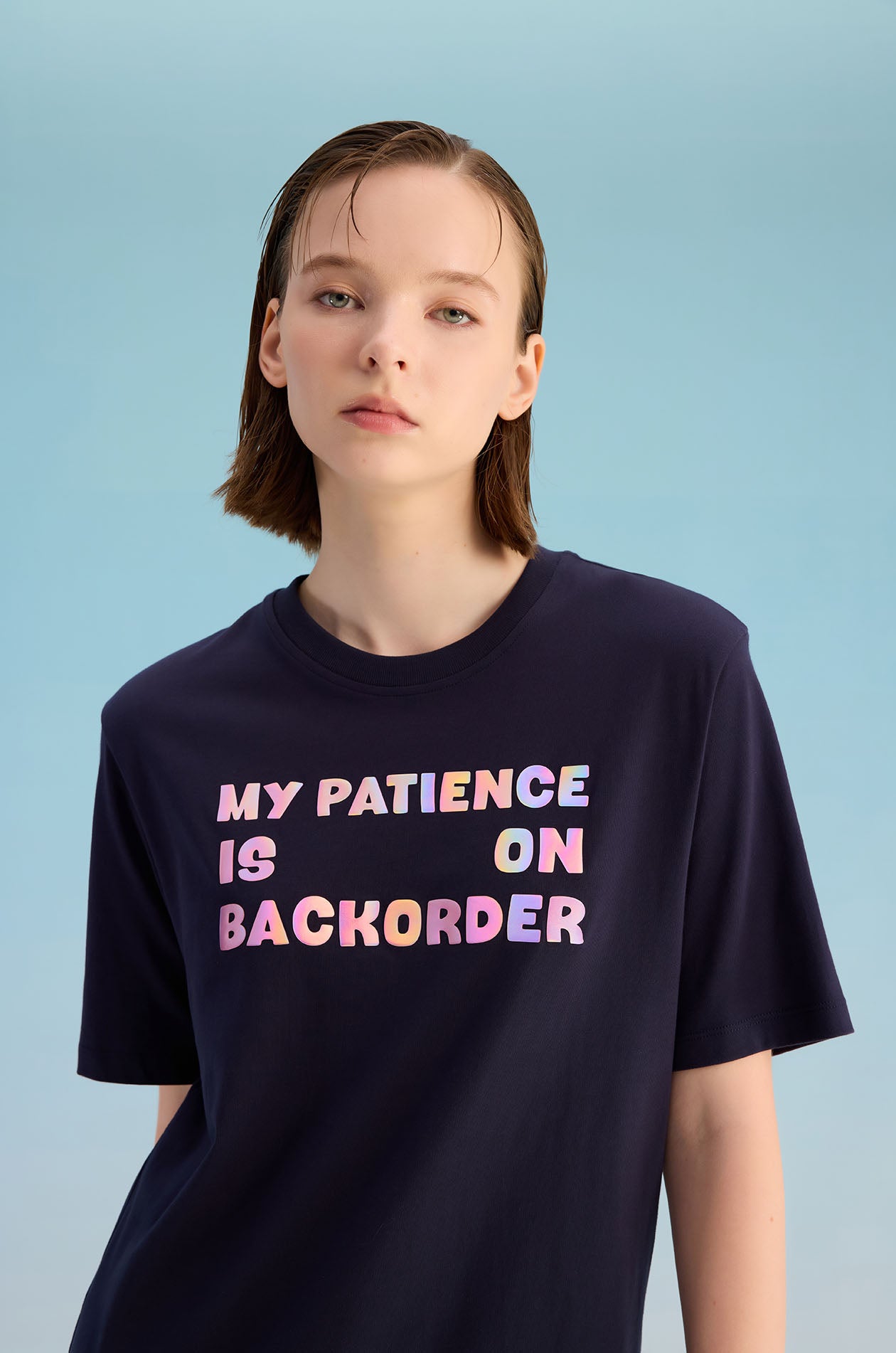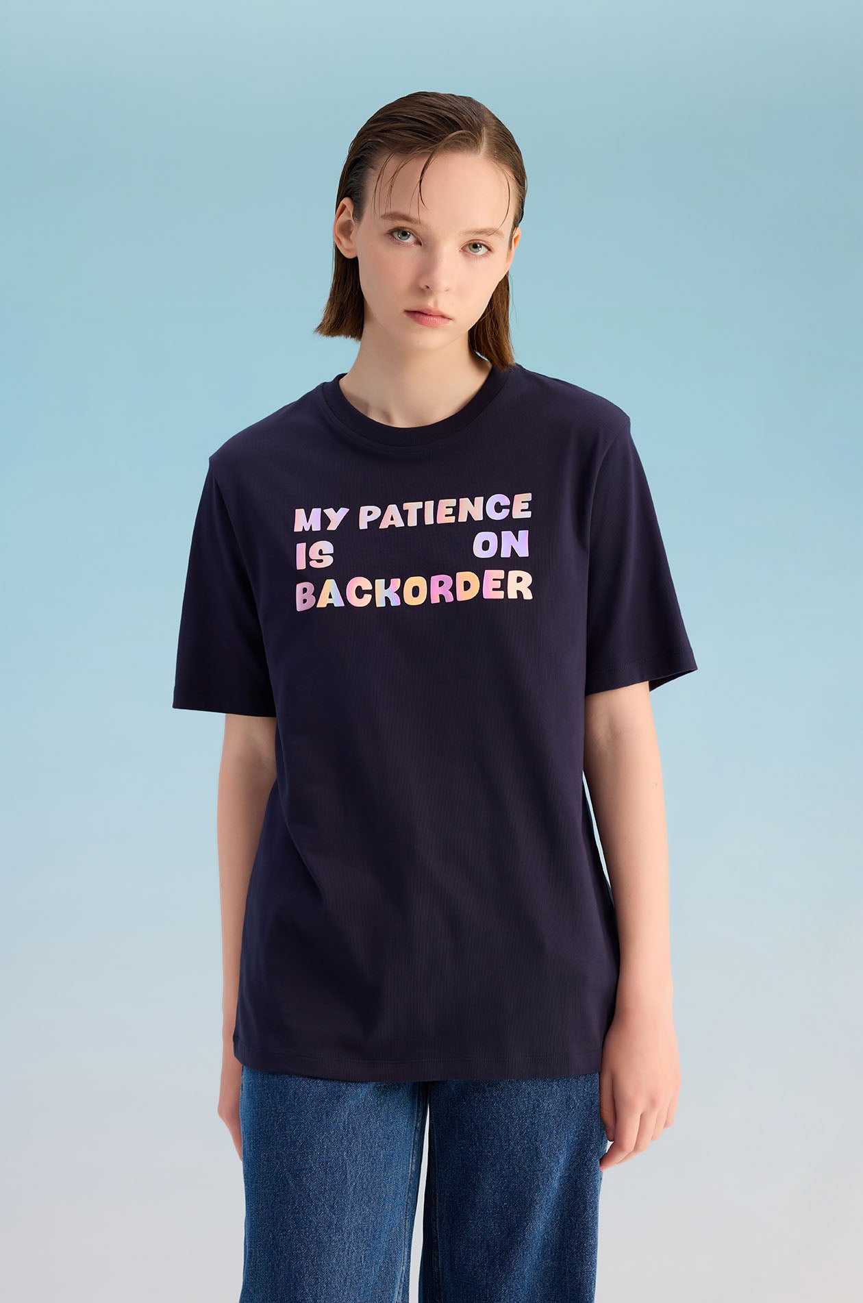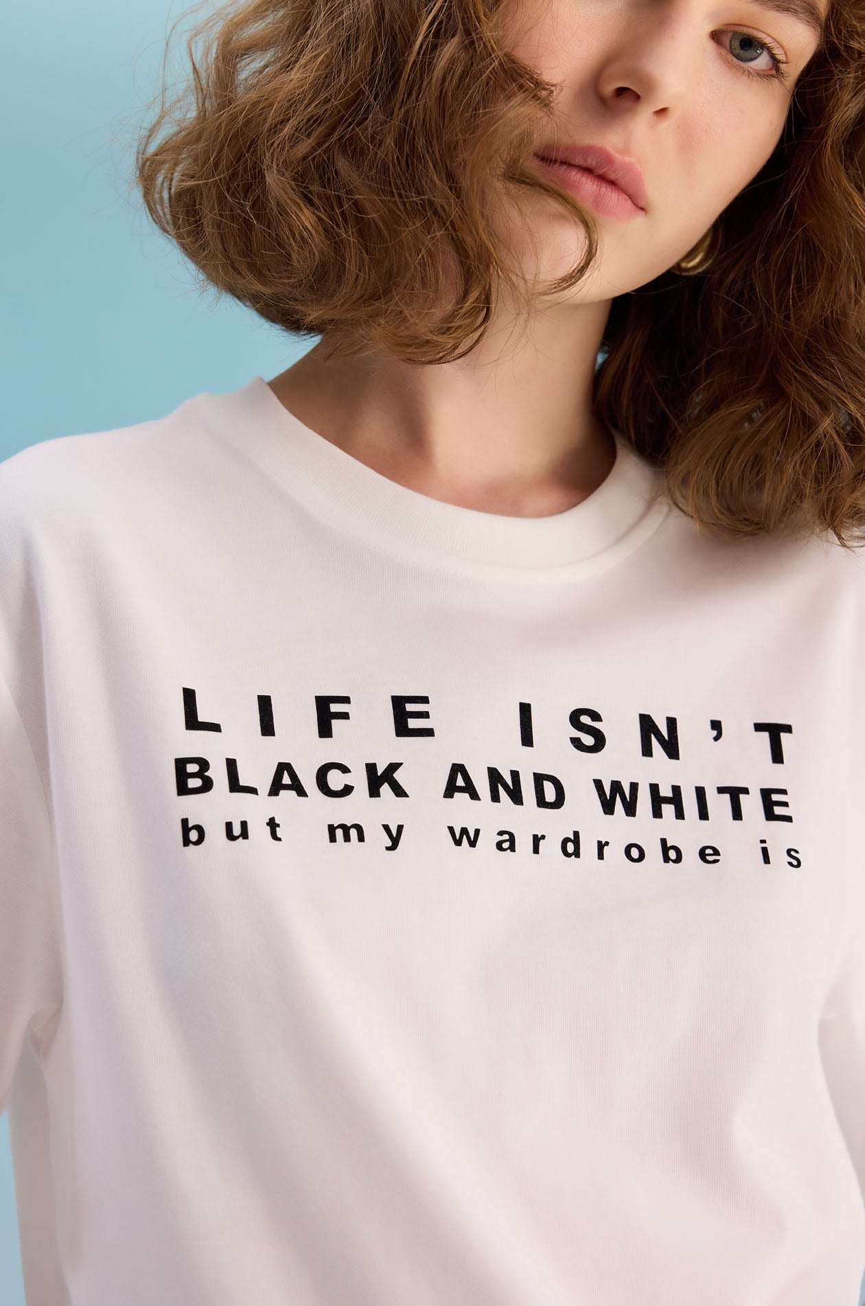 Short-sleeved T-shirt in jersey. Relax fit with round neck and quote at the front. Available in white, navy, and dark red.