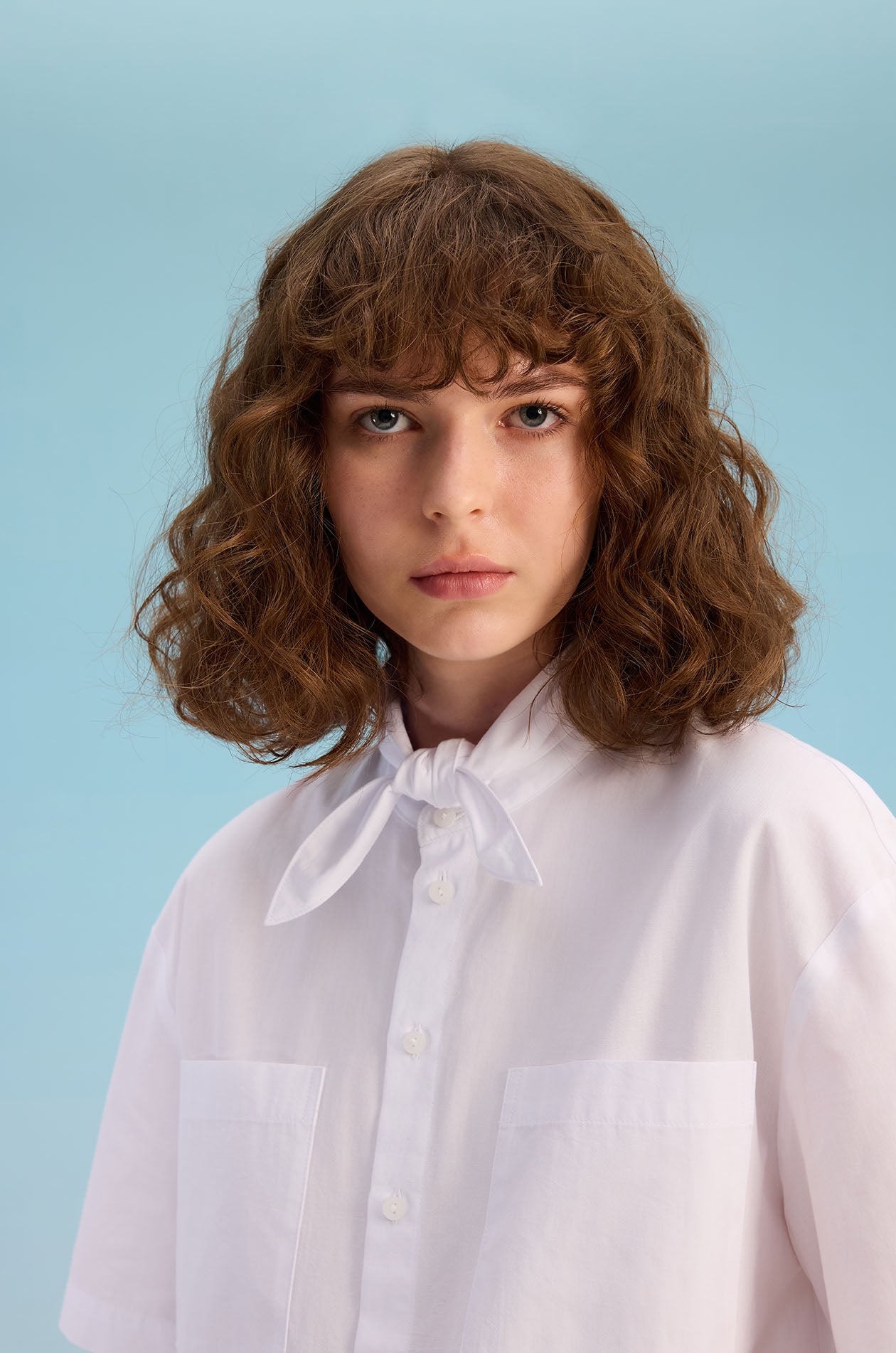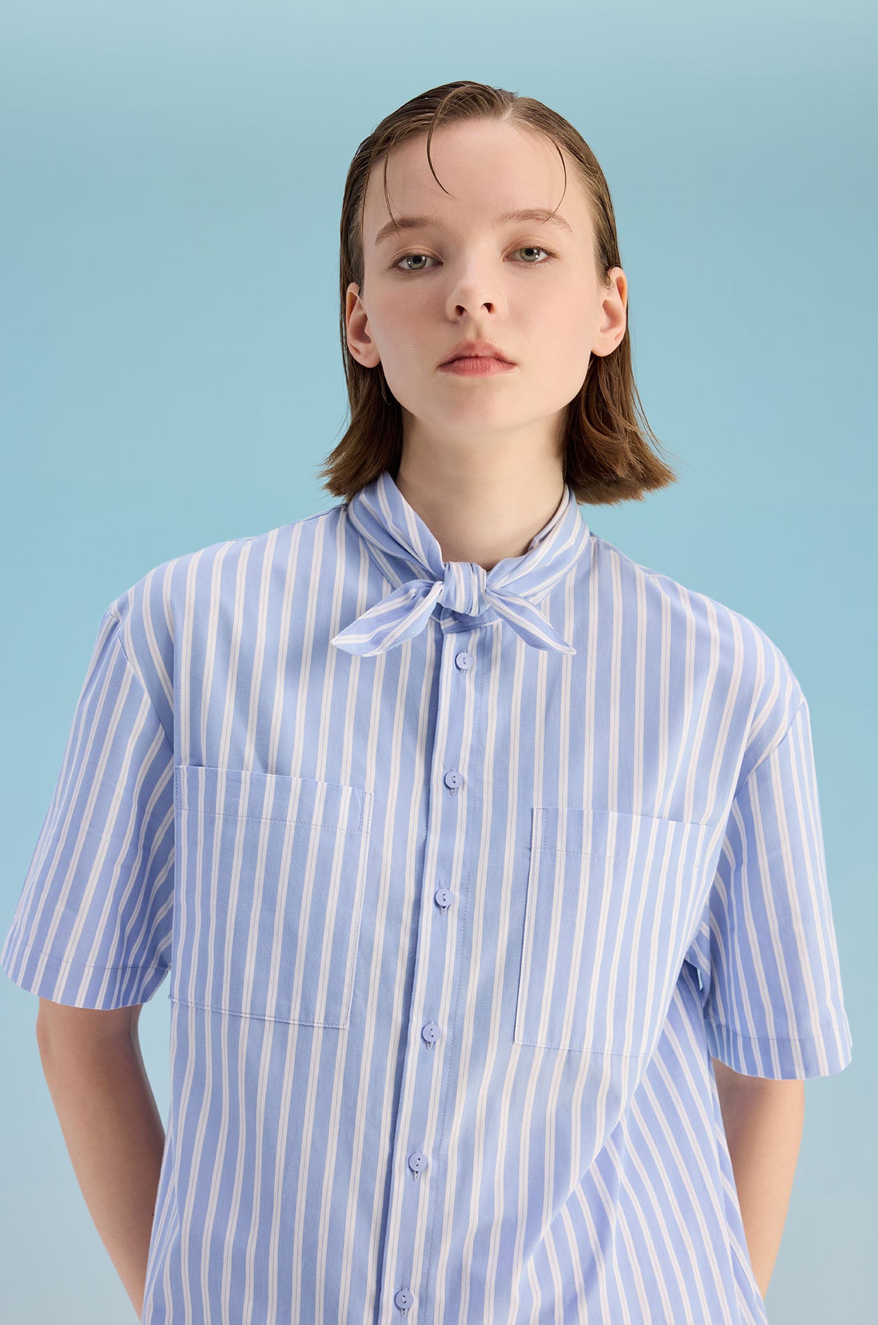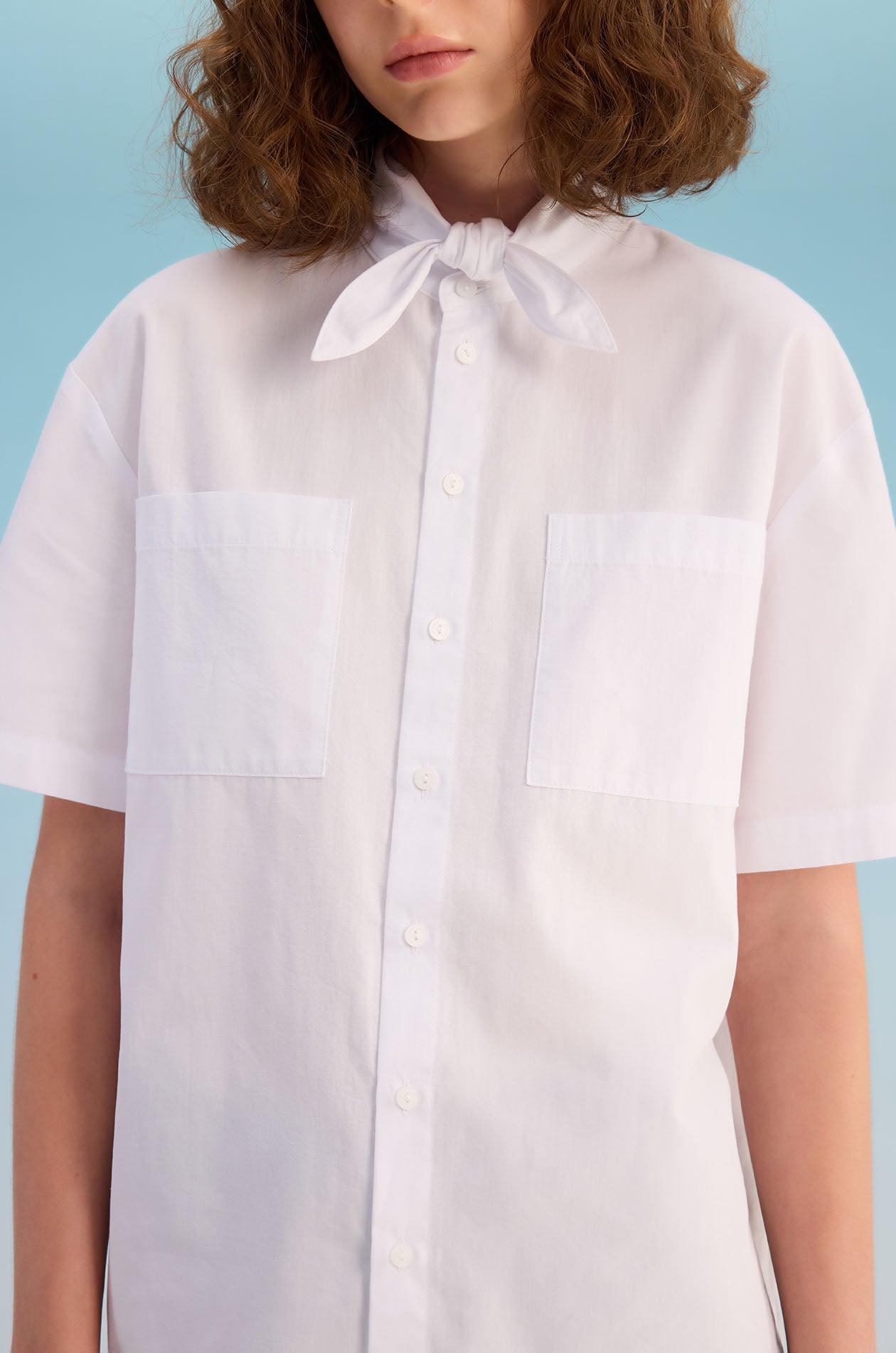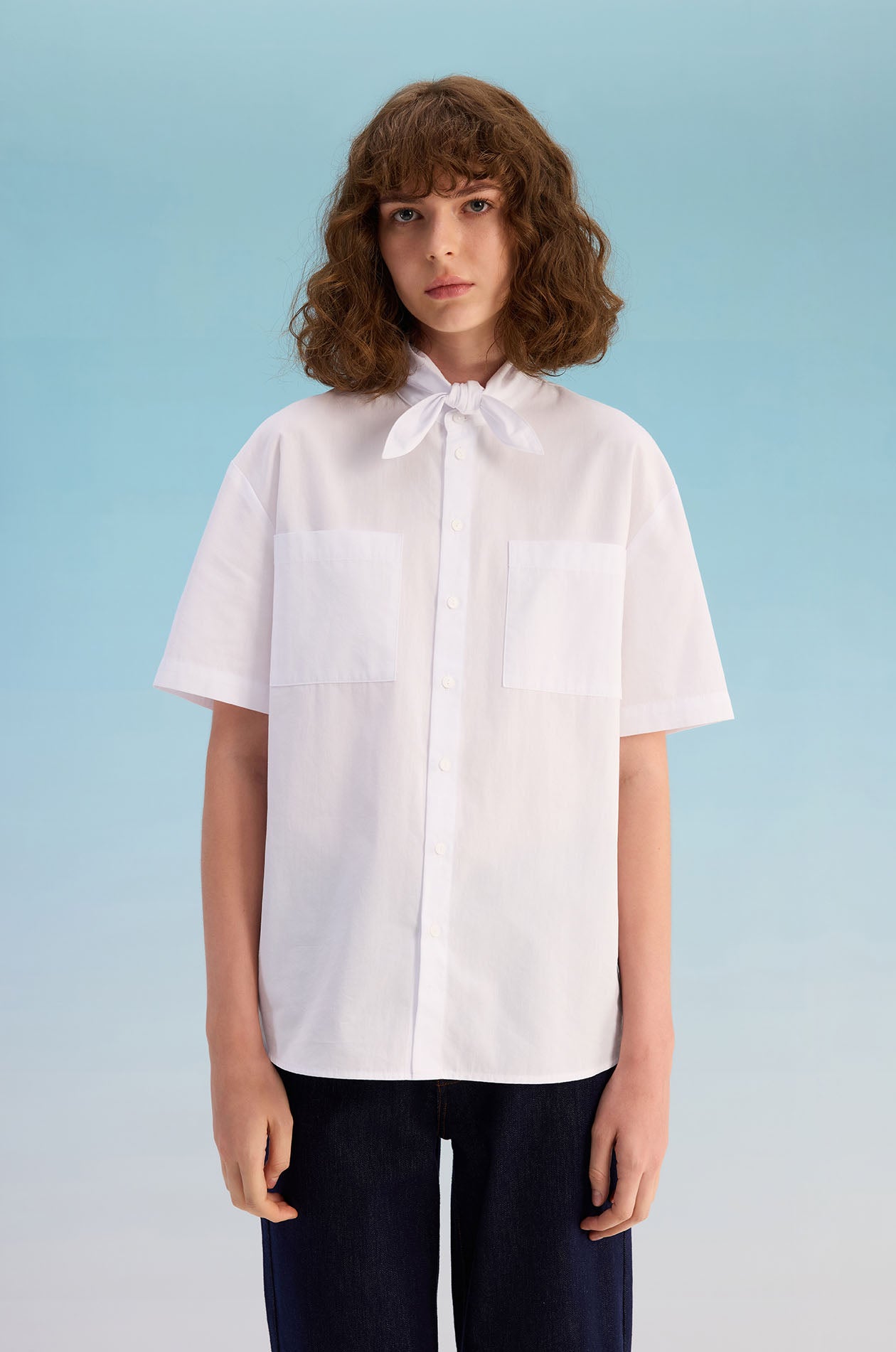 Short-sleeved shirt in poplin. Relax fit with scarf collar and chest pockets. Front button closure. Available in white and striped blue.