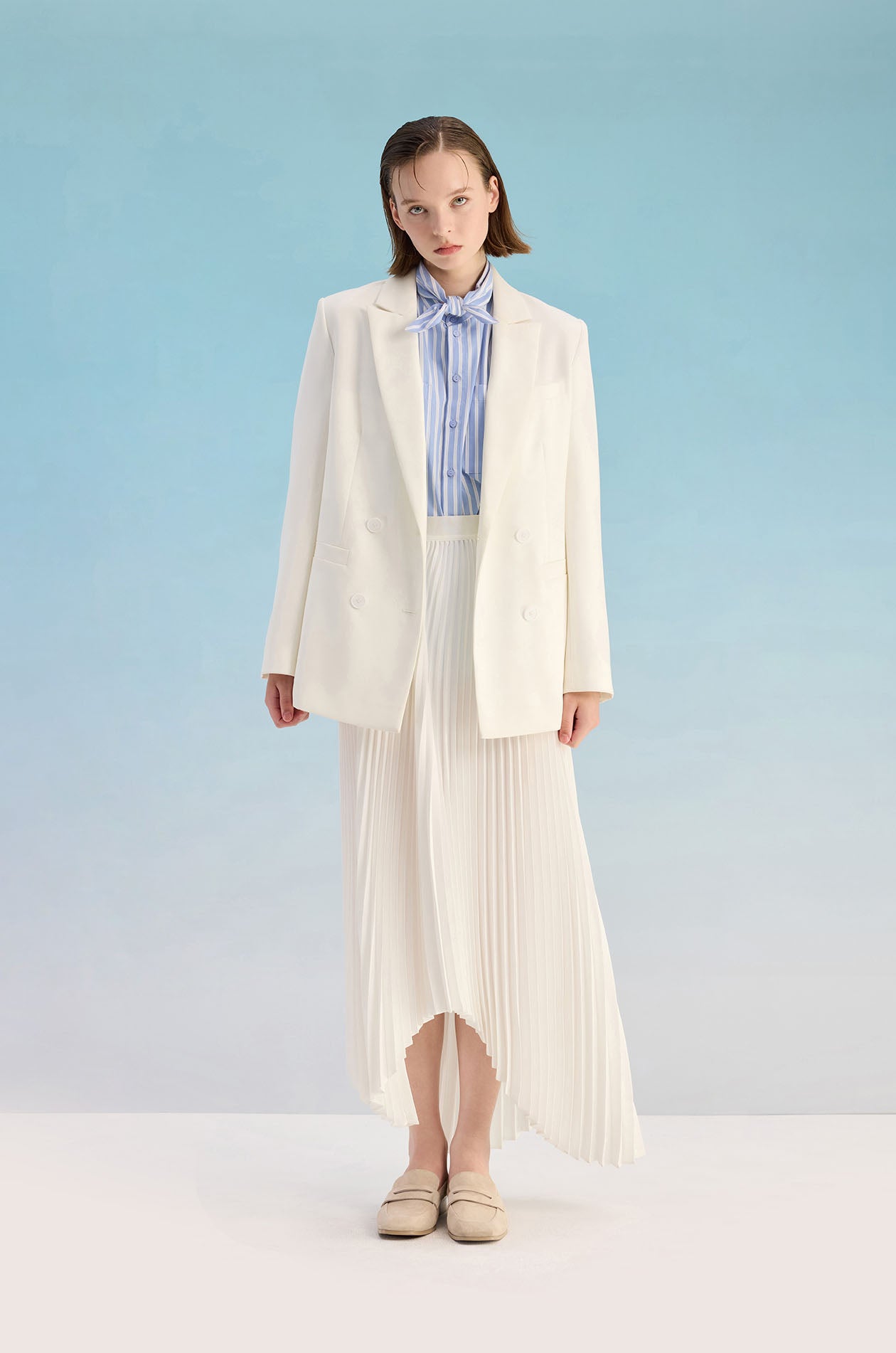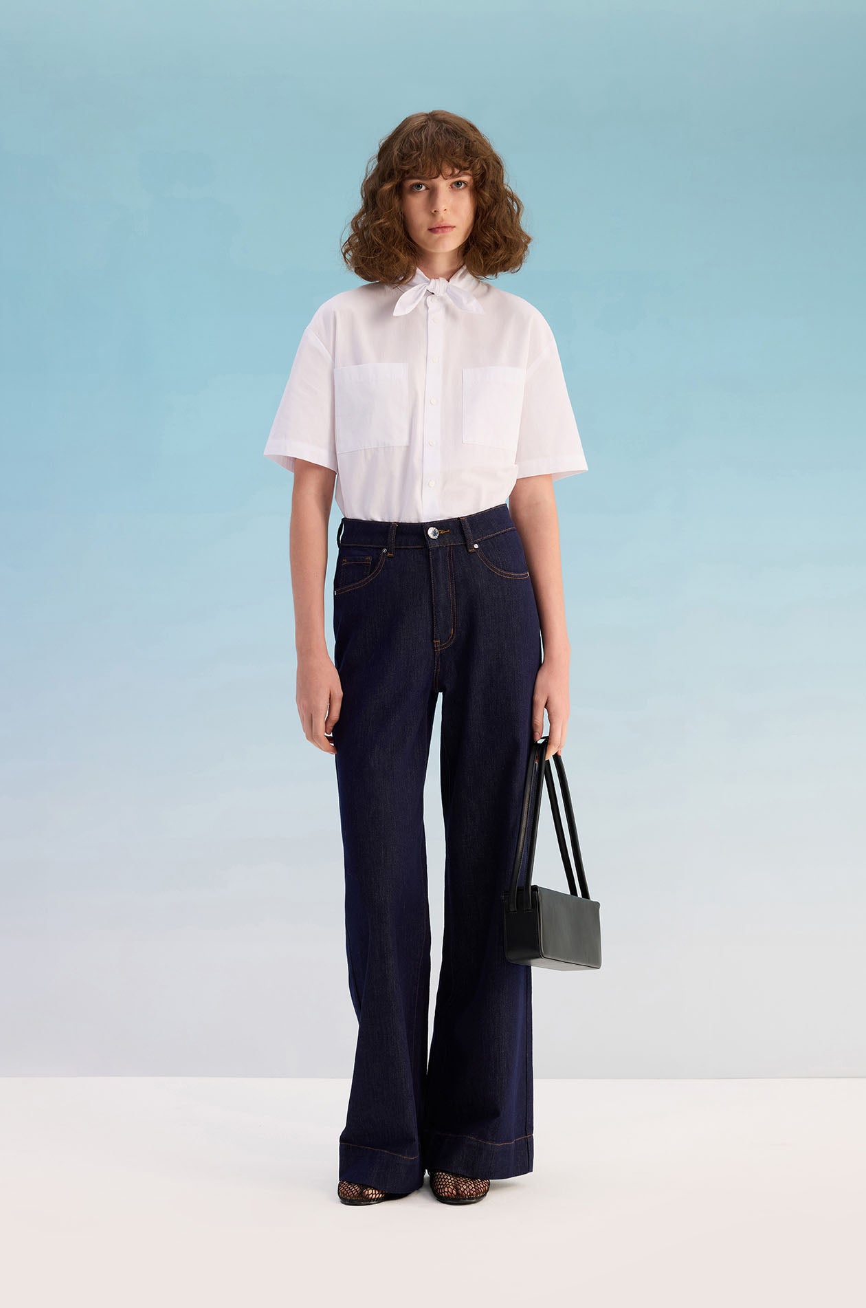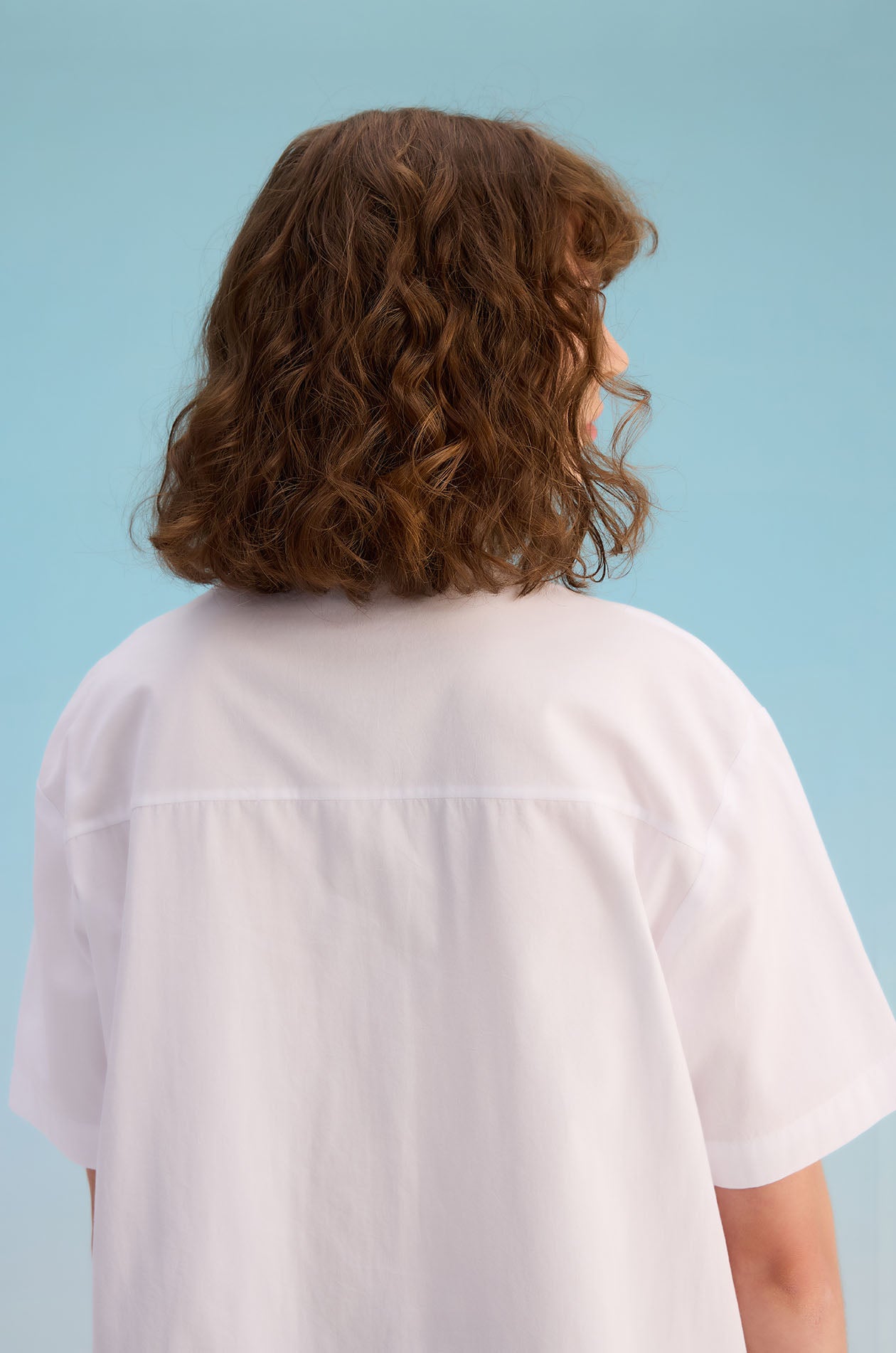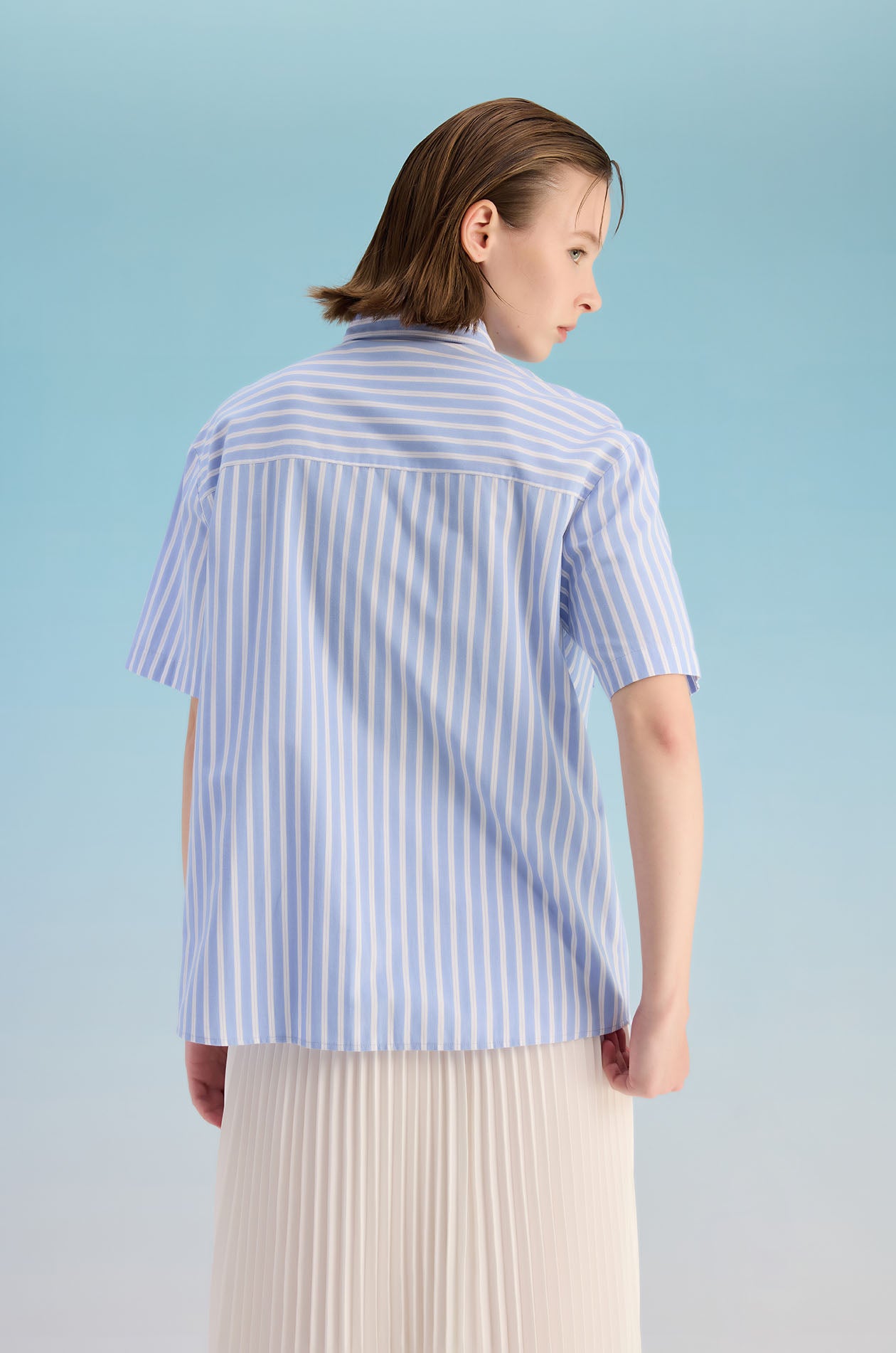 Short-sleeved shirt in poplin. Relax fit with scarf collar and chest pockets. Front button closure. Available in white and striped blue.