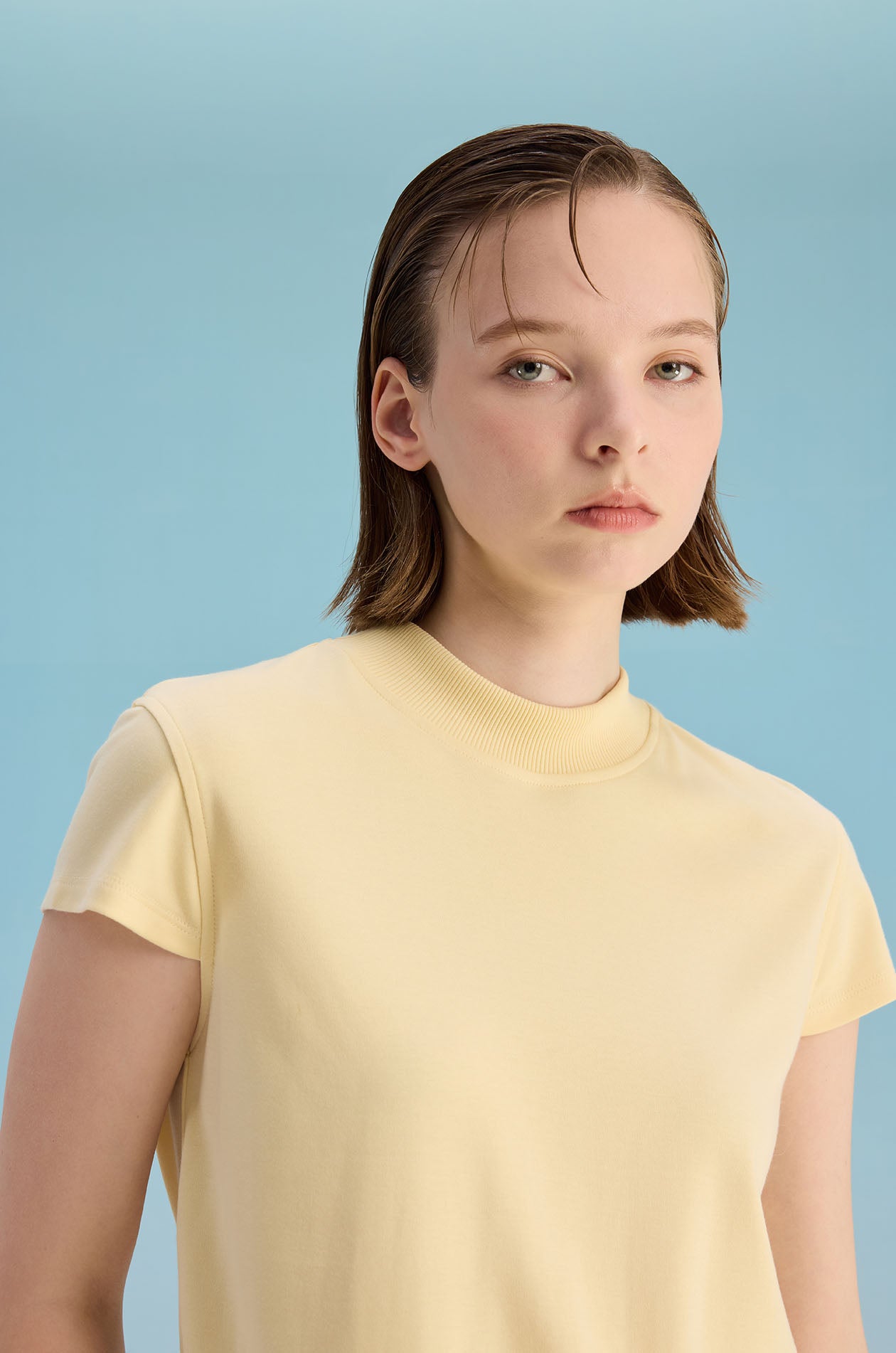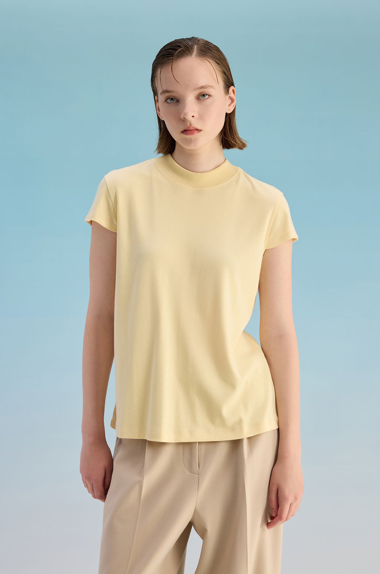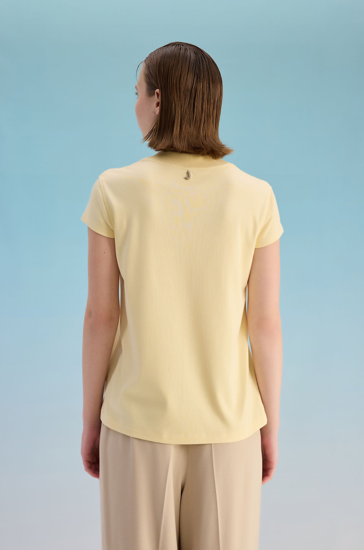 Cap-sleeved T-shirt in soft jersey. Regular fit with ribbed mock neck and 'J' pendant at the back. Available in yellow and dark brown.