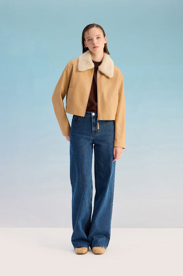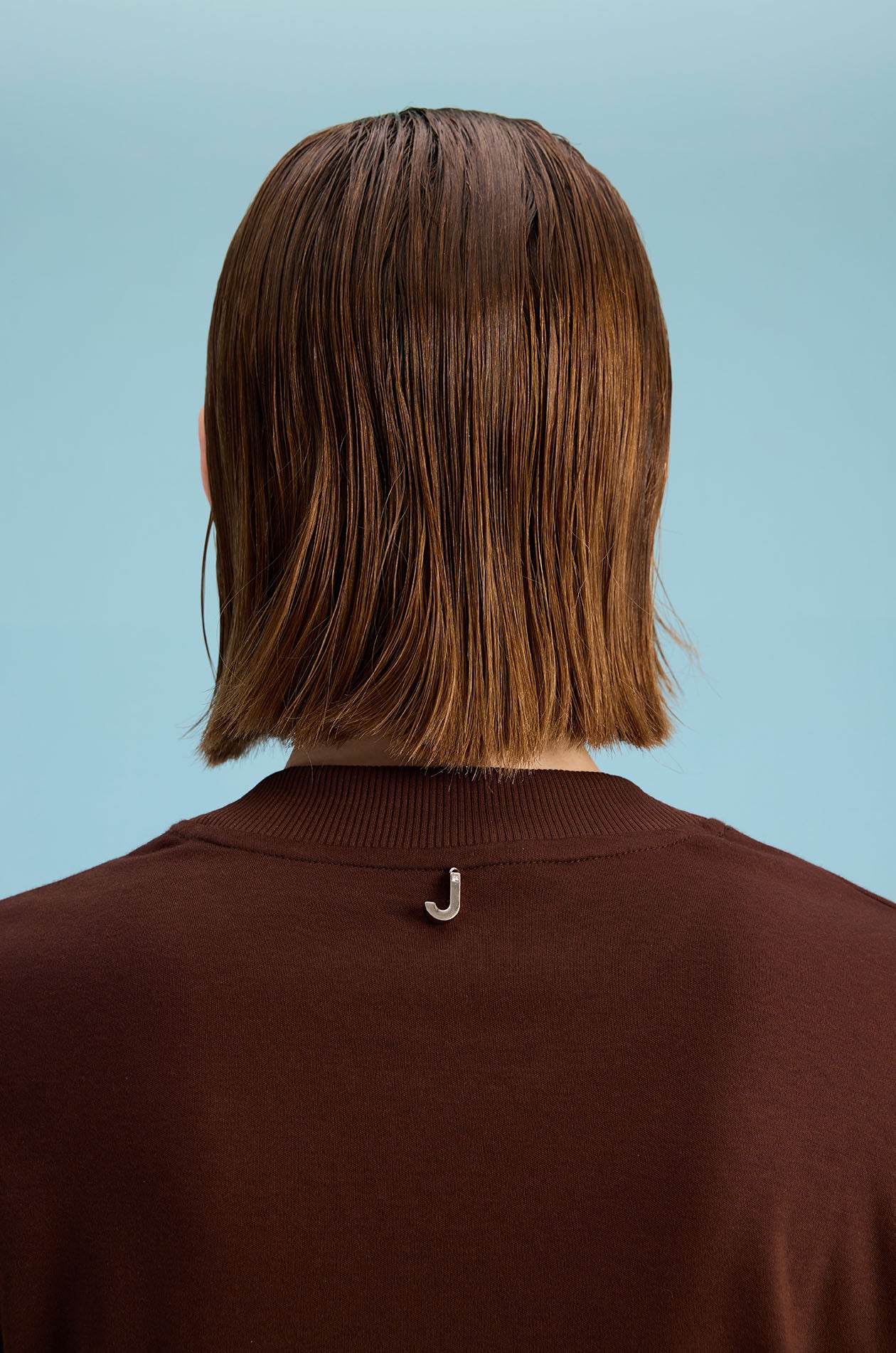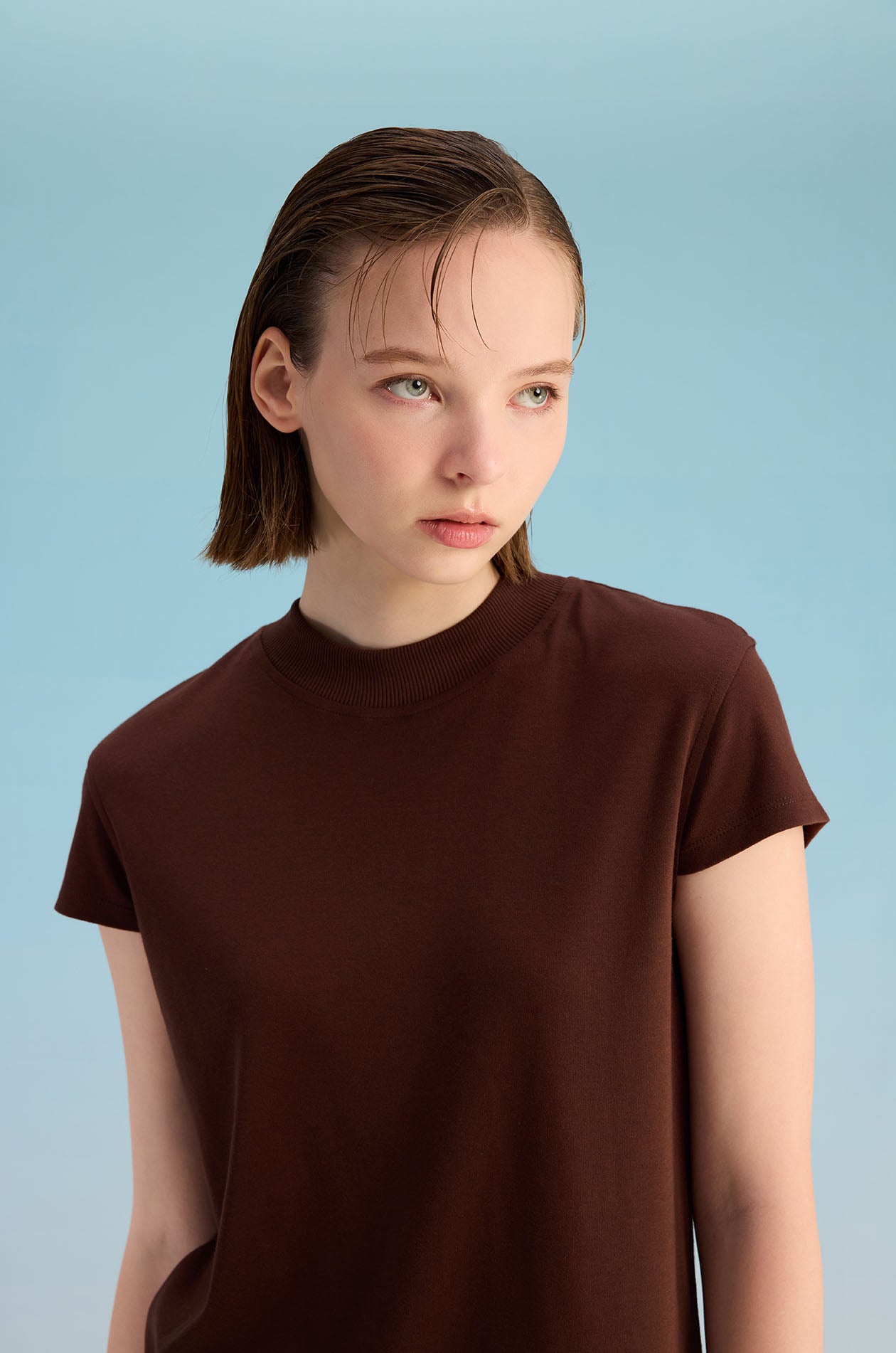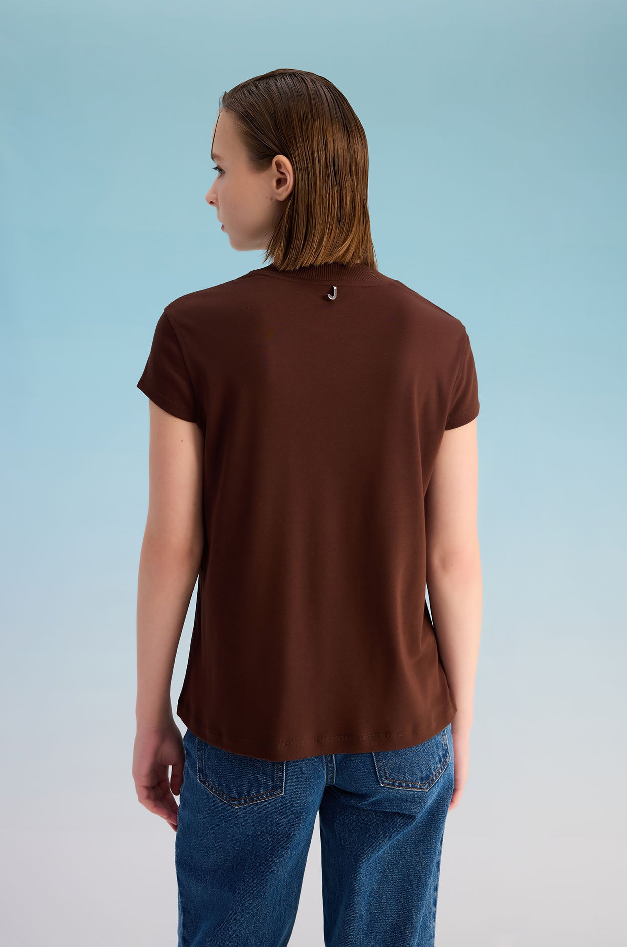 Cap-sleeved T-shirt in soft jersey. Regular fit with ribbed mock neck and 'J' pendant at the back. Available in yellow and dark brown.