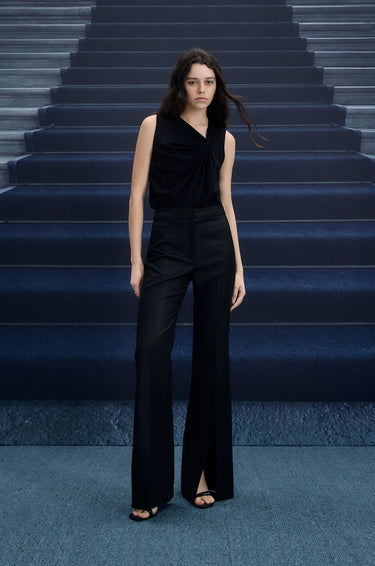 High-rise suit pants in metallic fabric. Flare legs with side pockets and front slit. Front hook and zip closure. Available in black and beige.