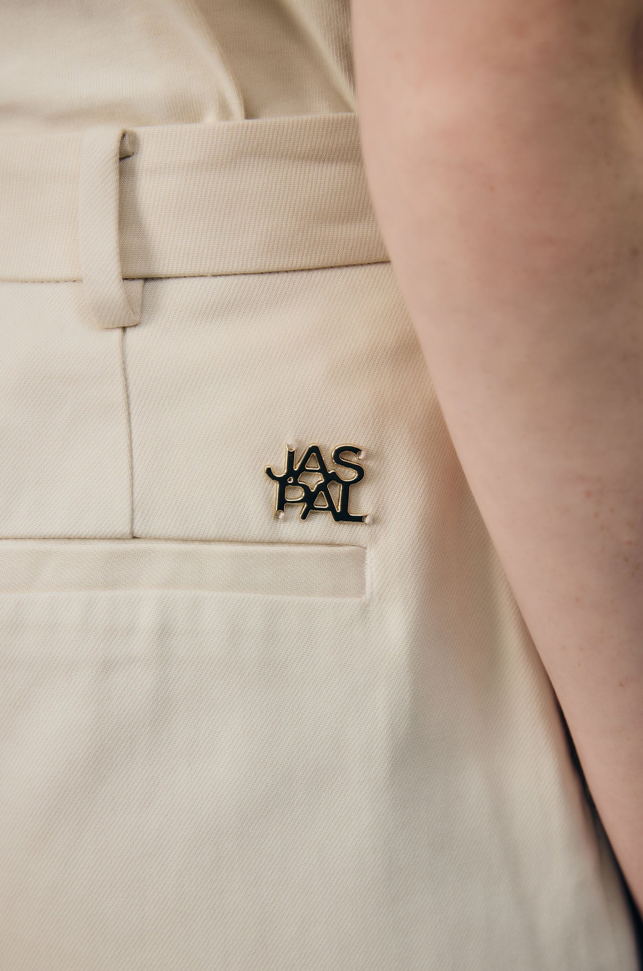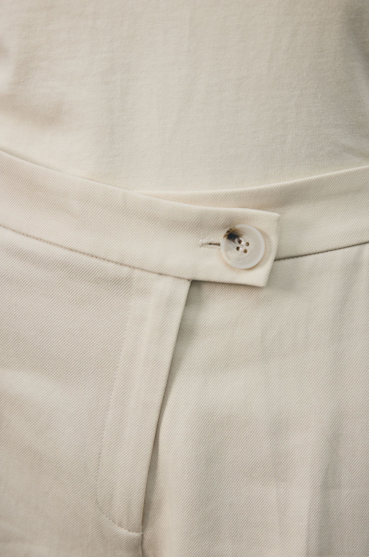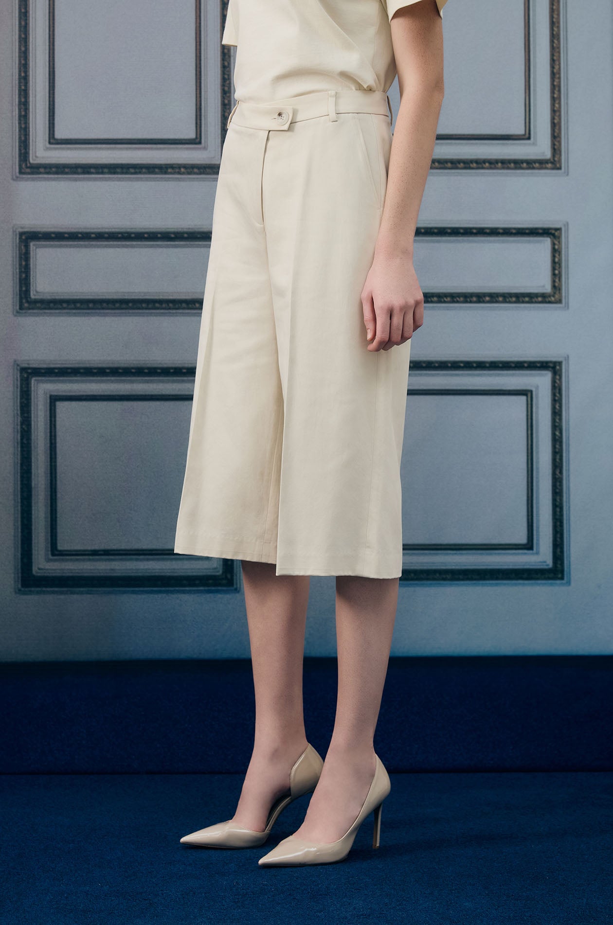 Mid-rise culottes in fine twill. Straight legs with side pockets. Asymmetric waistband. Front button and zip closure. Available in cream.