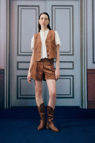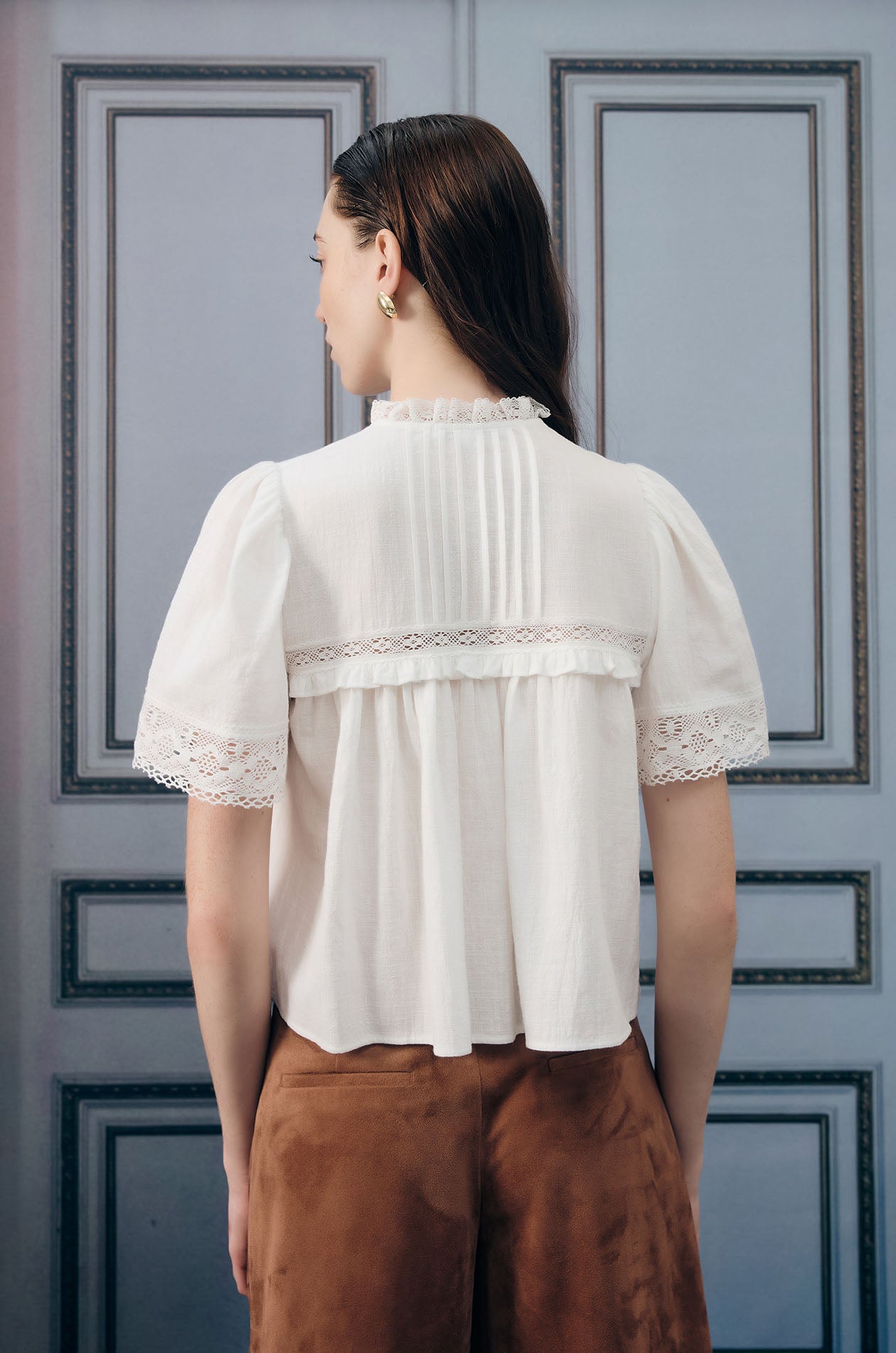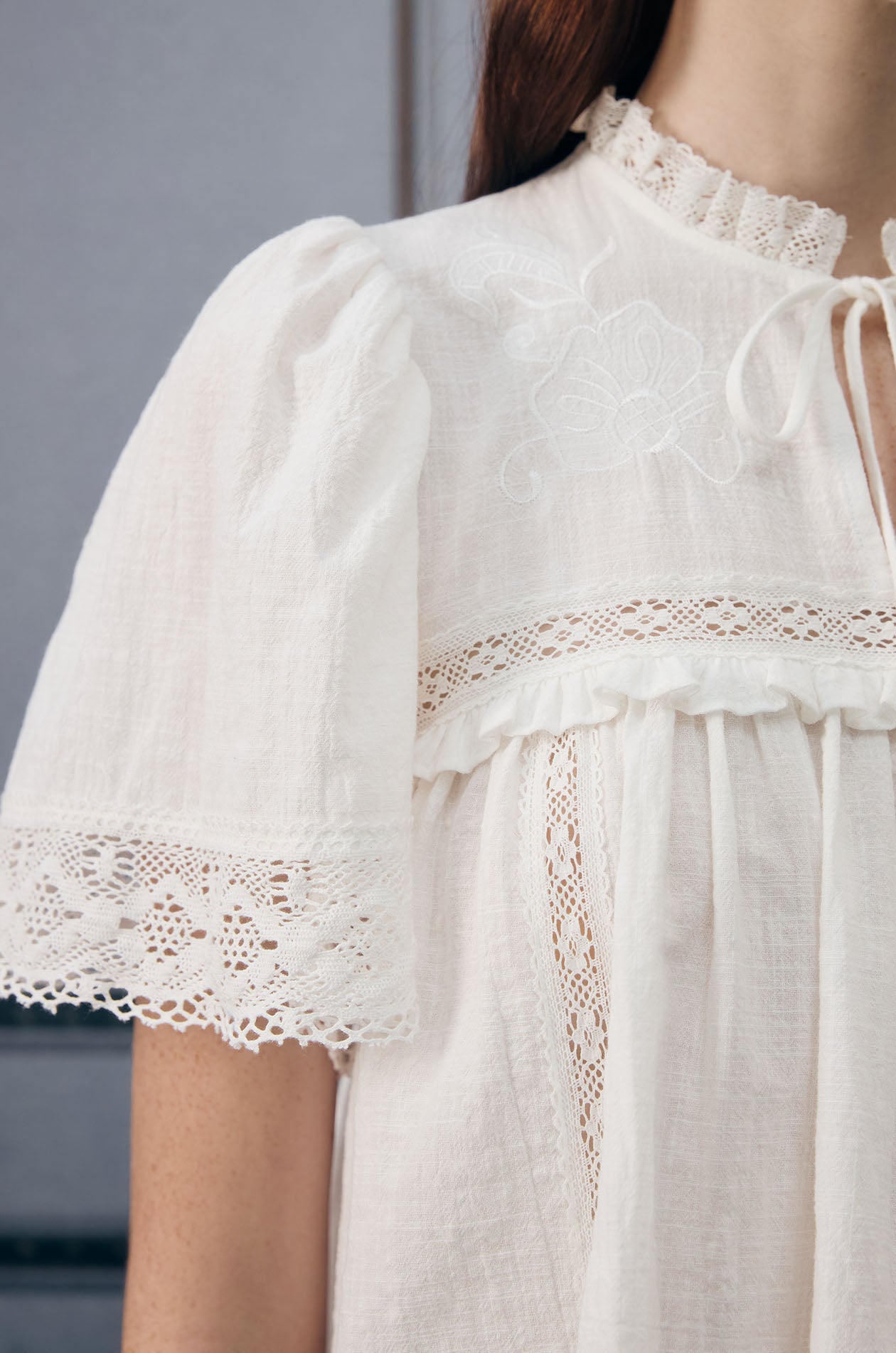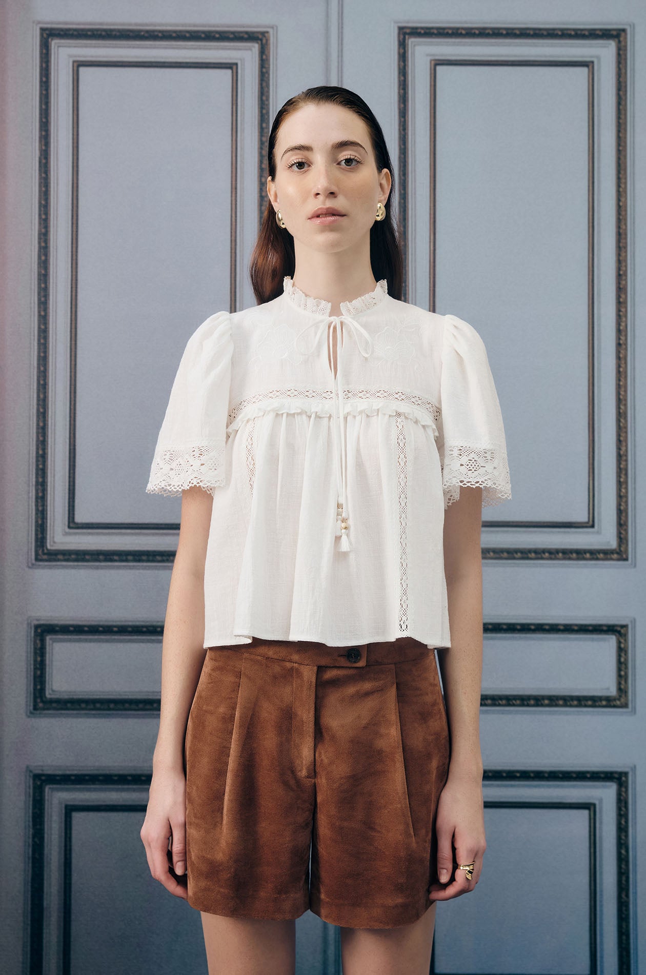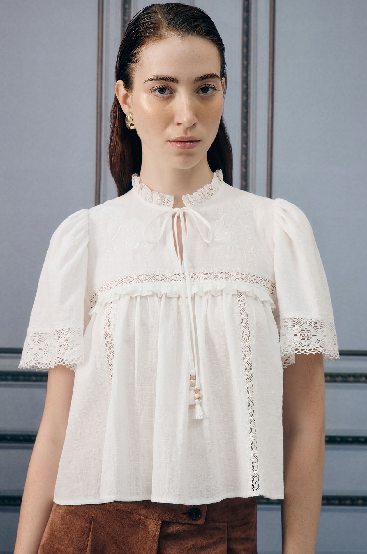 Short-sleeved blouse in lightweight fabric with broderie lace trim. Relaxed fit with bohemian style and floral embroidery at the chests. Tie closure. Available in white.