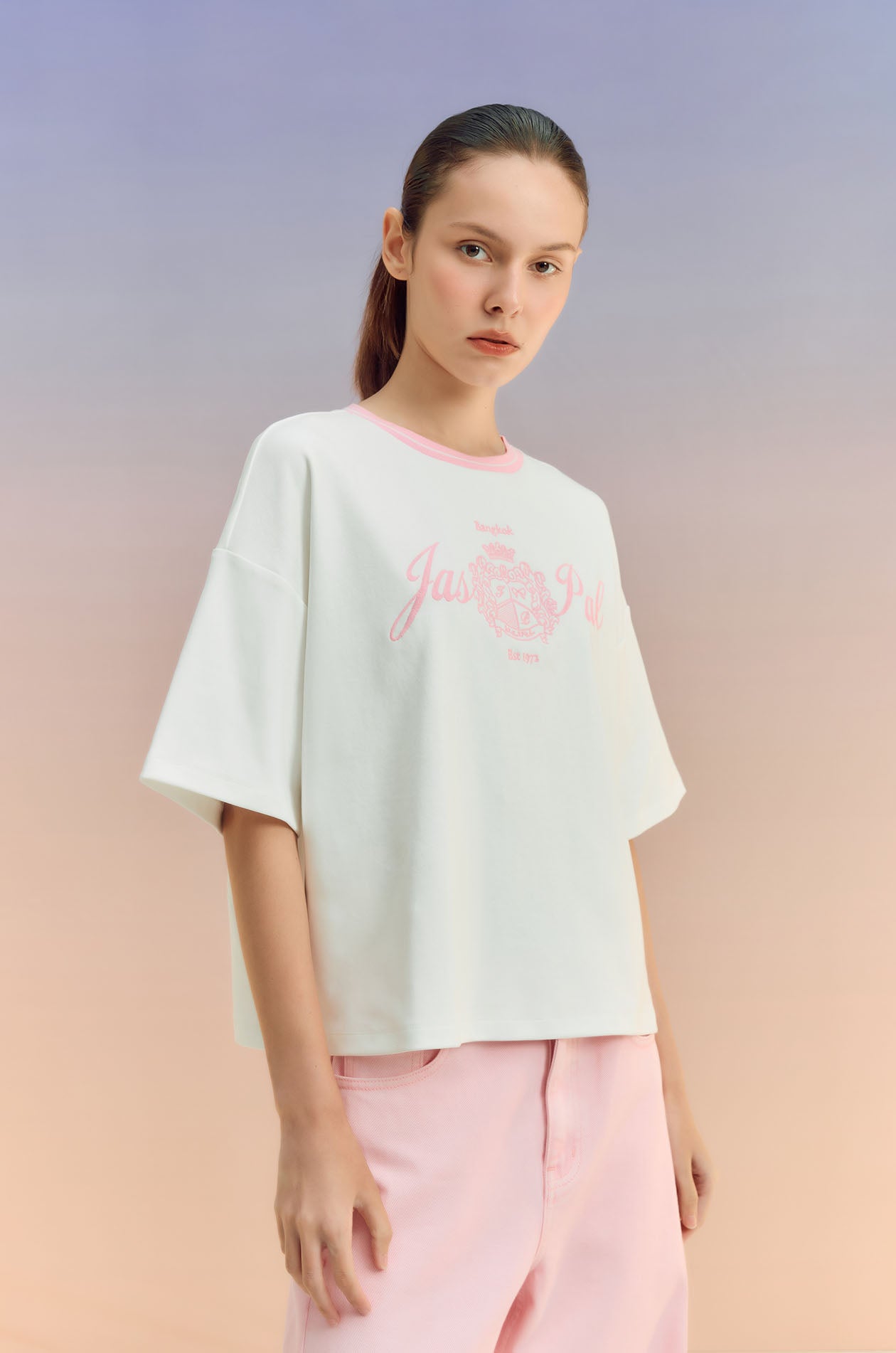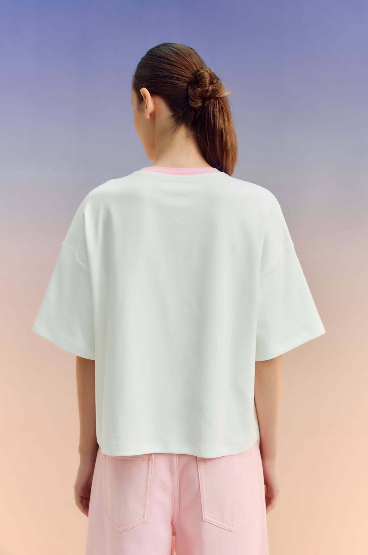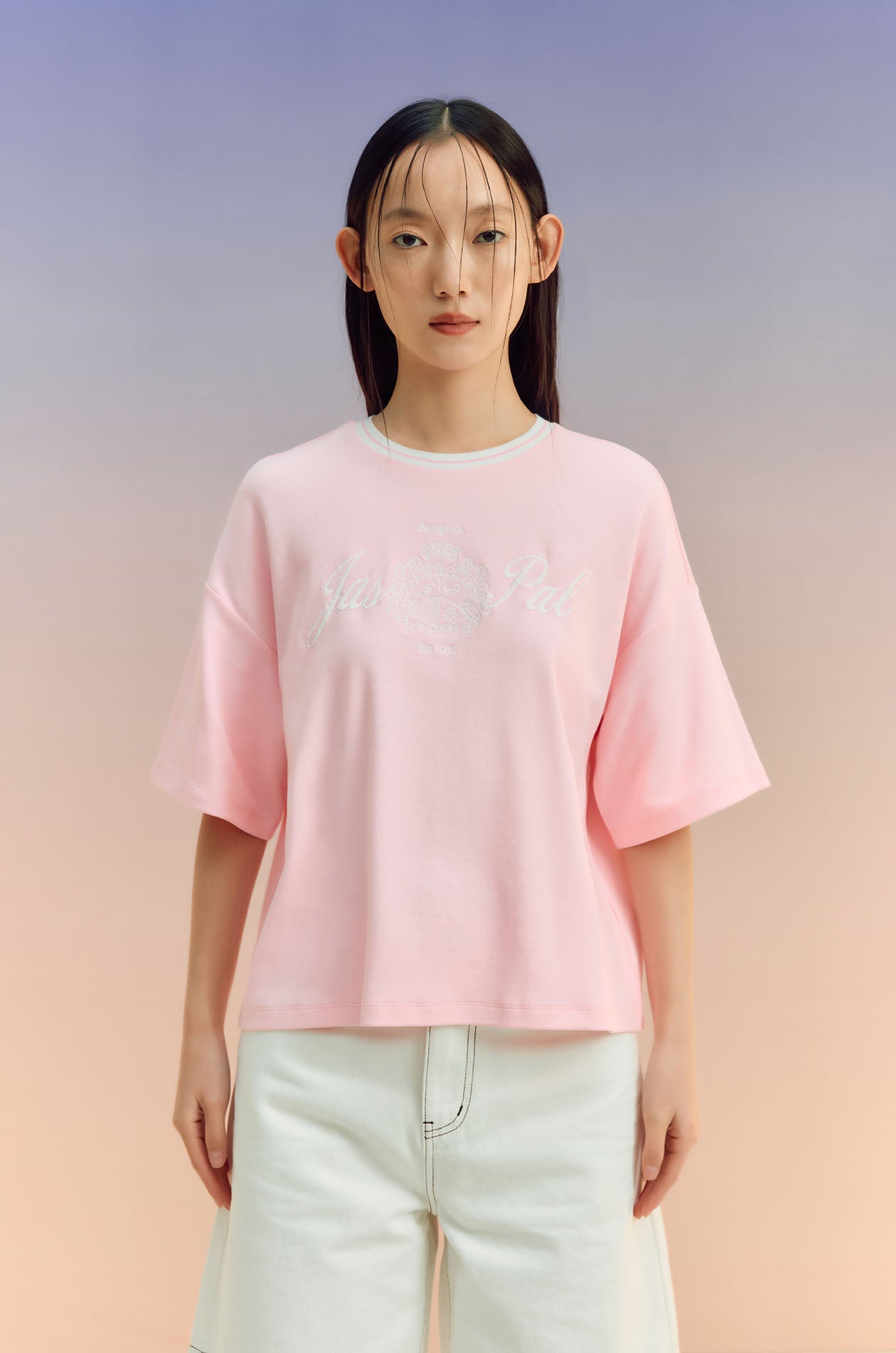 Short-sleeved oversized T-shirt in cotton-blend jersey. Boxy silhouette with round neck and front college-style logo embroidery. Available in pink and off-white.