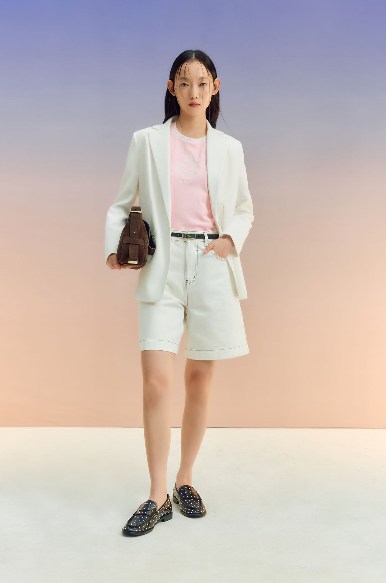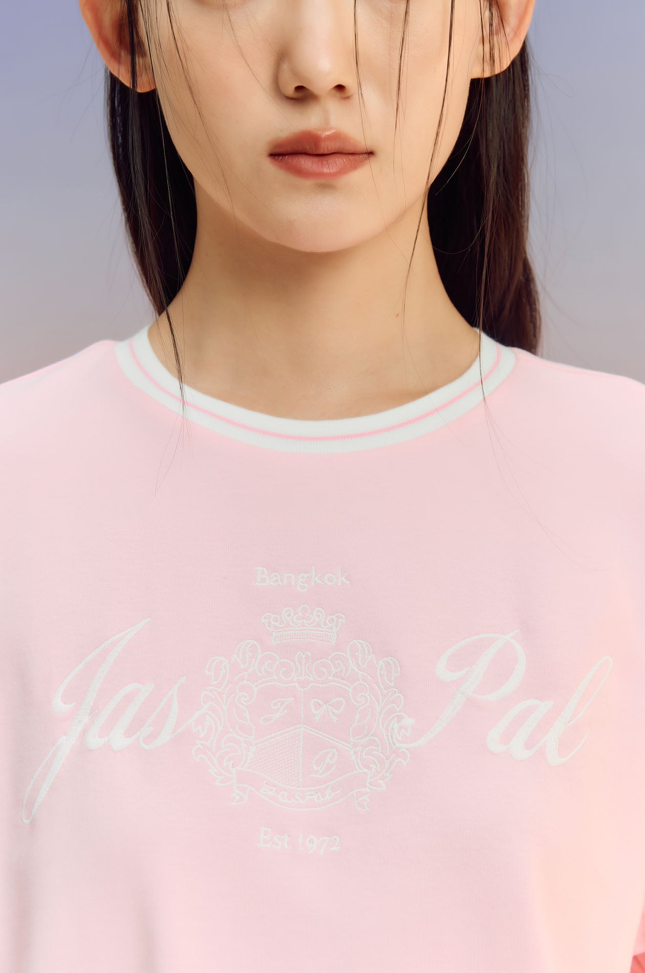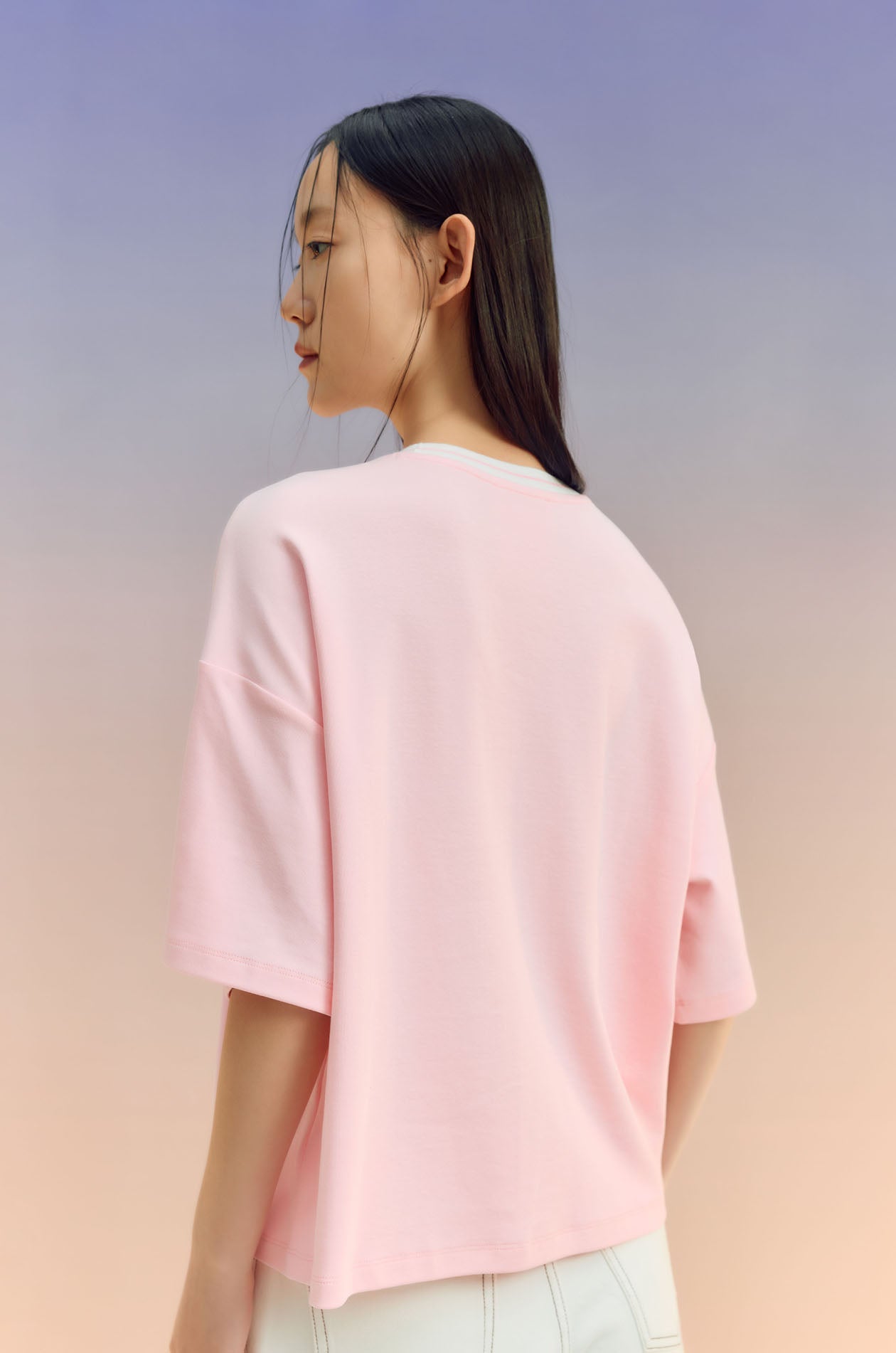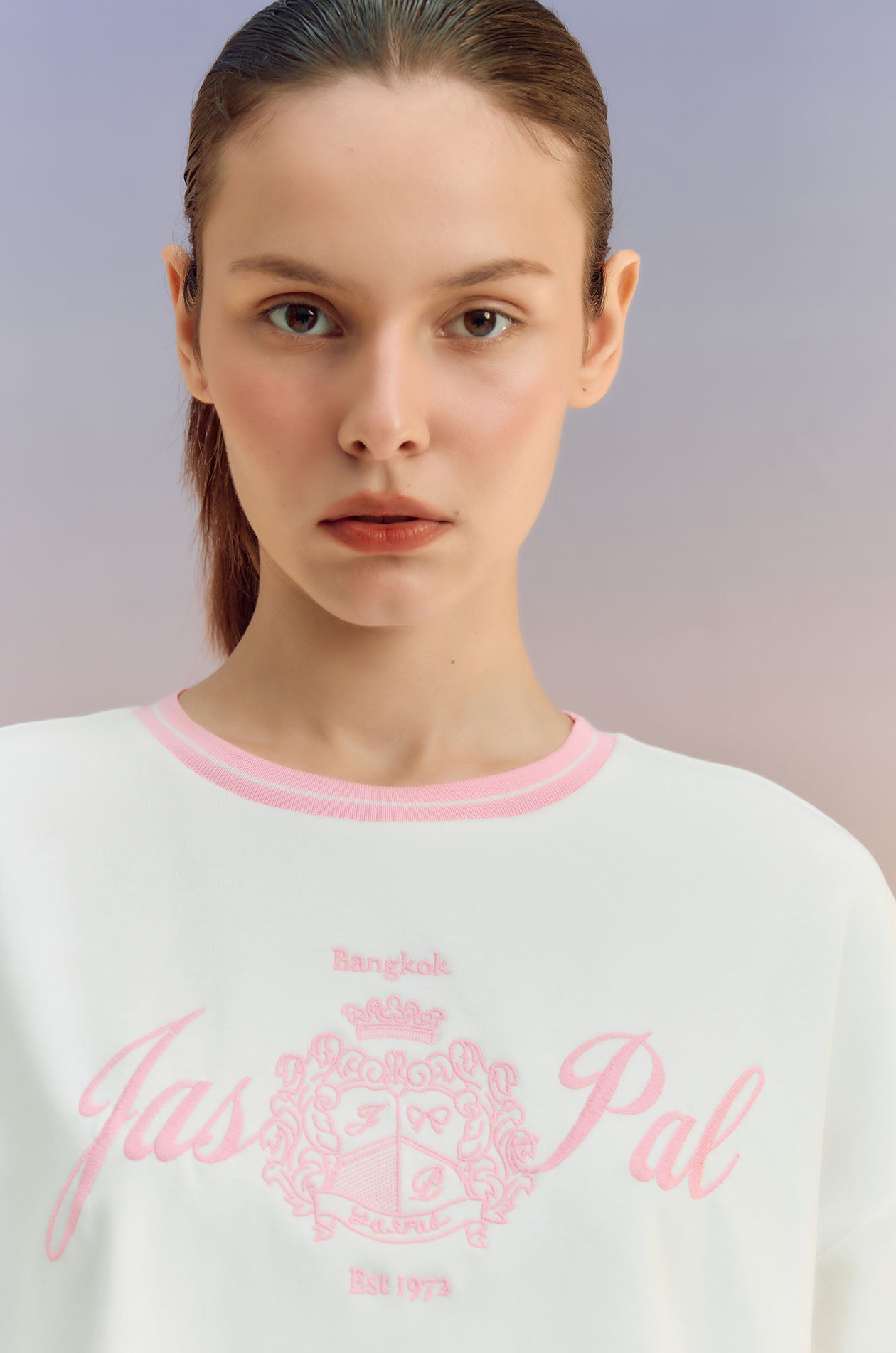 Short-sleeved oversized T-shirt in cotton-blend jersey. Boxy silhouette with round neck and front college-style logo embroidery. Available in pink and off-white.