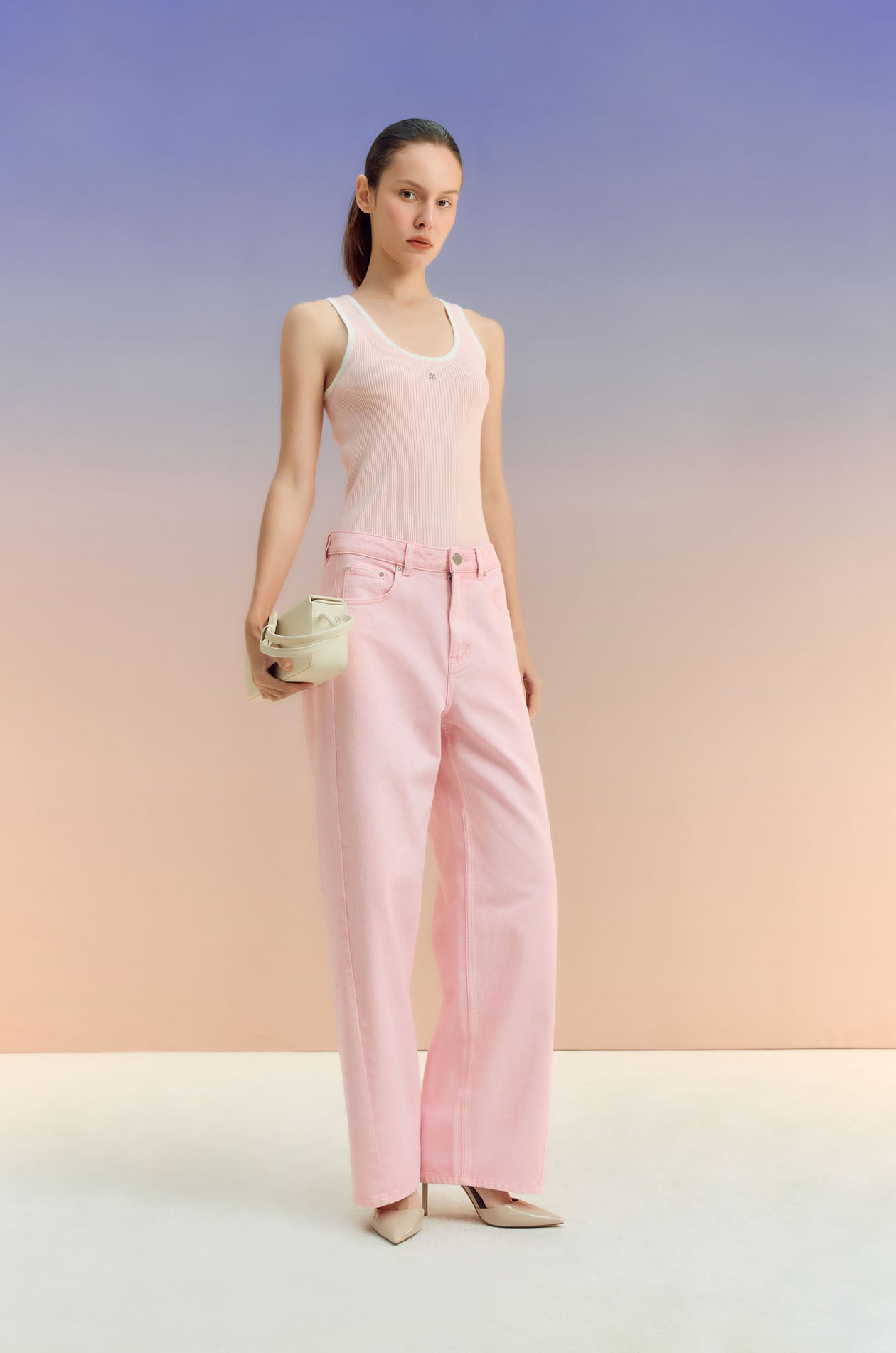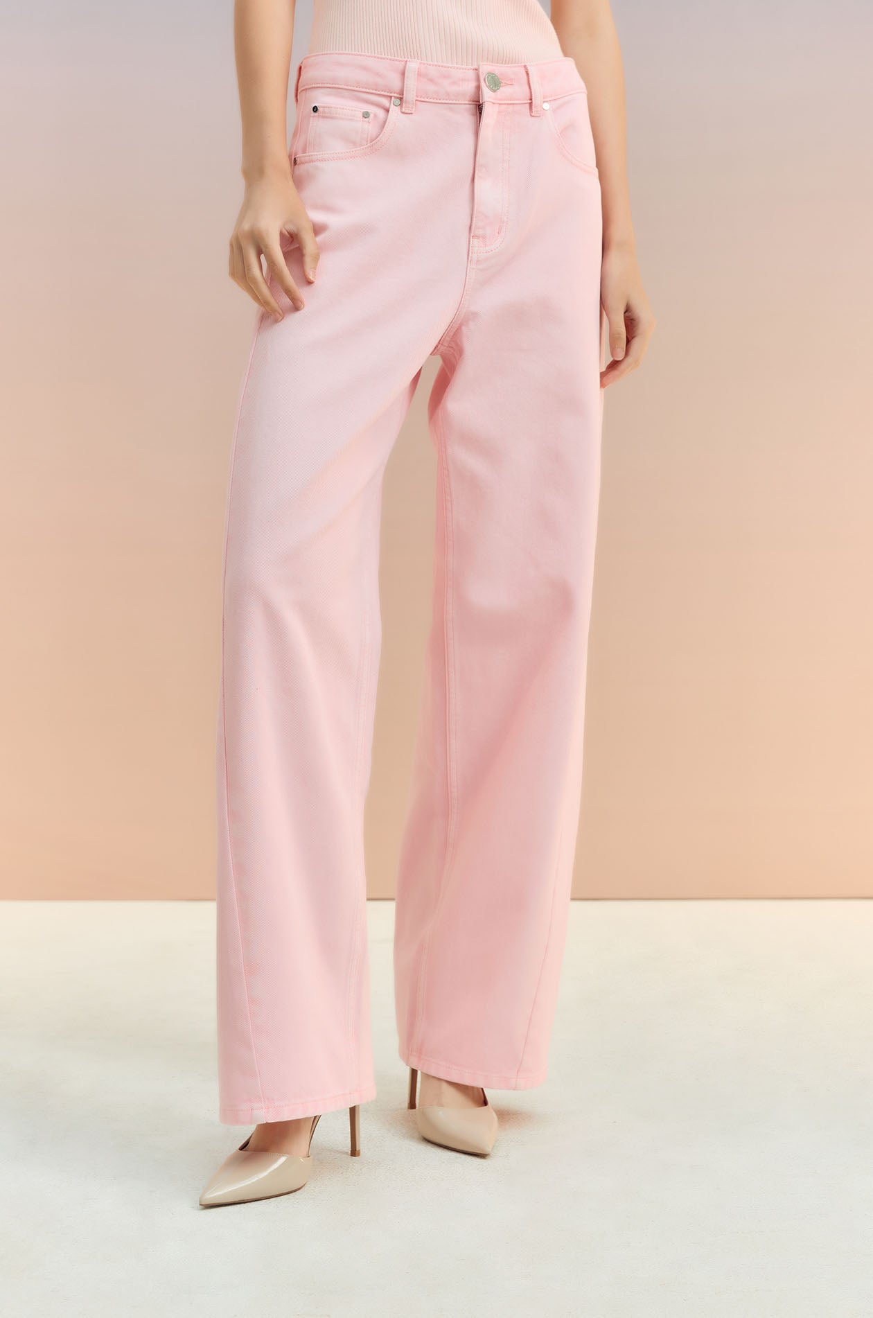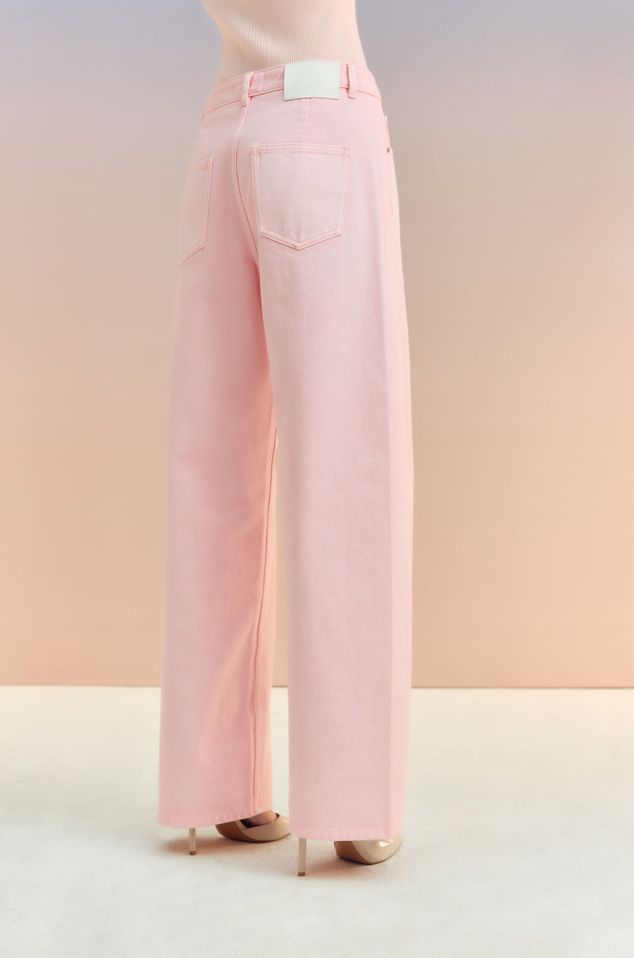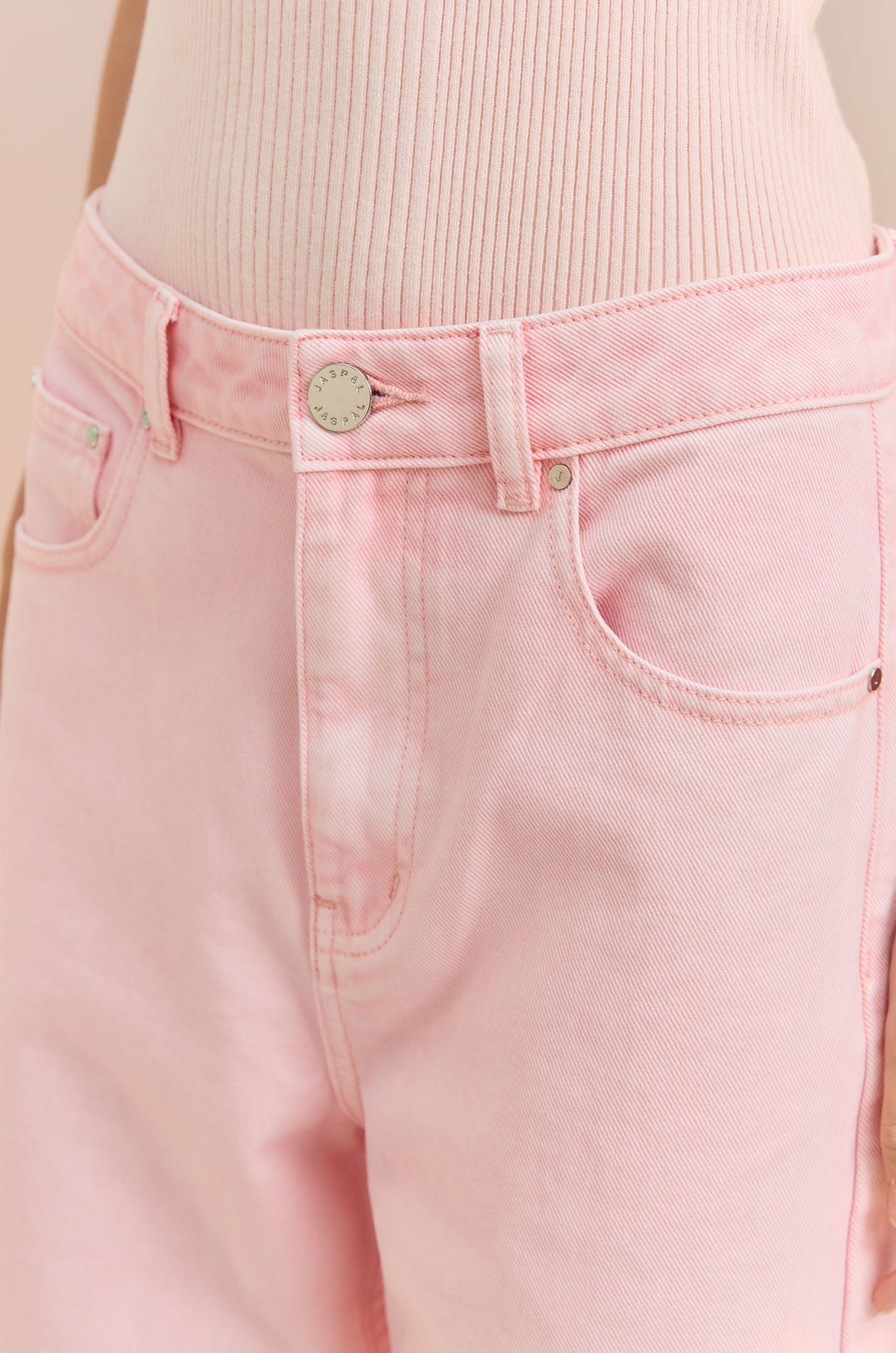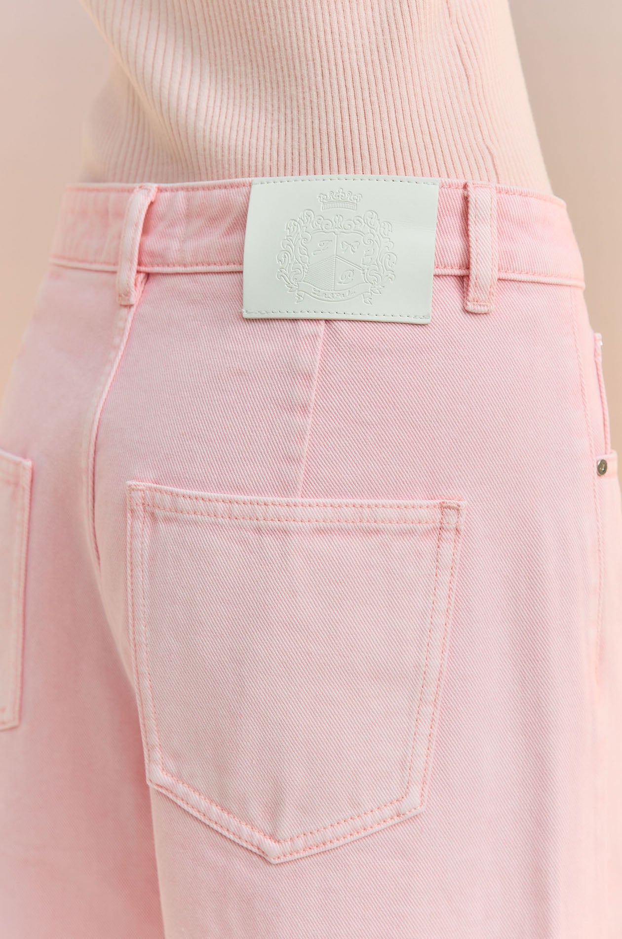 Mid-rise jeans in cotton denim. Barrel legs with five-pocket style. Faux leather with embossed college-style logo applique at back waist. Regular fit. Front button and zip closure. Available in pink.