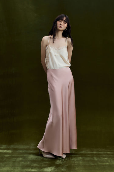 Mid-rise maxi skirt in satin. Bias cut for flattering shape. Side zip closure. Available in pink and red.