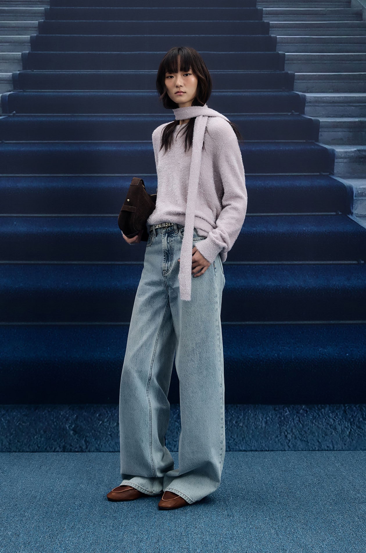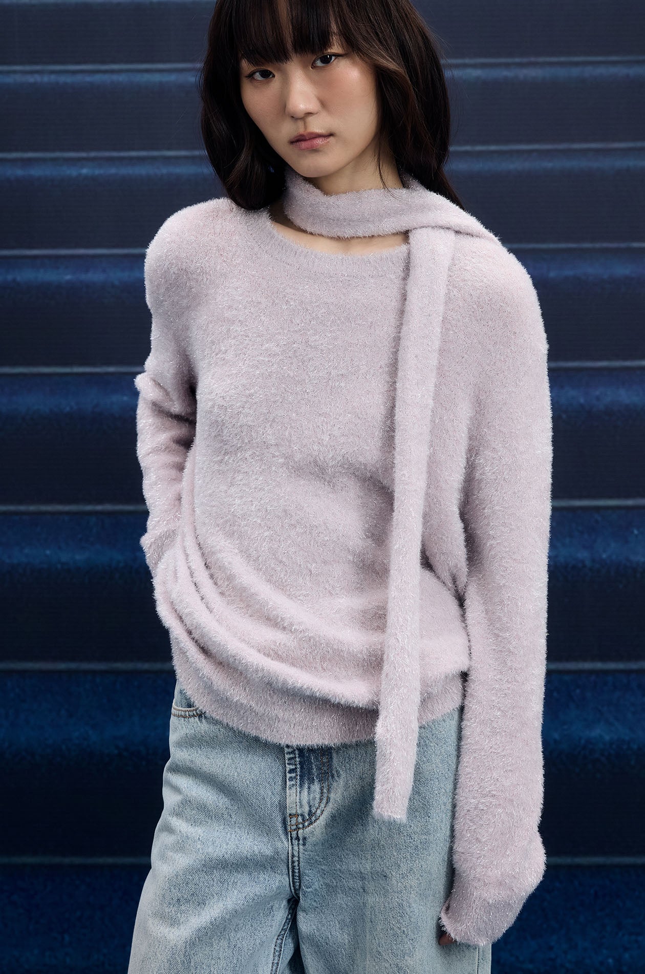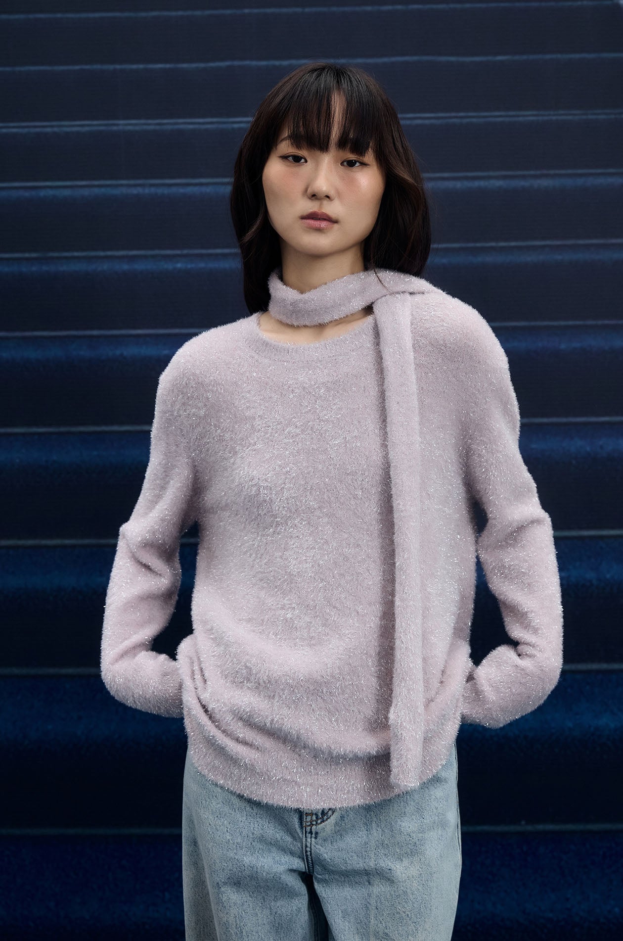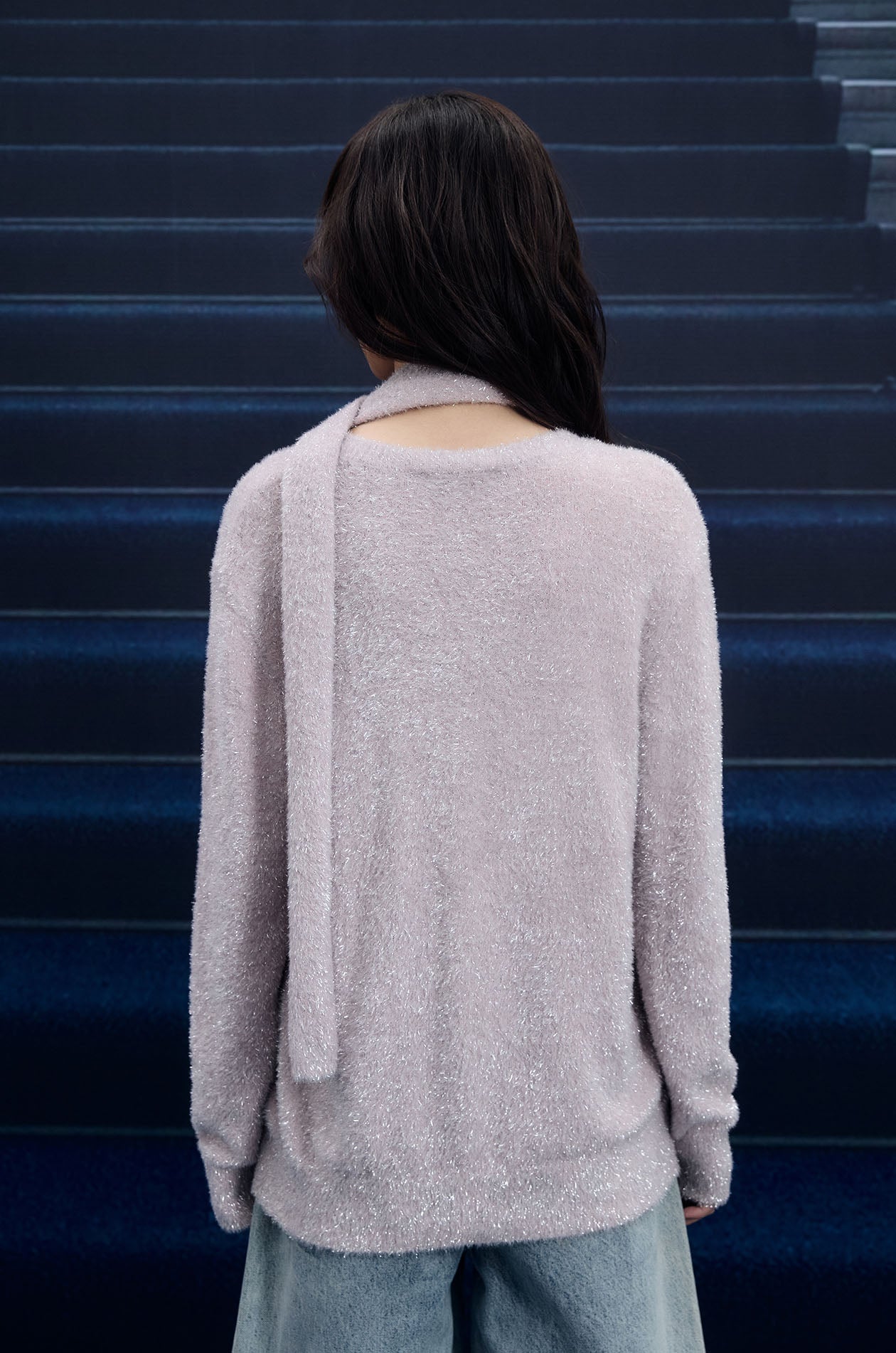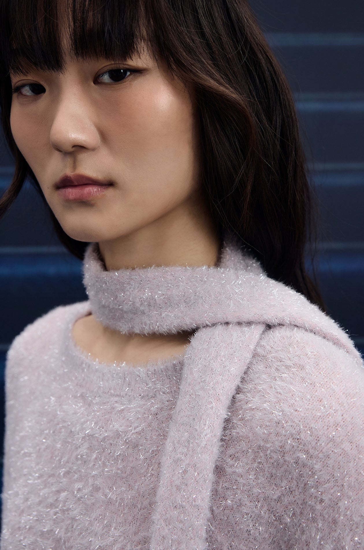 Longline sweater in metallic fluffy knit. Comes with a matching skinny scarf. Relaxed fit with round neck. Available in pink.