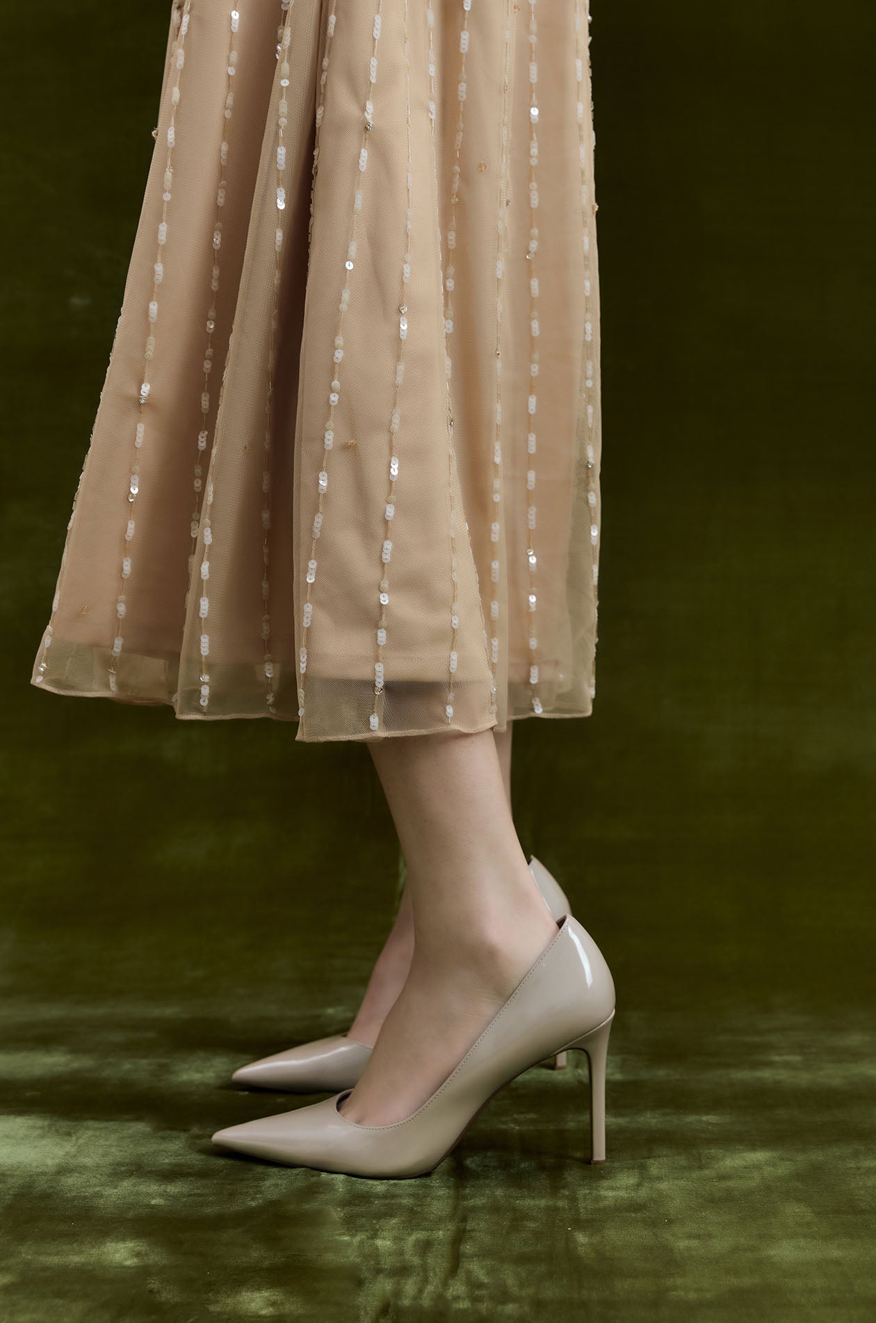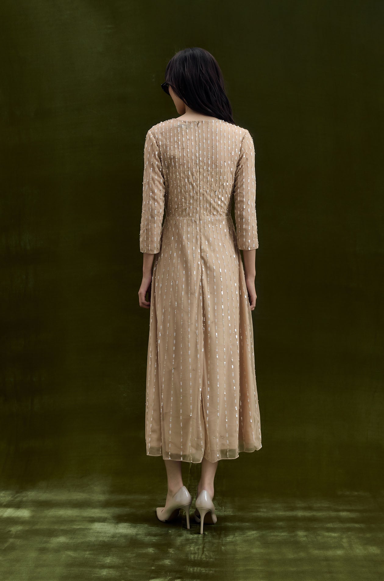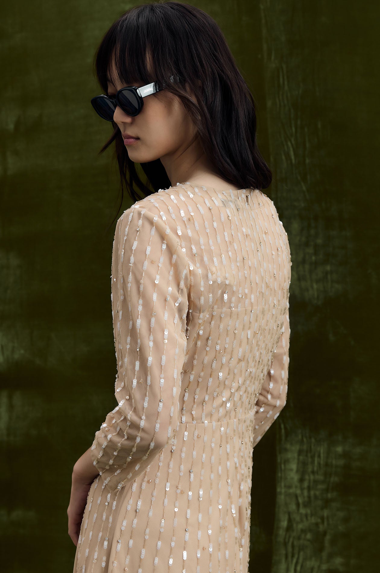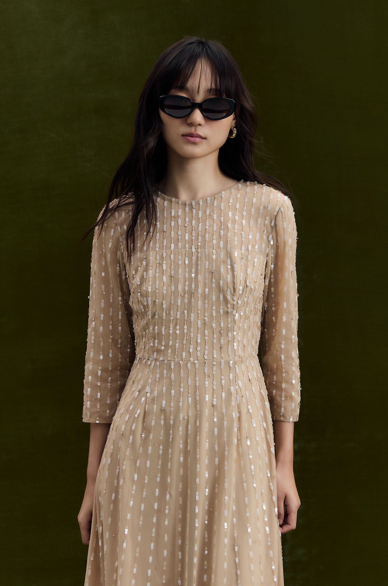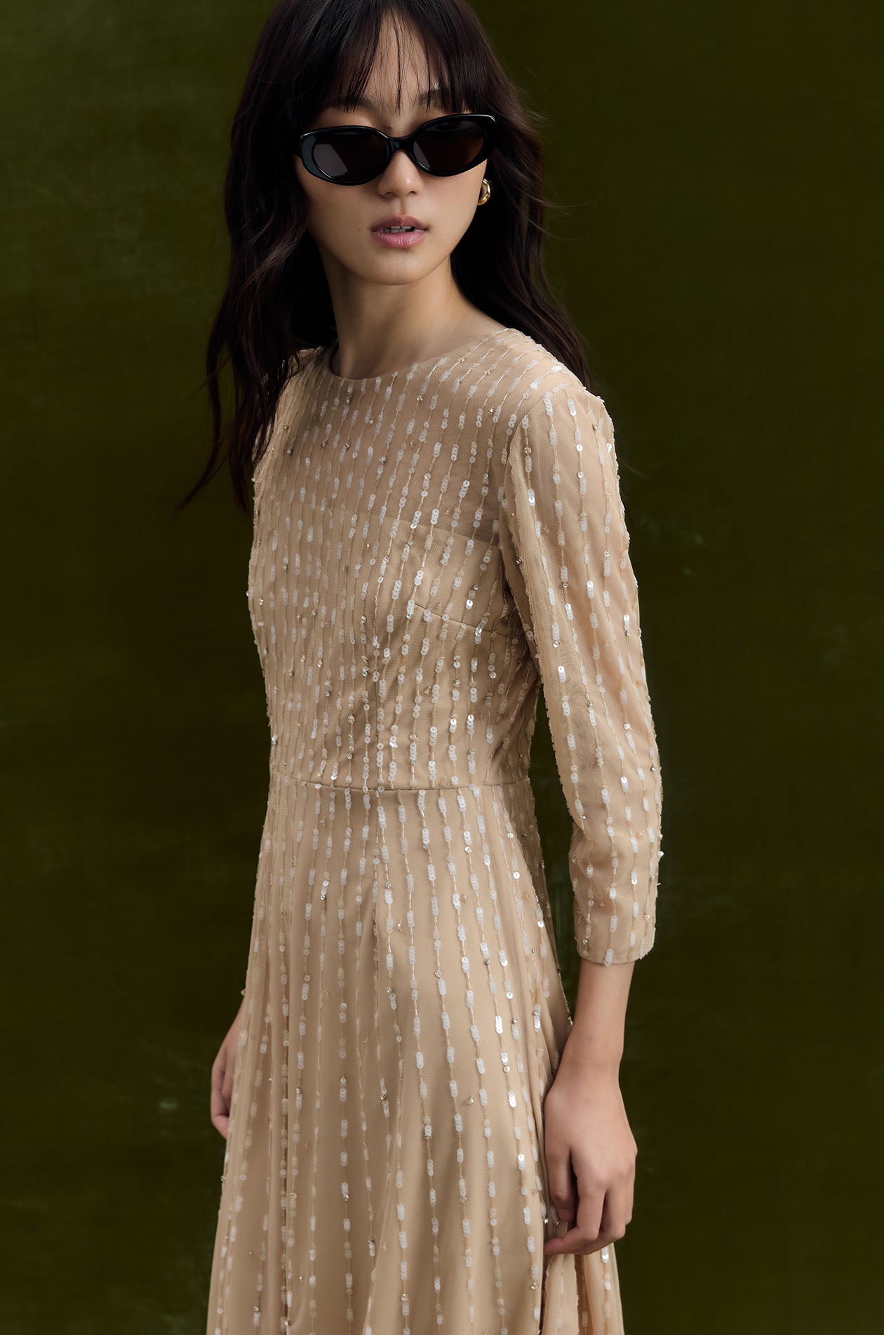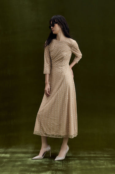 Long-sleeved maxi dress in mesh with partial lining. Handcrafted embellishment in traditional Indian style with shimmering sequins, beads, and rhinestones. Fit and flare silhouette with round neckline. Back zip closure. Available in golden brown.