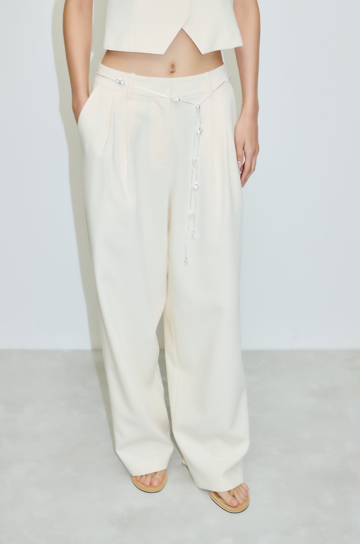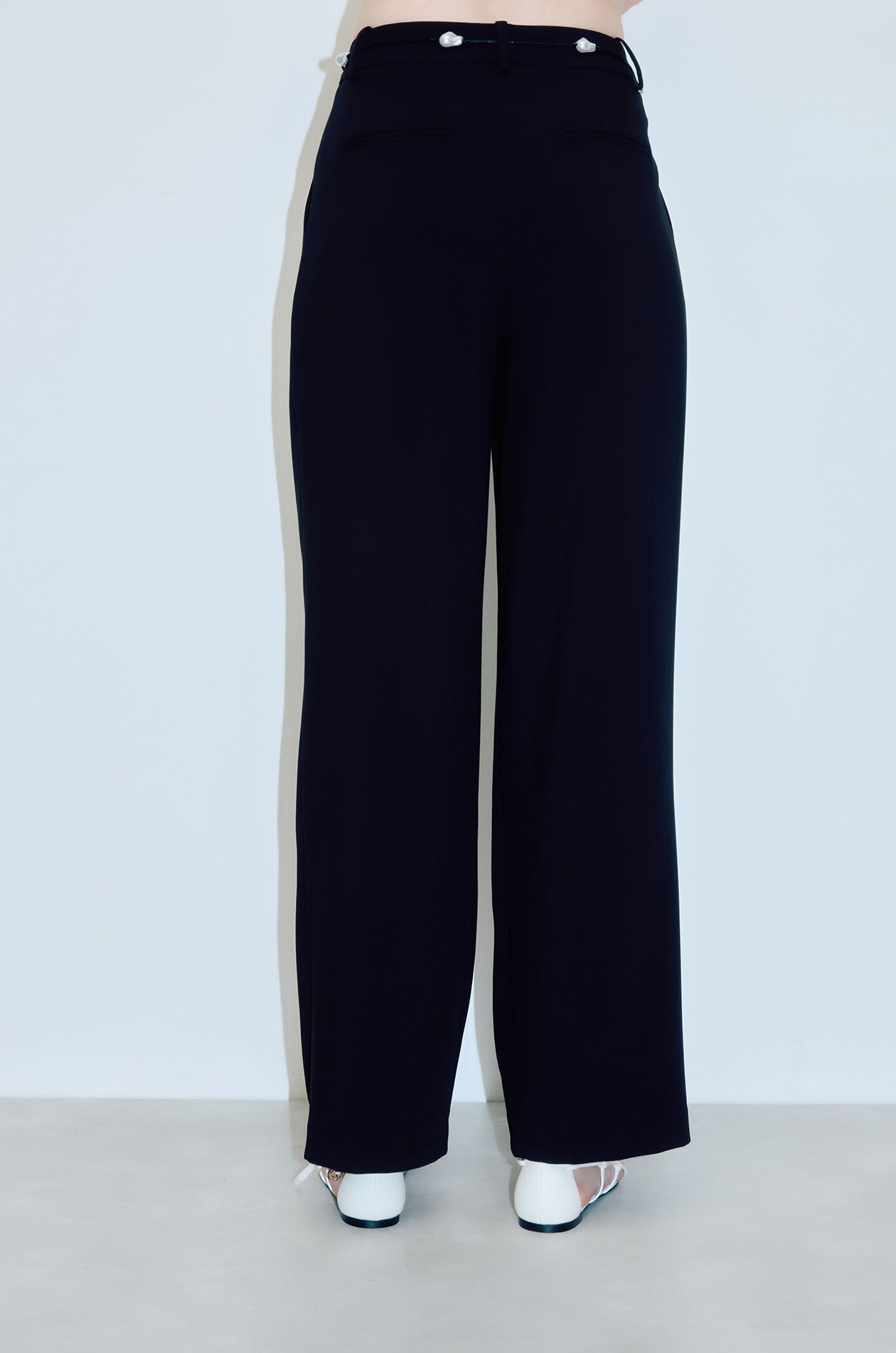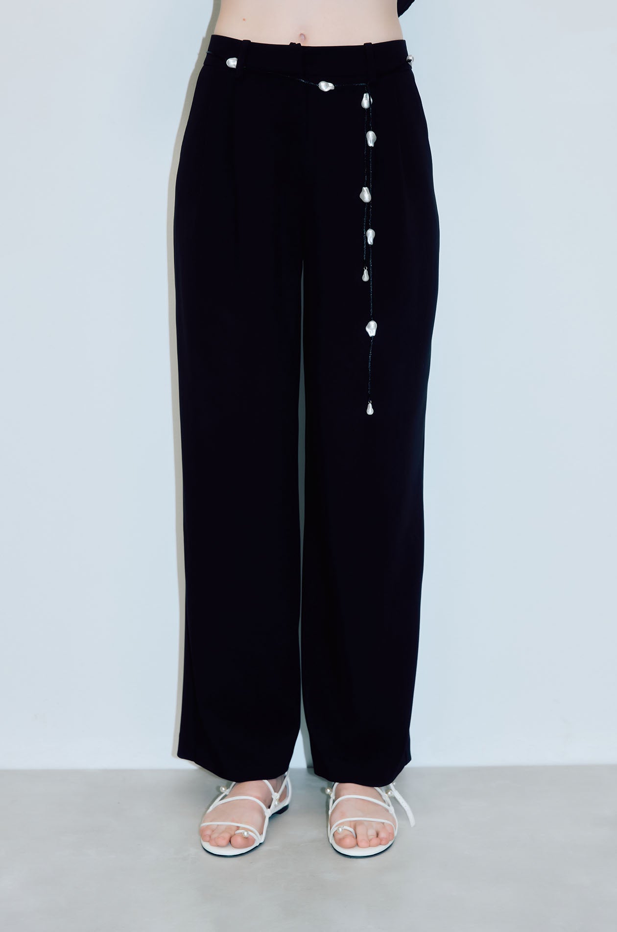 Jaspal Edit x Pacharee | Mid-rise pants crafted from terry rayon. Designed with loose straight legs, detailed with gentle pleats for added fluidity. Finished with a rope belt accented by subtle gold-tone hardware. Available in black and light yellow.