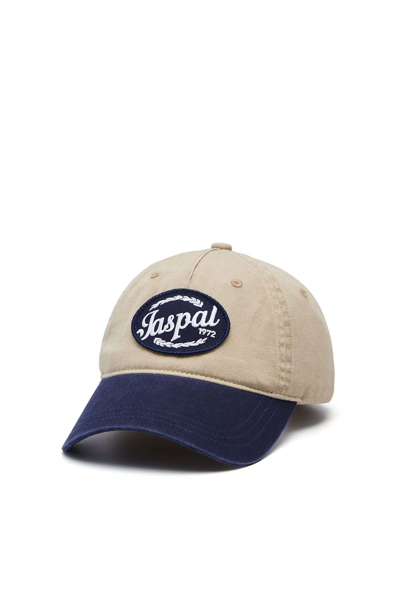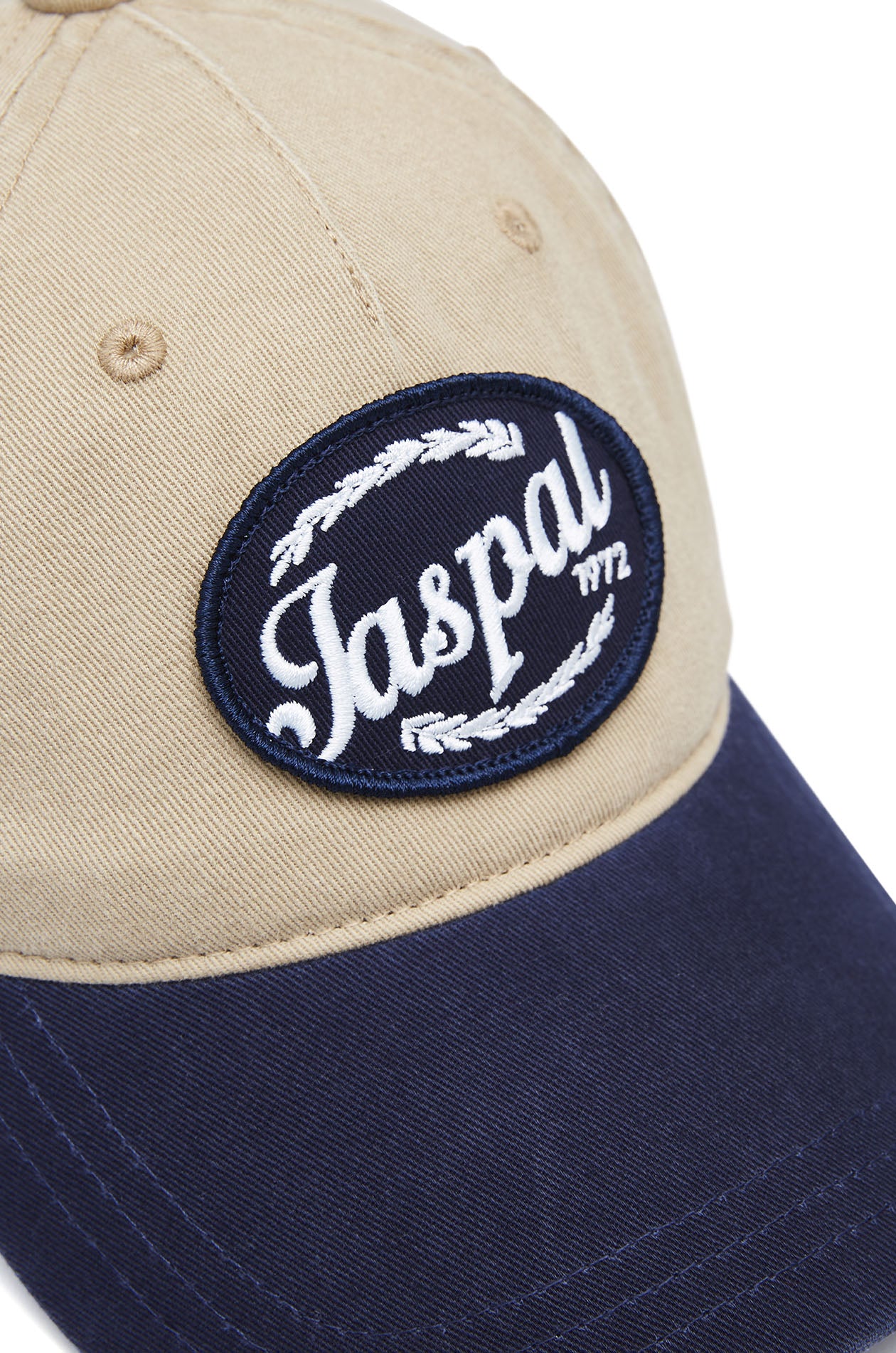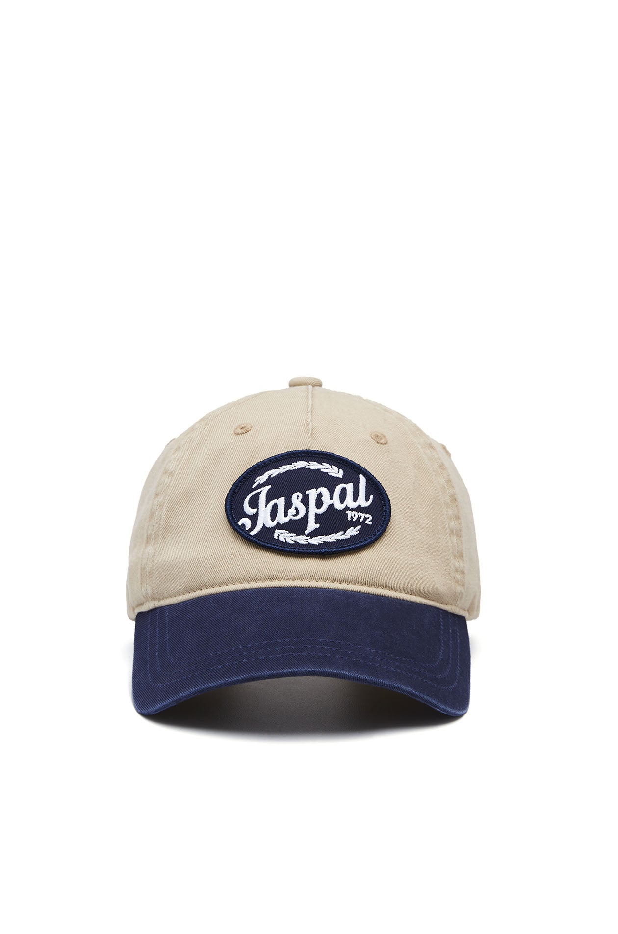 Baseball cap in cotton with tow-tone design and college-inspired Jaspal badge. Available in beige/navy.