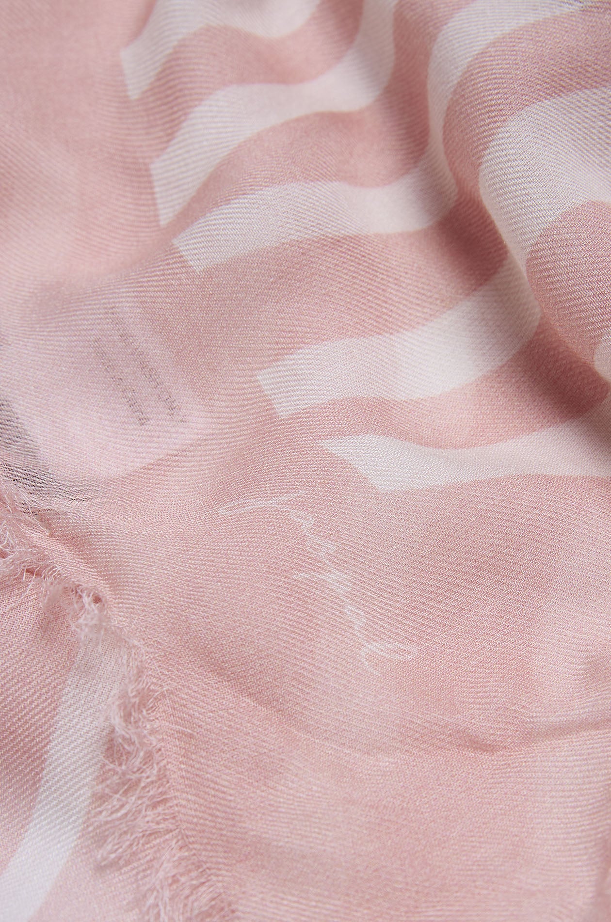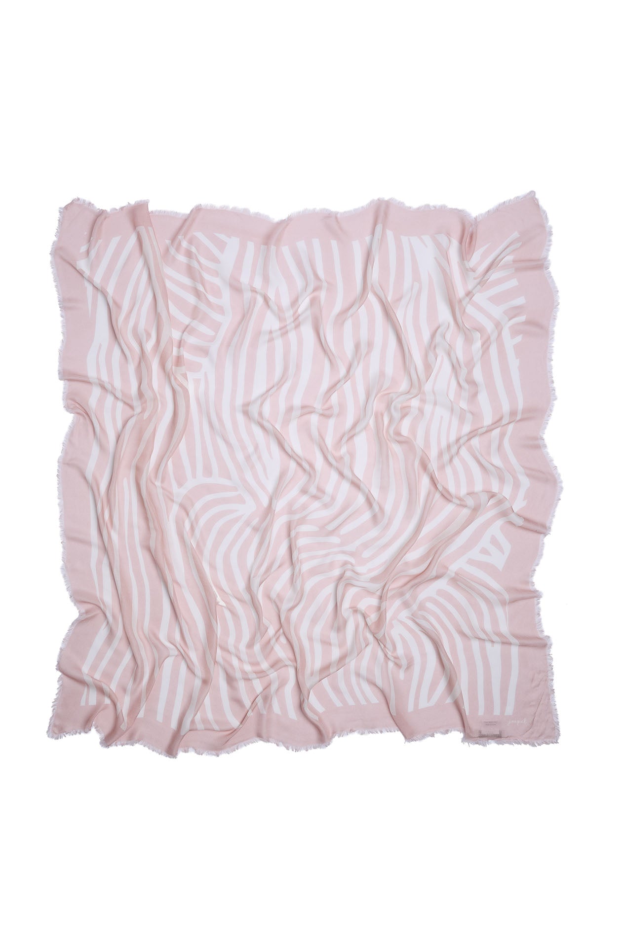 Square scarf in soft-finish lightweight fabric, featuring an abstract wavy line design with solid edges. Available in pale pink.