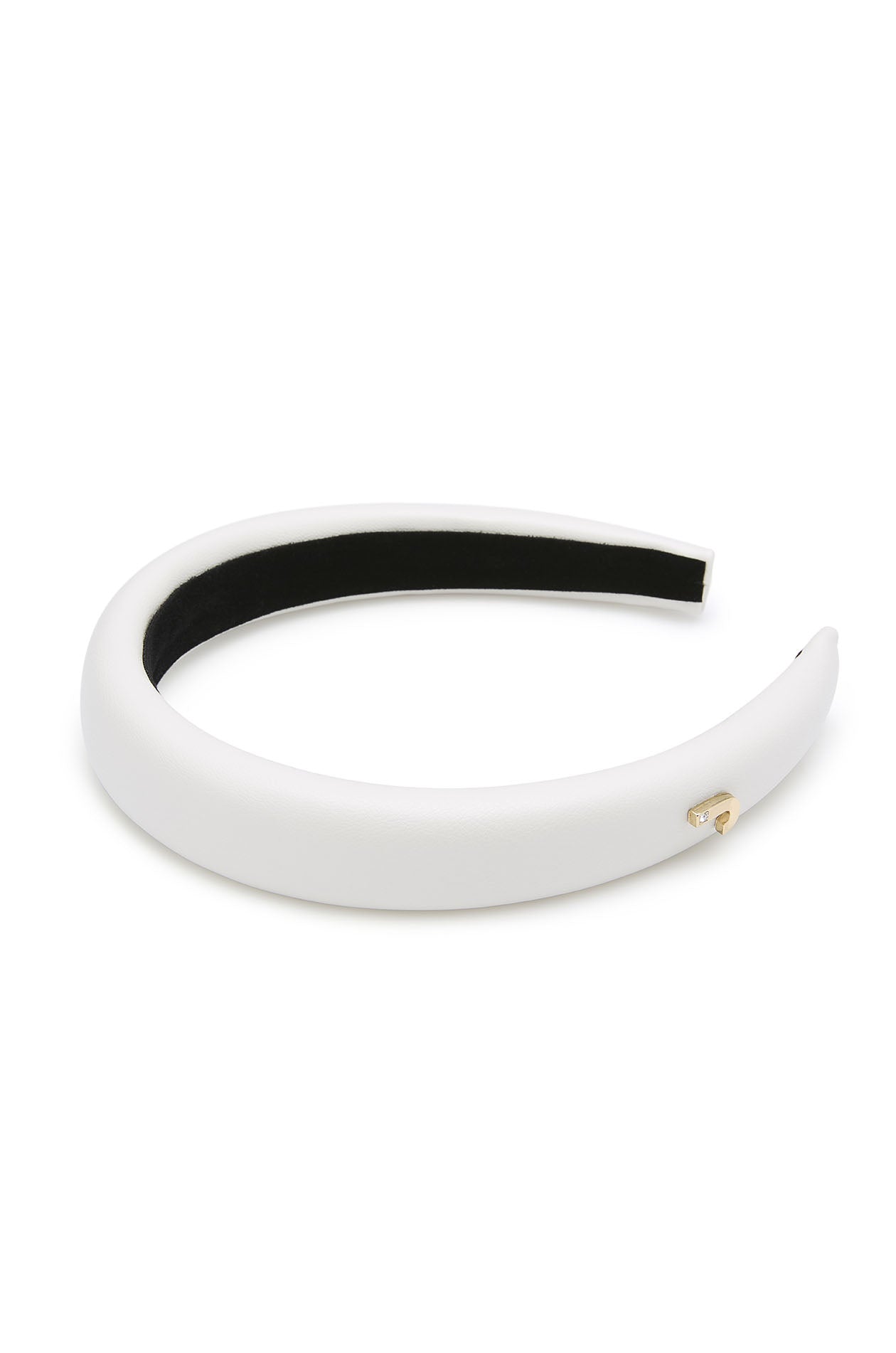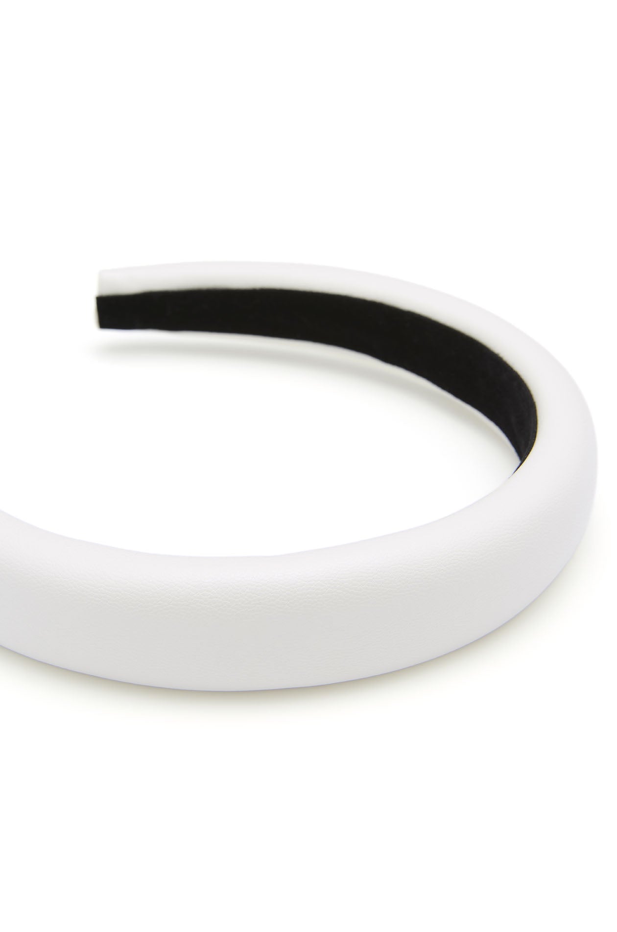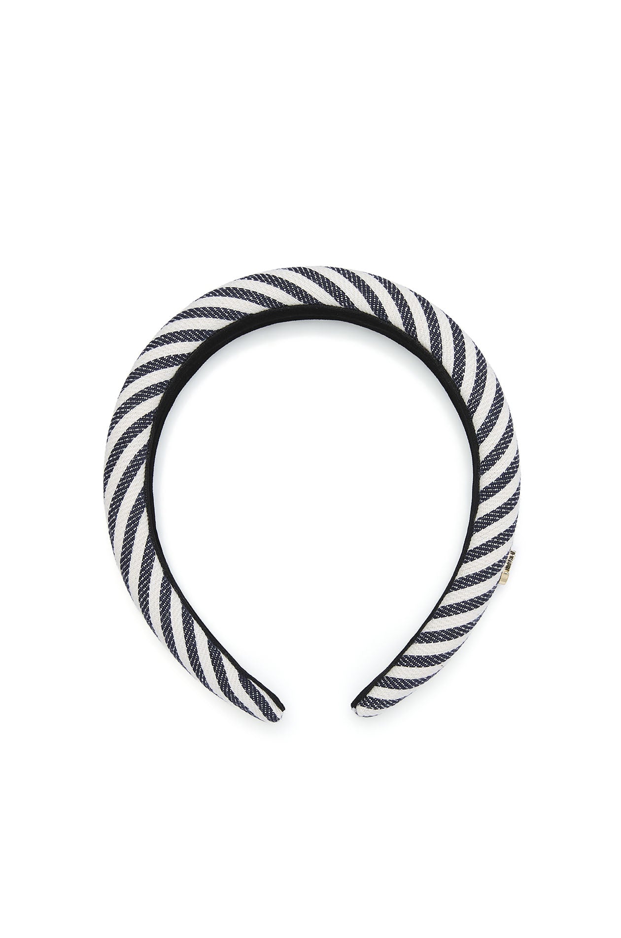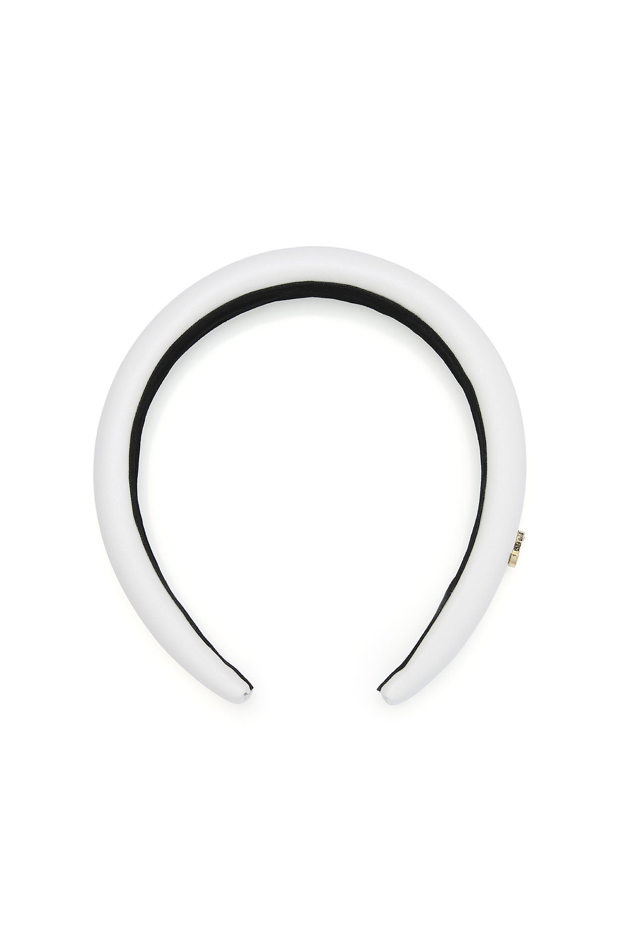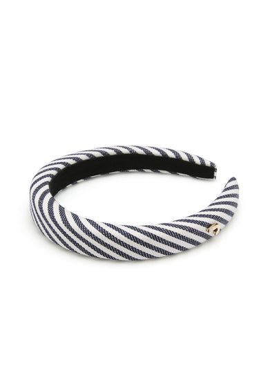 Set of chunky headband, including a faux leather headband with a ‘J’ logo and another fabric headband with contrasting stripes. Available in white and black/white.