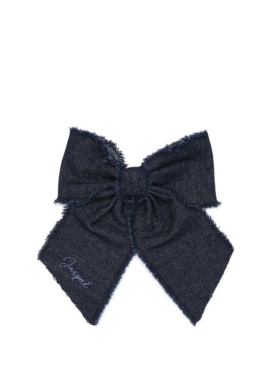 Hair clip crafted from metal, adorned with a frayed-edge denim bow. Available in indigo.