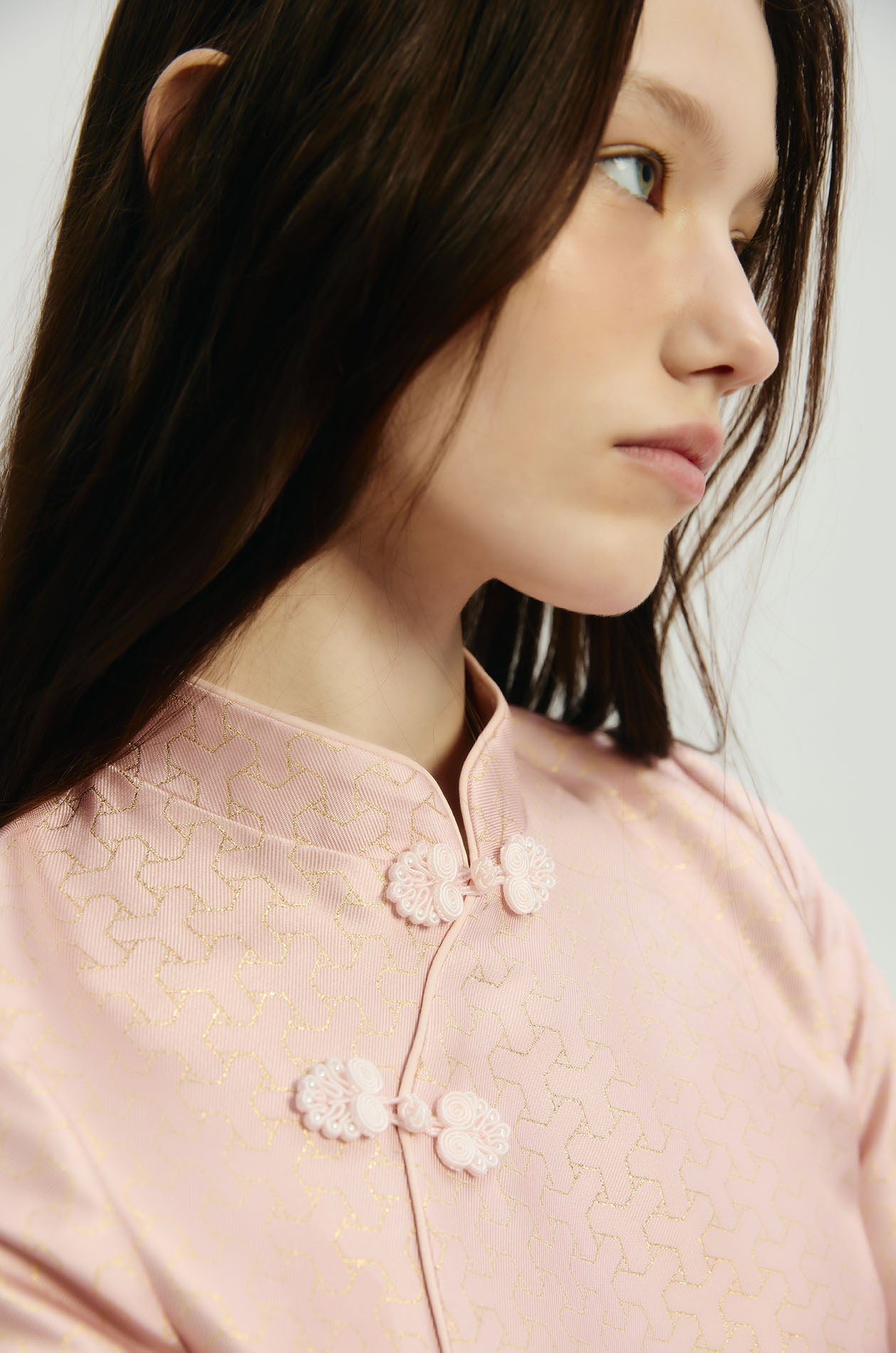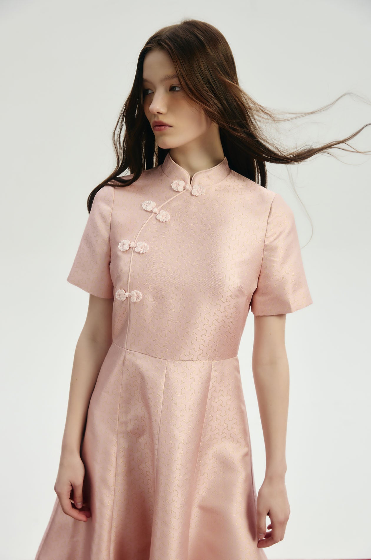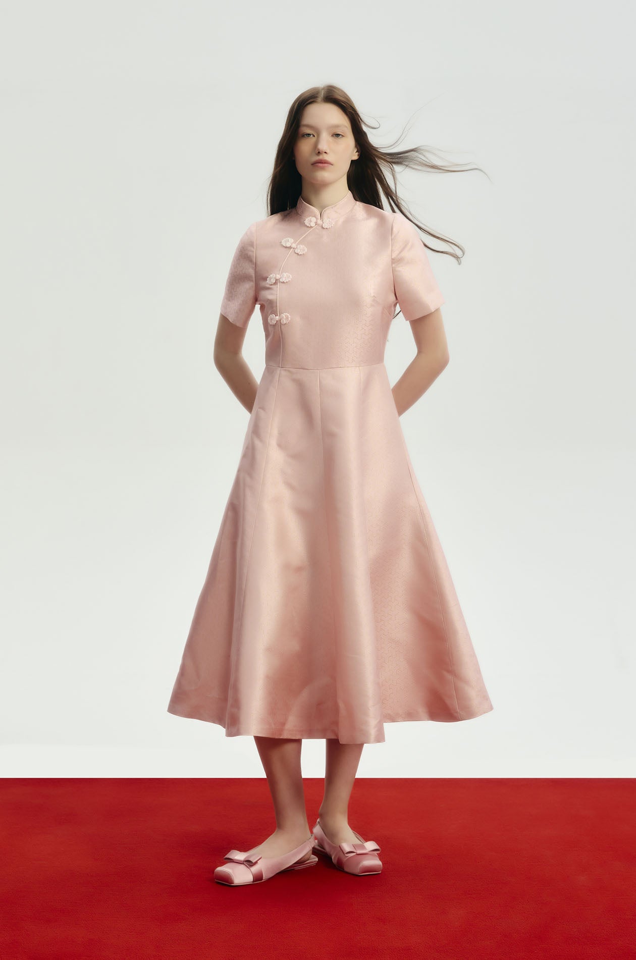 Jaspal x nussdaydream for Lunar New Year | Short-sleeved midi dress in jacquard with tessellation pattern. Fit and flare silhouette with mandarin collar and off-center pankou knot button detail. Back zip closure. Available in Crystal Rose.