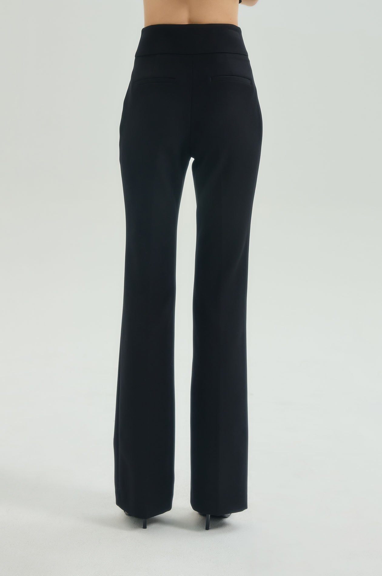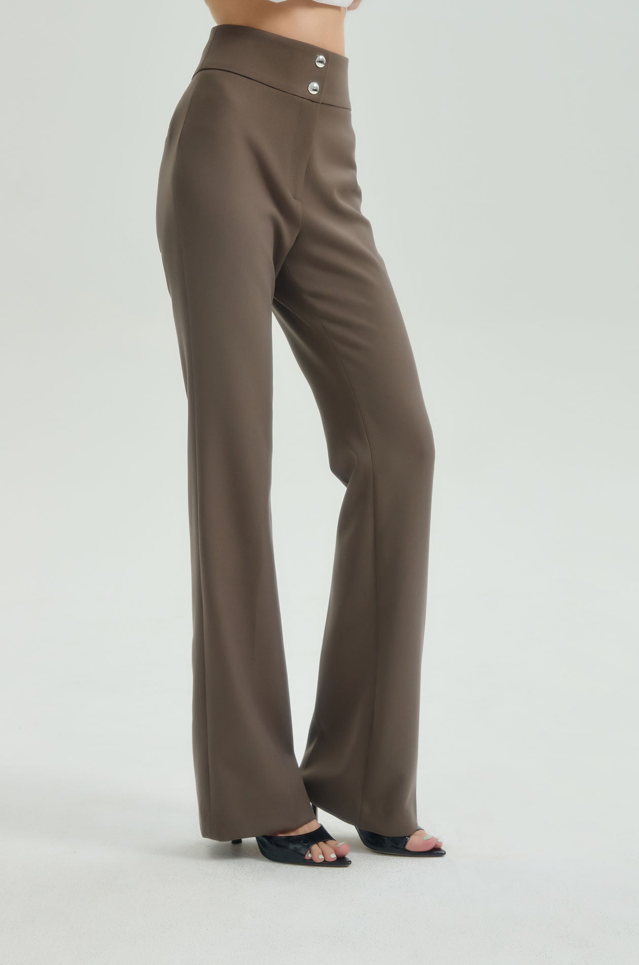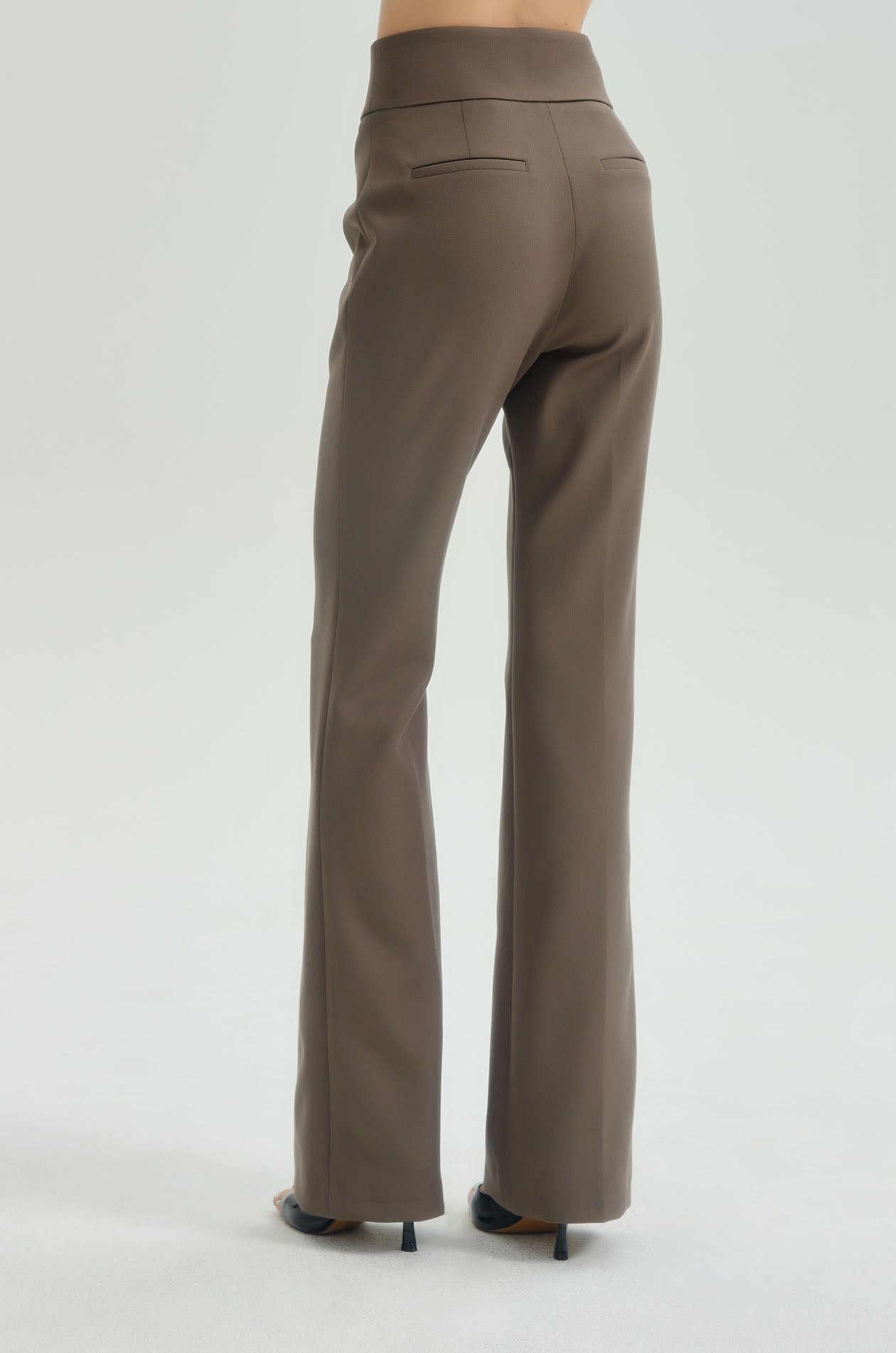 High-rise pants in suiting fabric. Slim fit with flare legs and chunky waistband. Front button and zip closure. Available in black and olive grey.