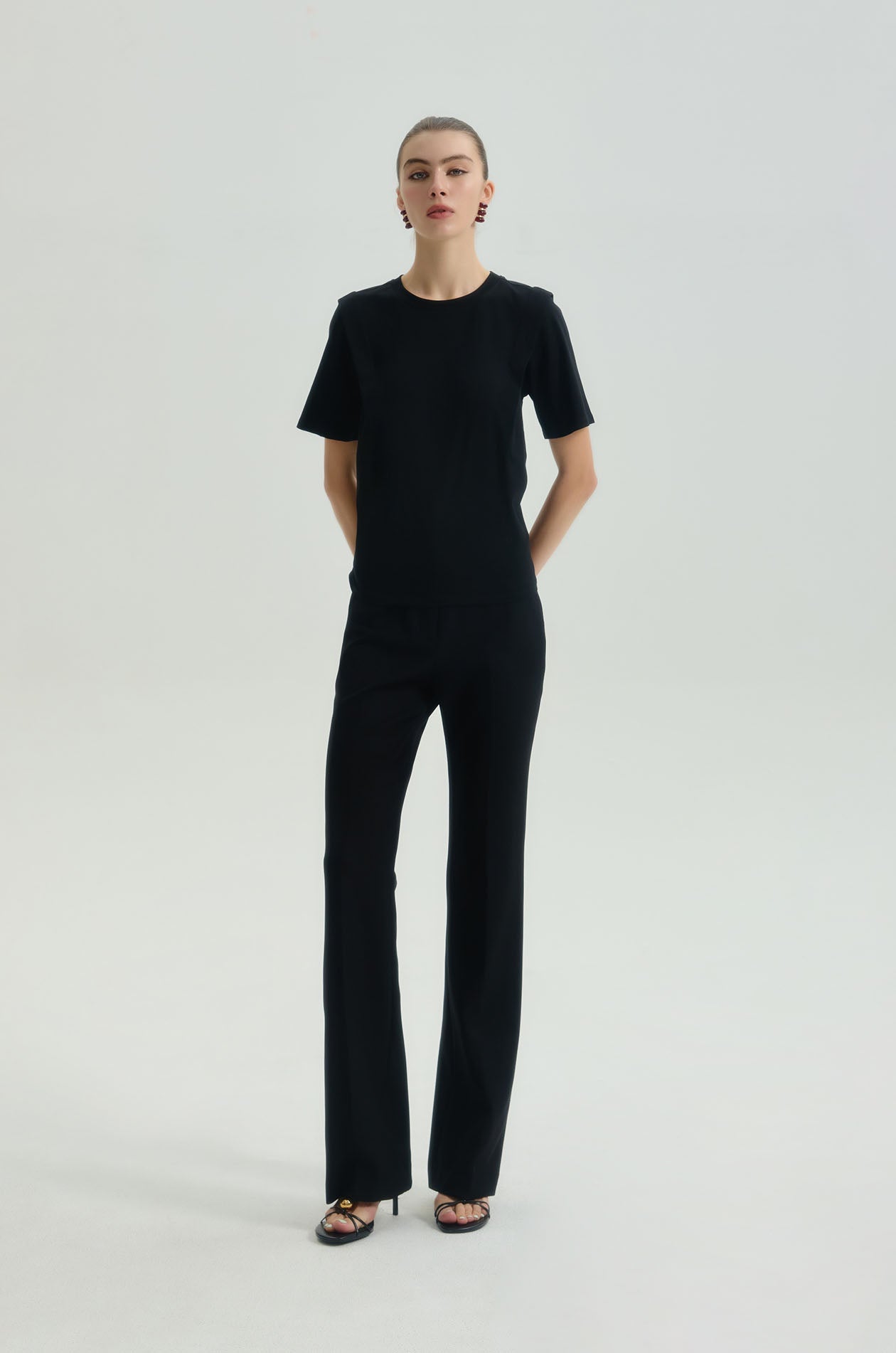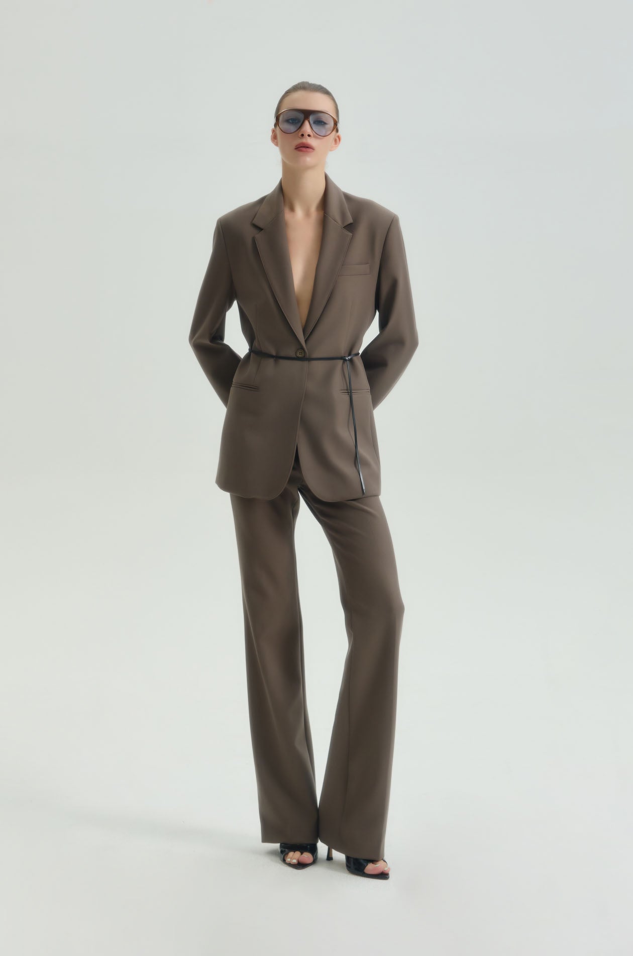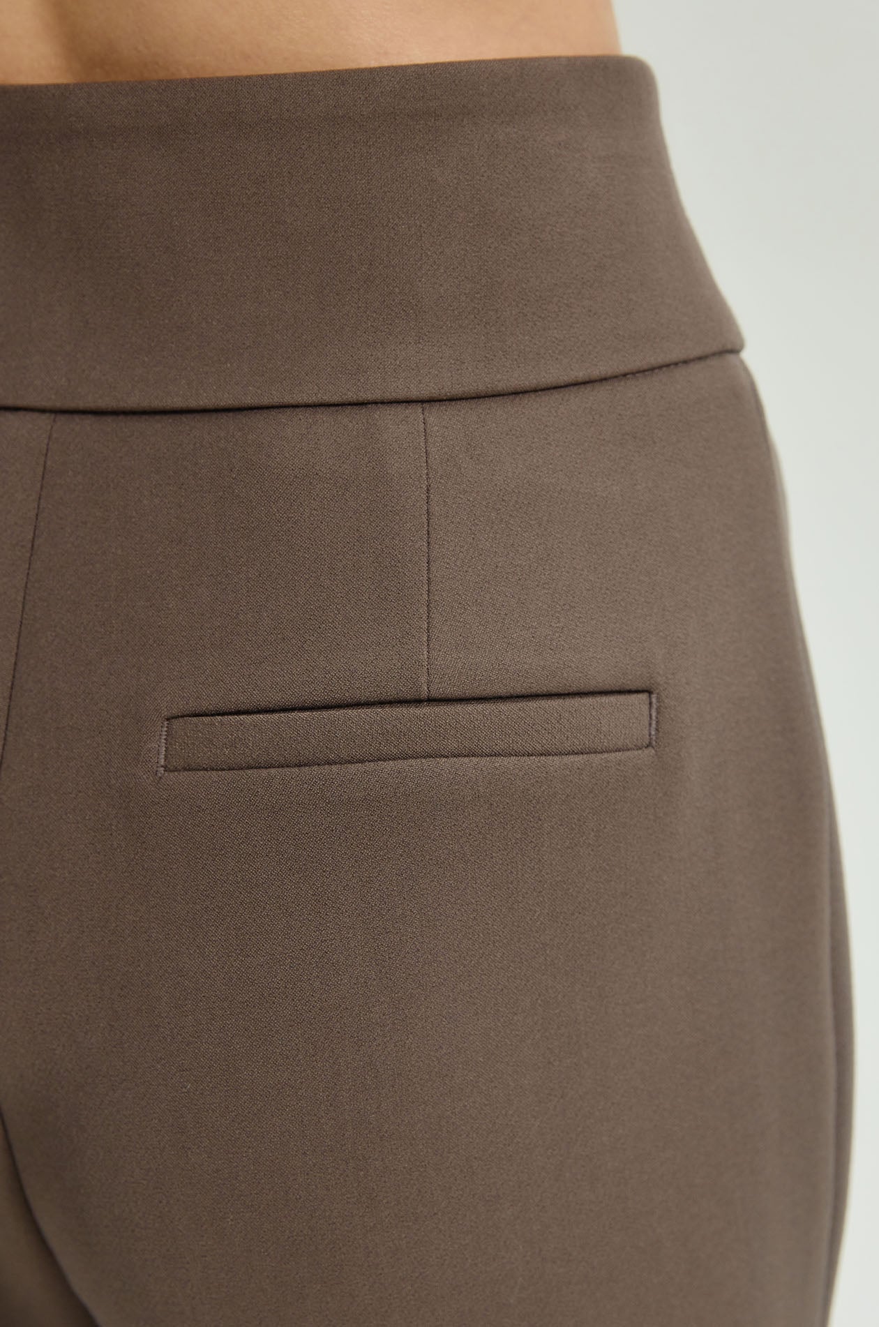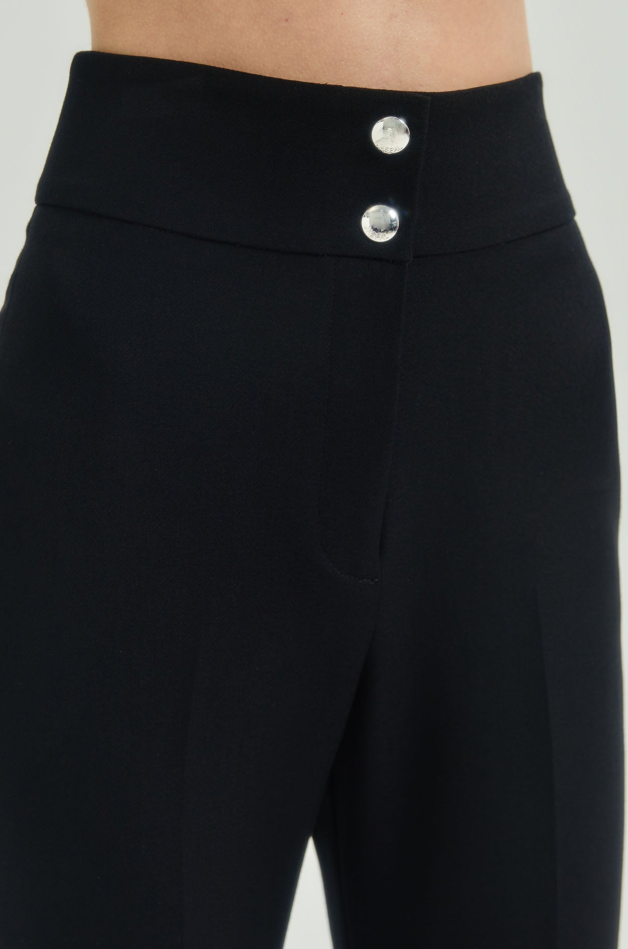 High-rise pants in suiting fabric. Slim fit with flare legs and chunky waistband. Front button and zip closure. Available in black and olive grey.