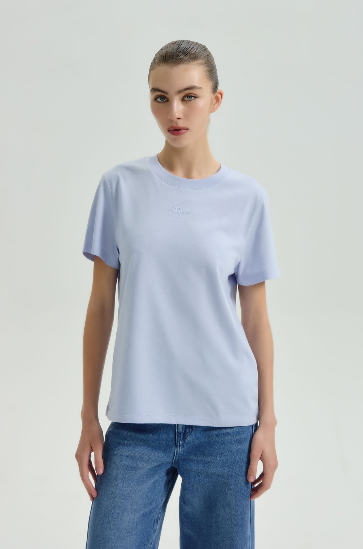 Short-sleeved T-shirt in jersey fabric. Regular fit with round neckline and embossed Jaspal logo. Available in striped red, dark navy, cornflower blue, and white.