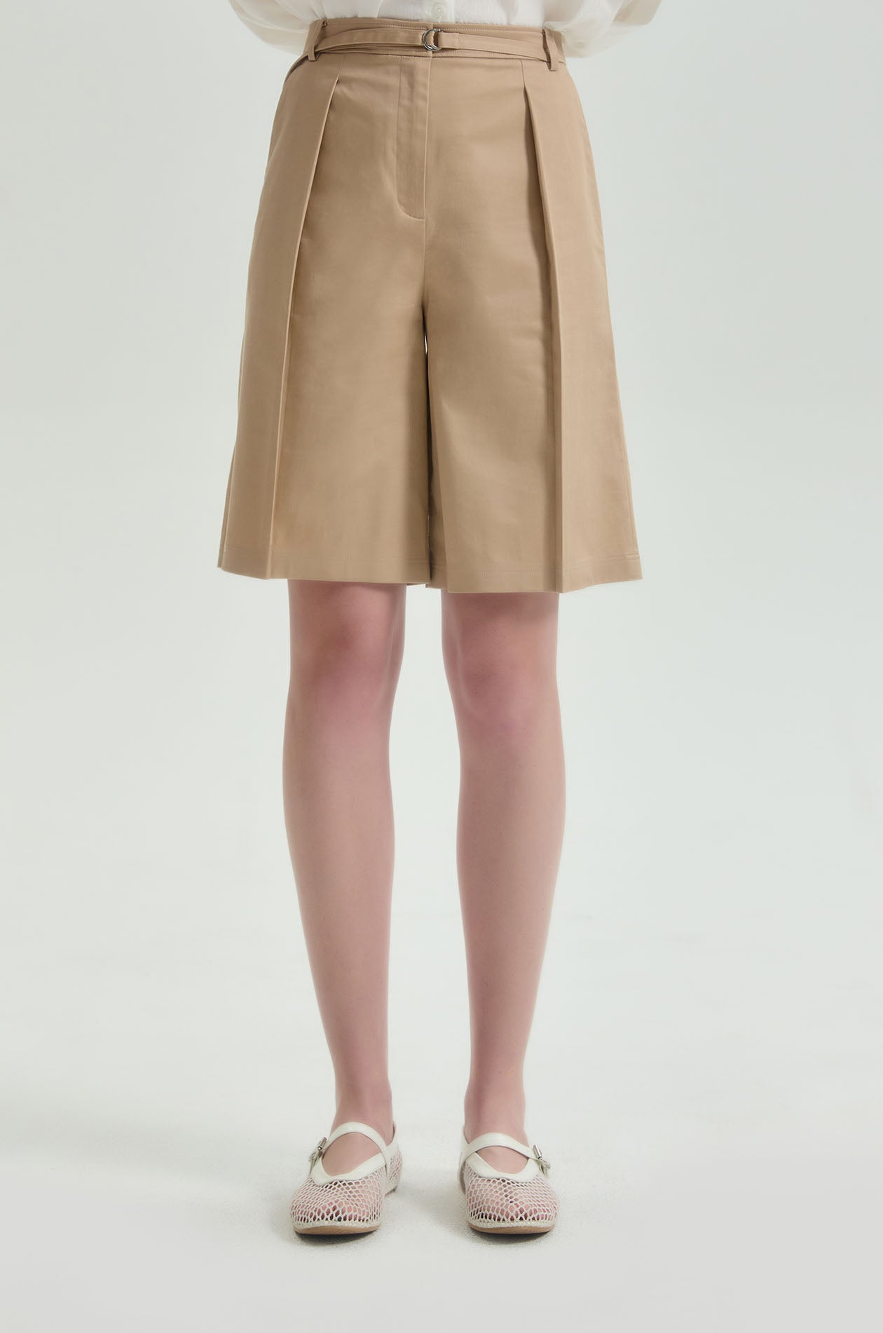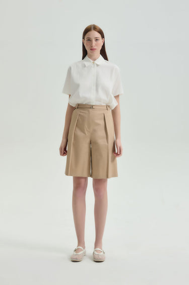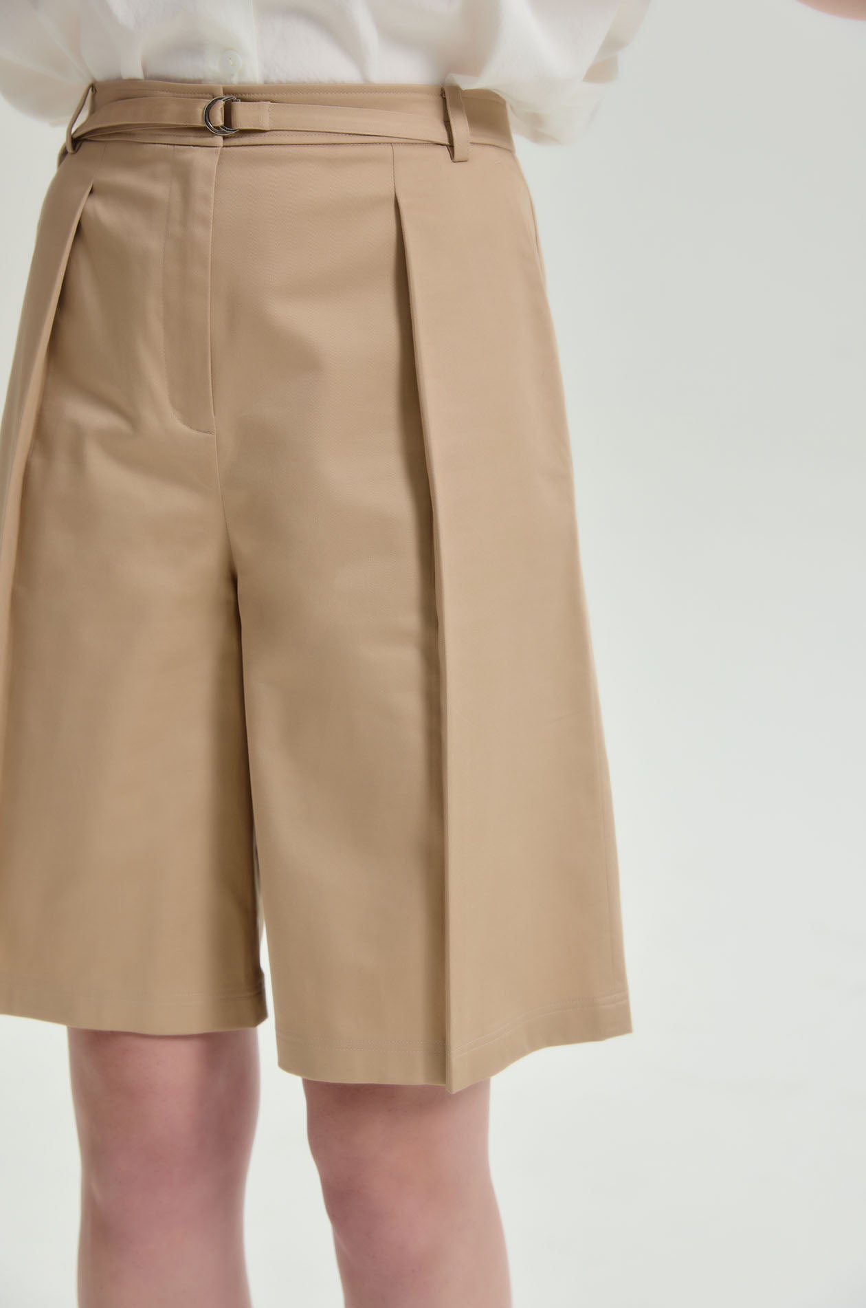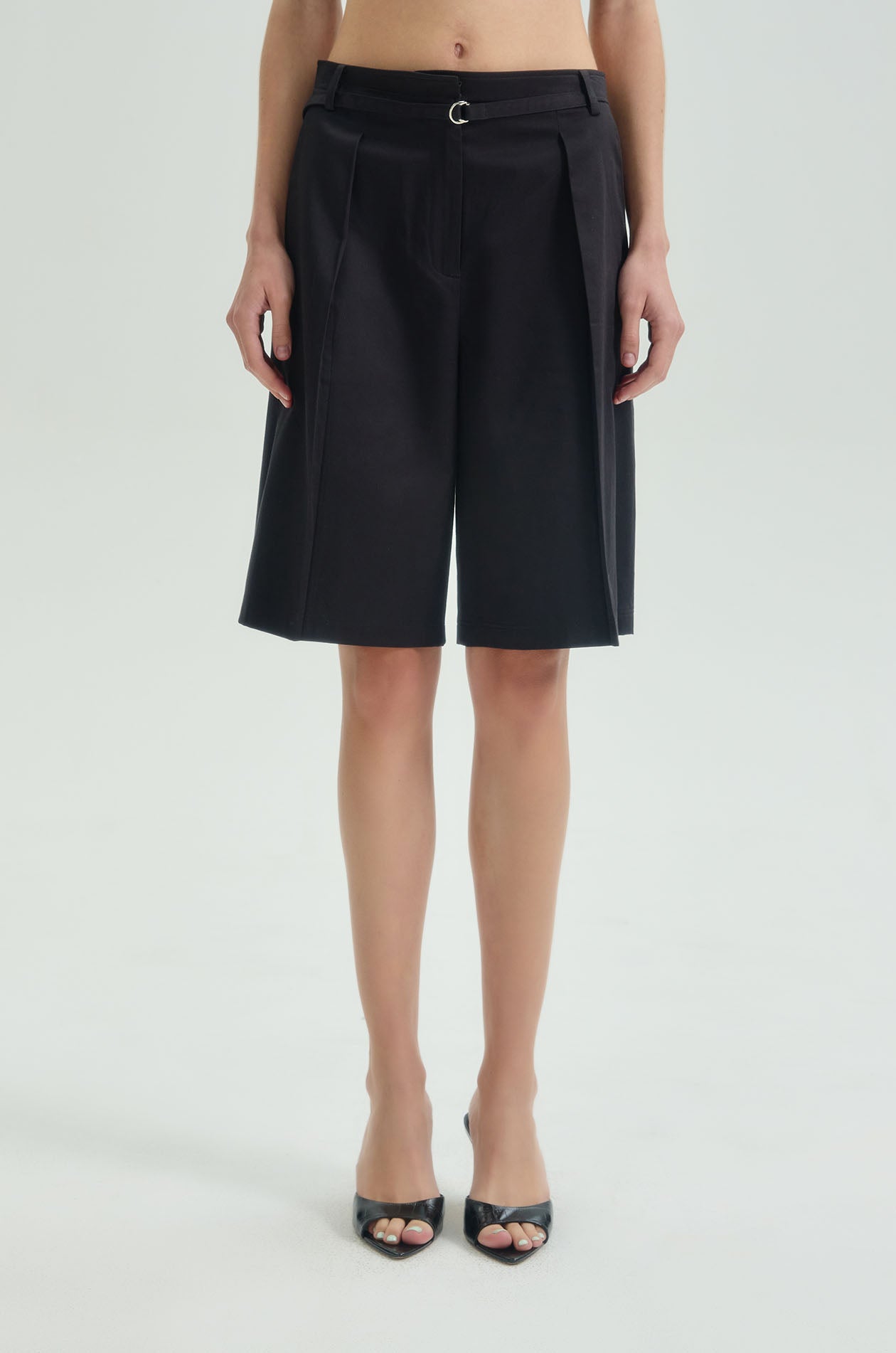 High-rise Bermuda shorts in woven fabric. Loose-straight legs with chunky pleats and side pockets. Matching skinny belt. Front hook and zip closure. Available in black and light brown.
