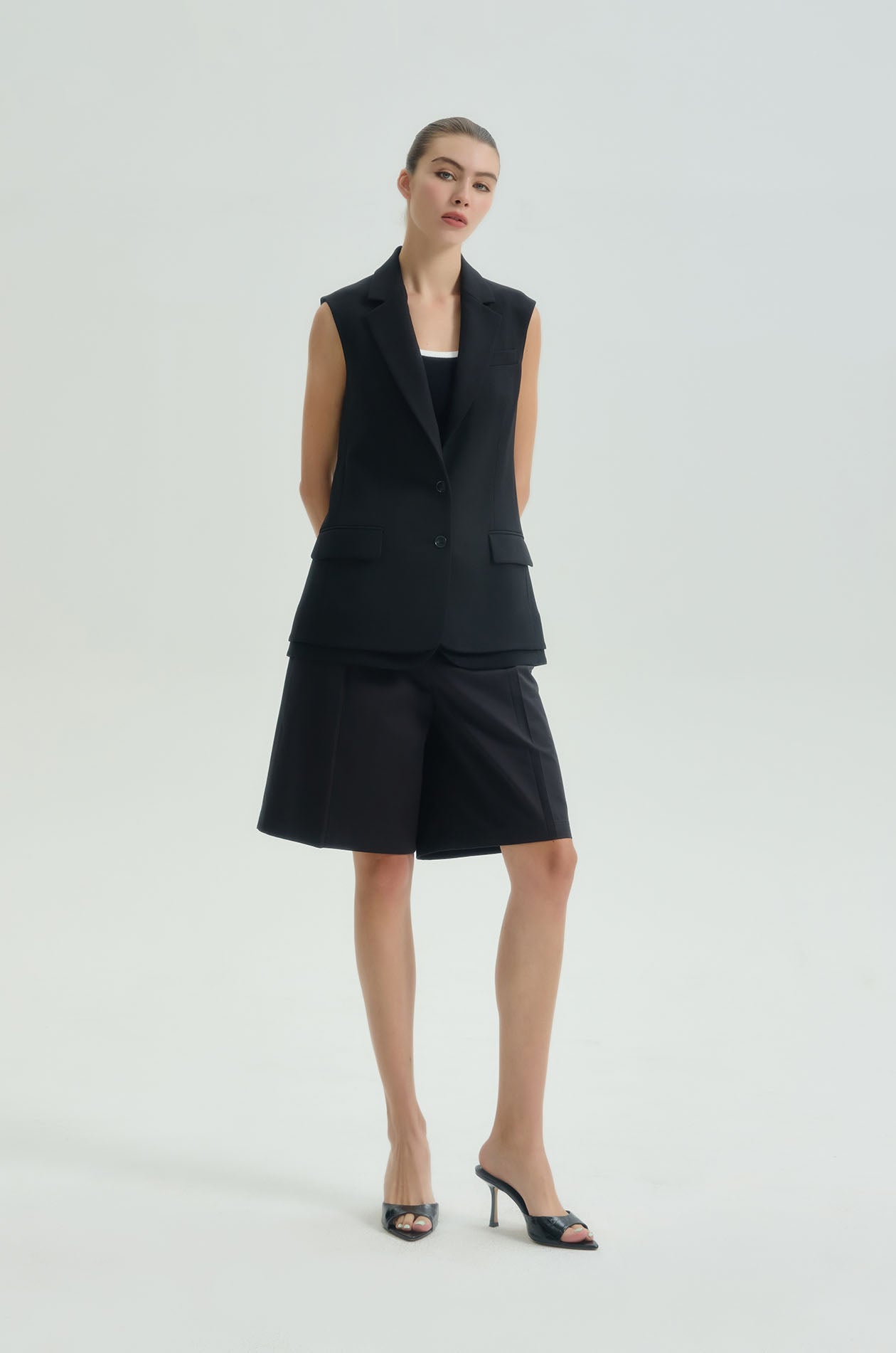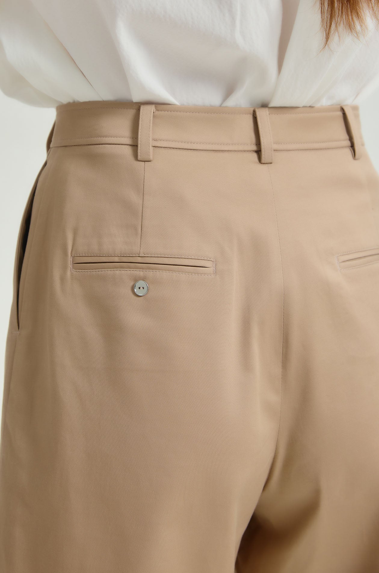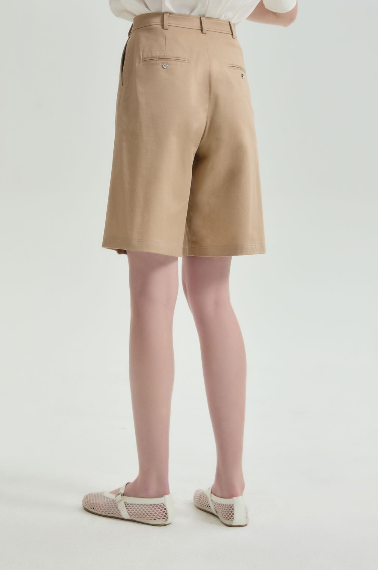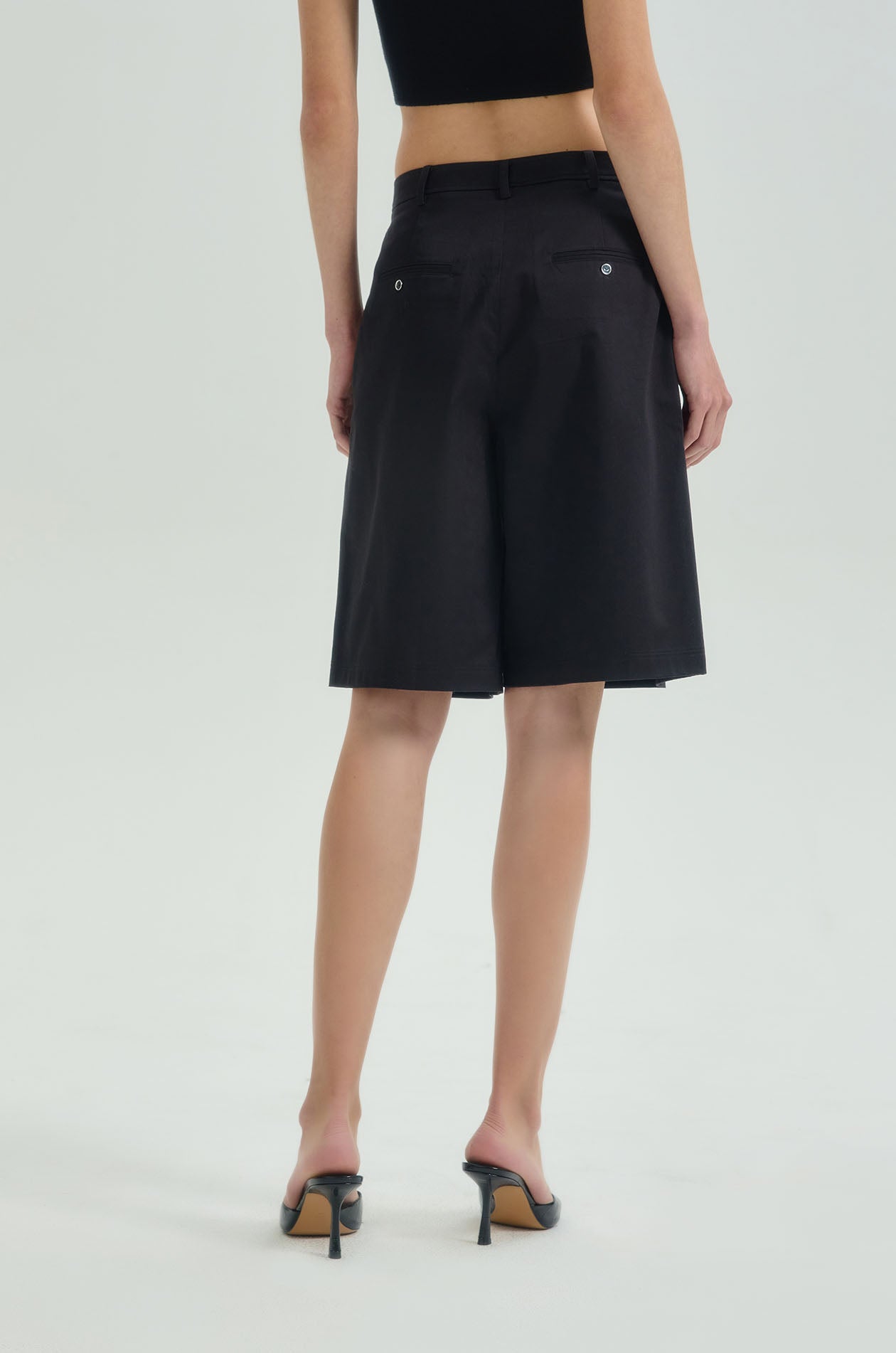 High-rise Bermuda shorts in woven fabric. Loose-straight legs with chunky pleats and side pockets. Matching skinny belt. Front hook and zip closure. Available in black and light brown.