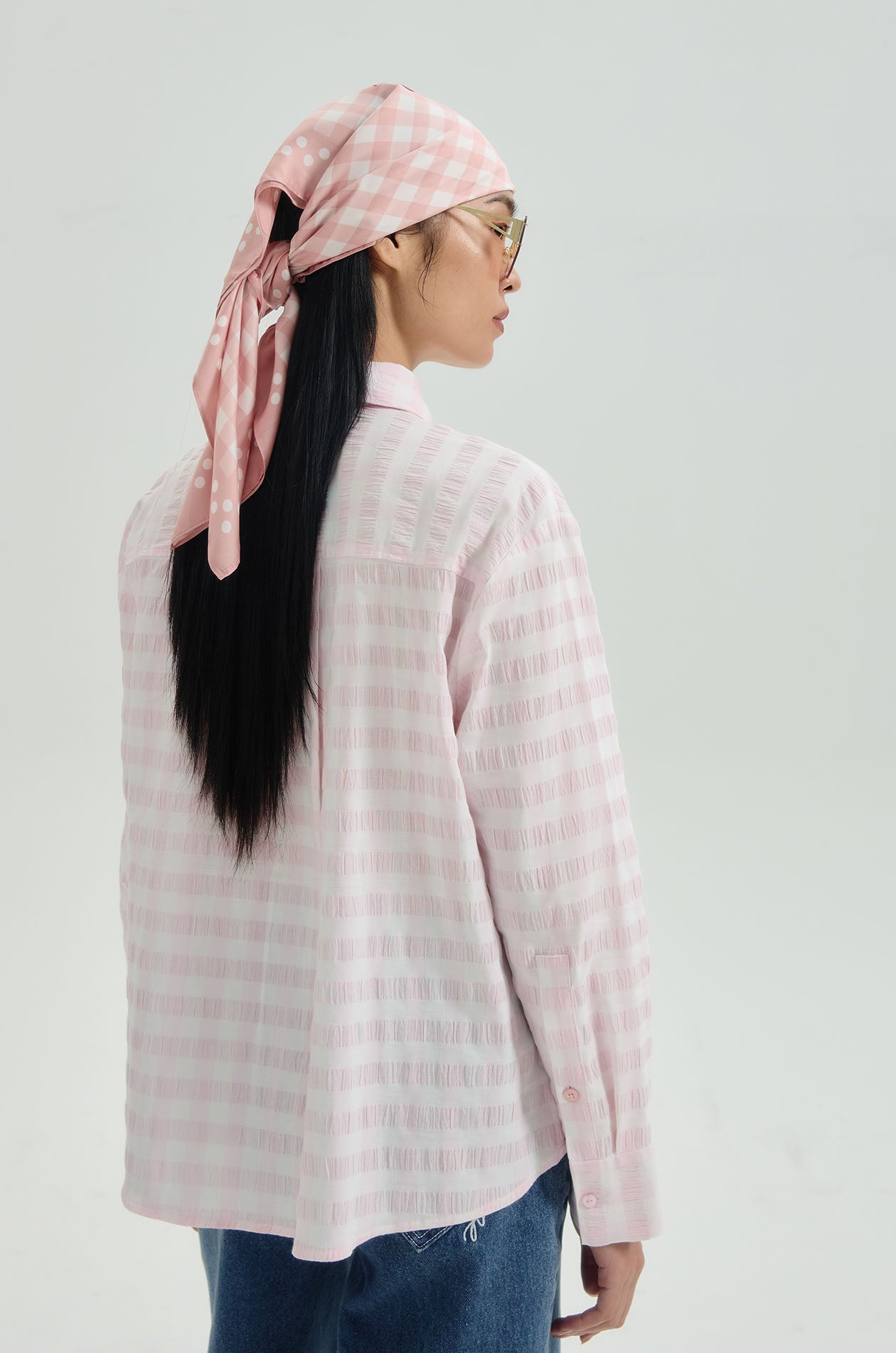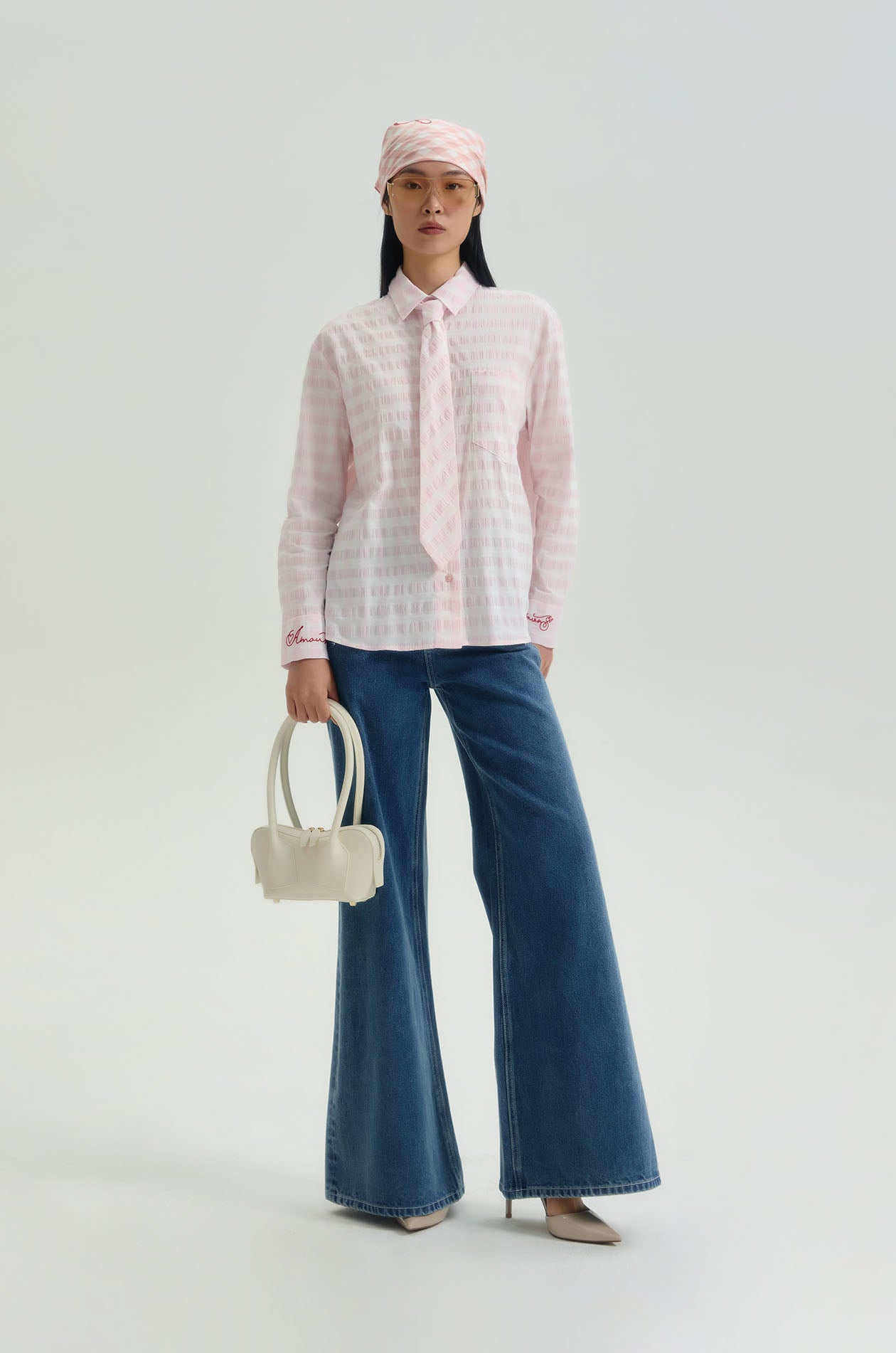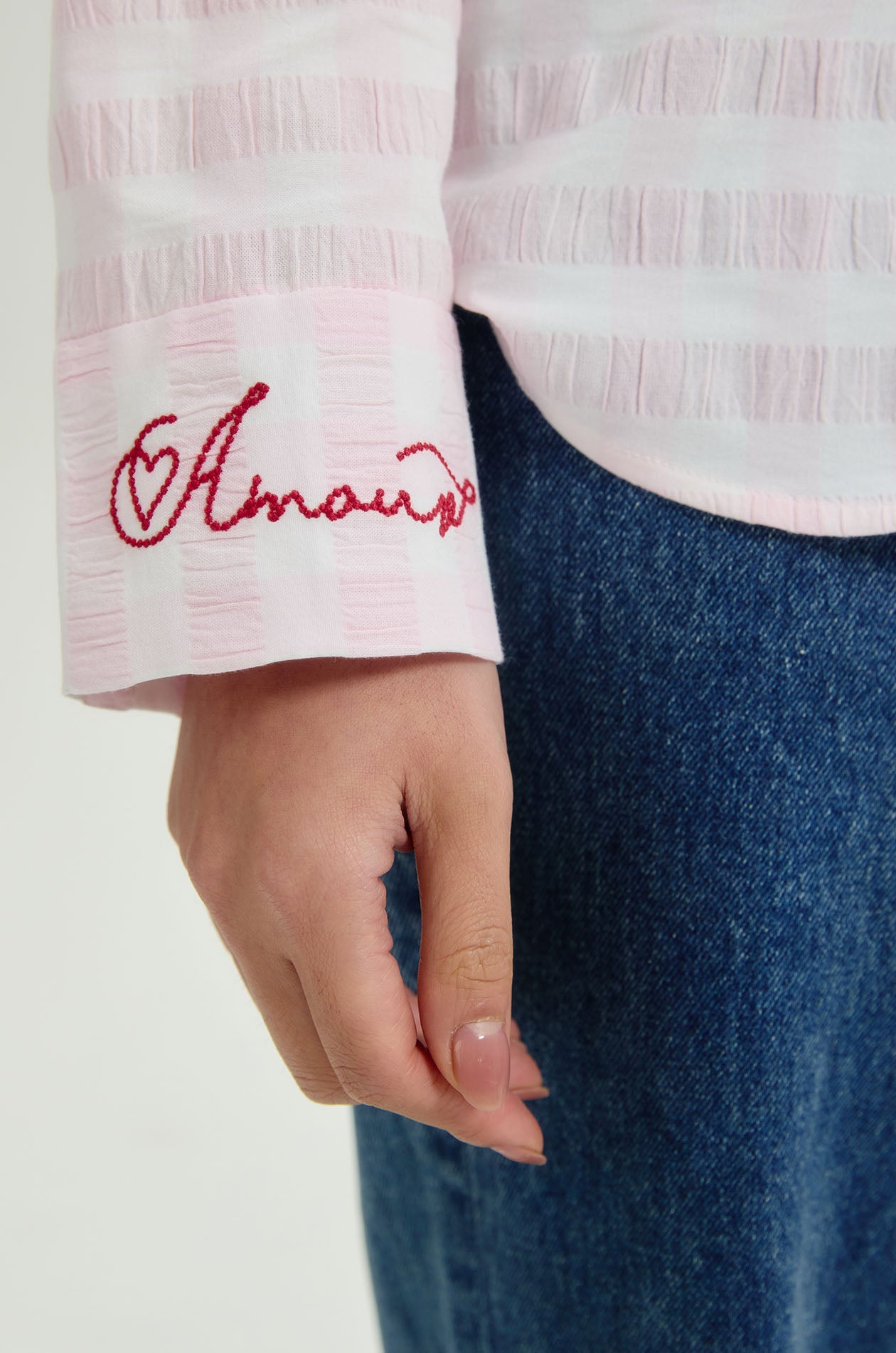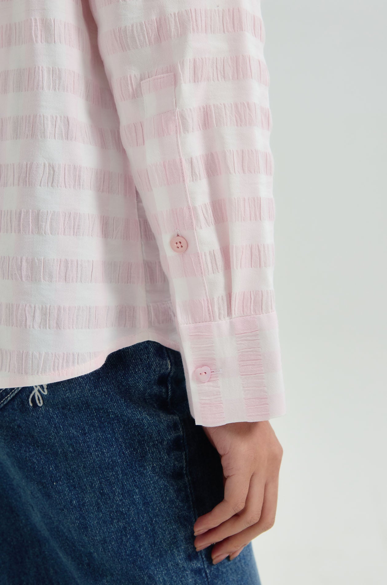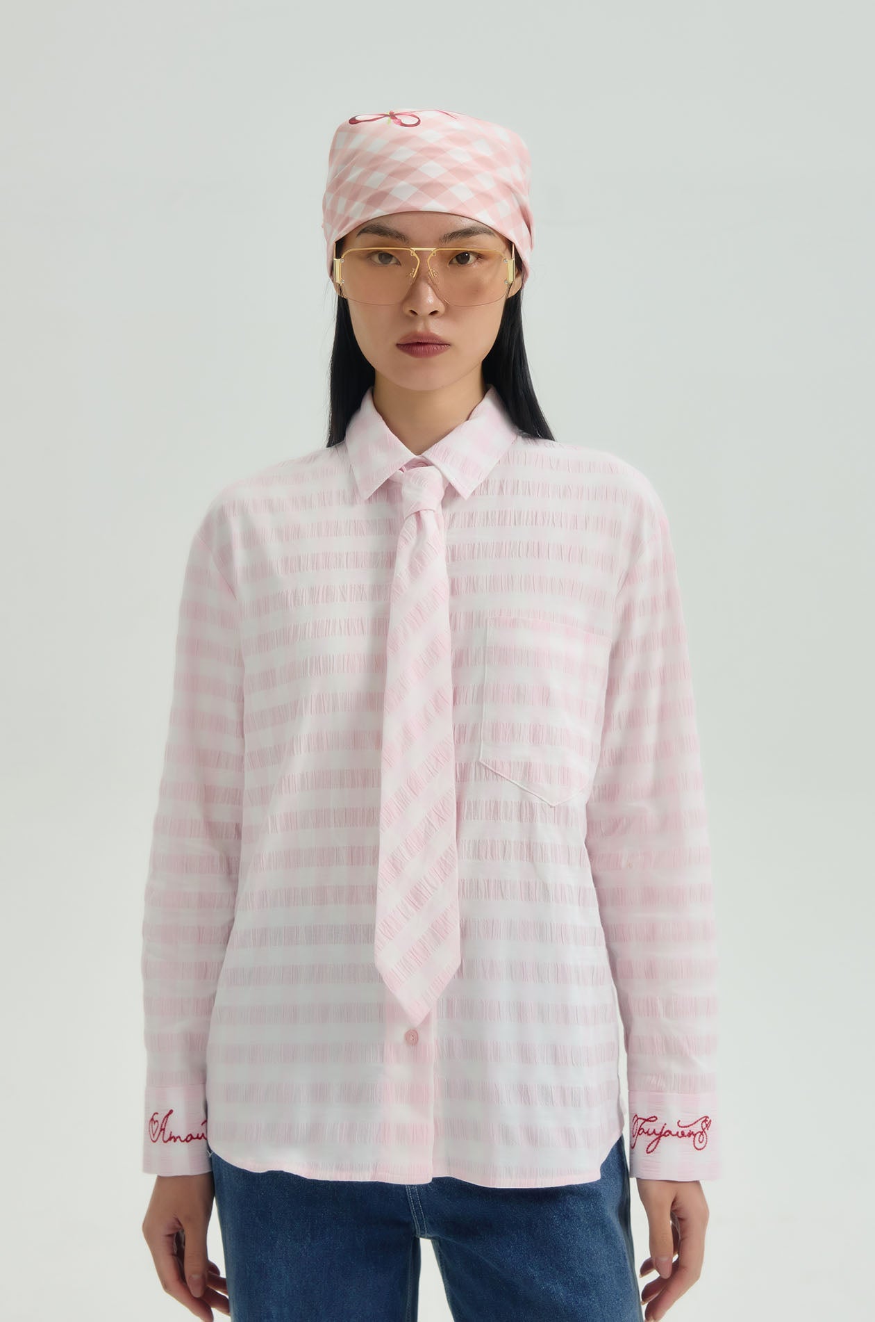 Jaspal The Edit x Proud & Tan | Long-sleeved shirt in crinkled fabric with a gingham pattern. Regular fit with a classic collar, chest pocket, embroidered cuffs, and a removable matching necktie. Front button closure. Available in pink.