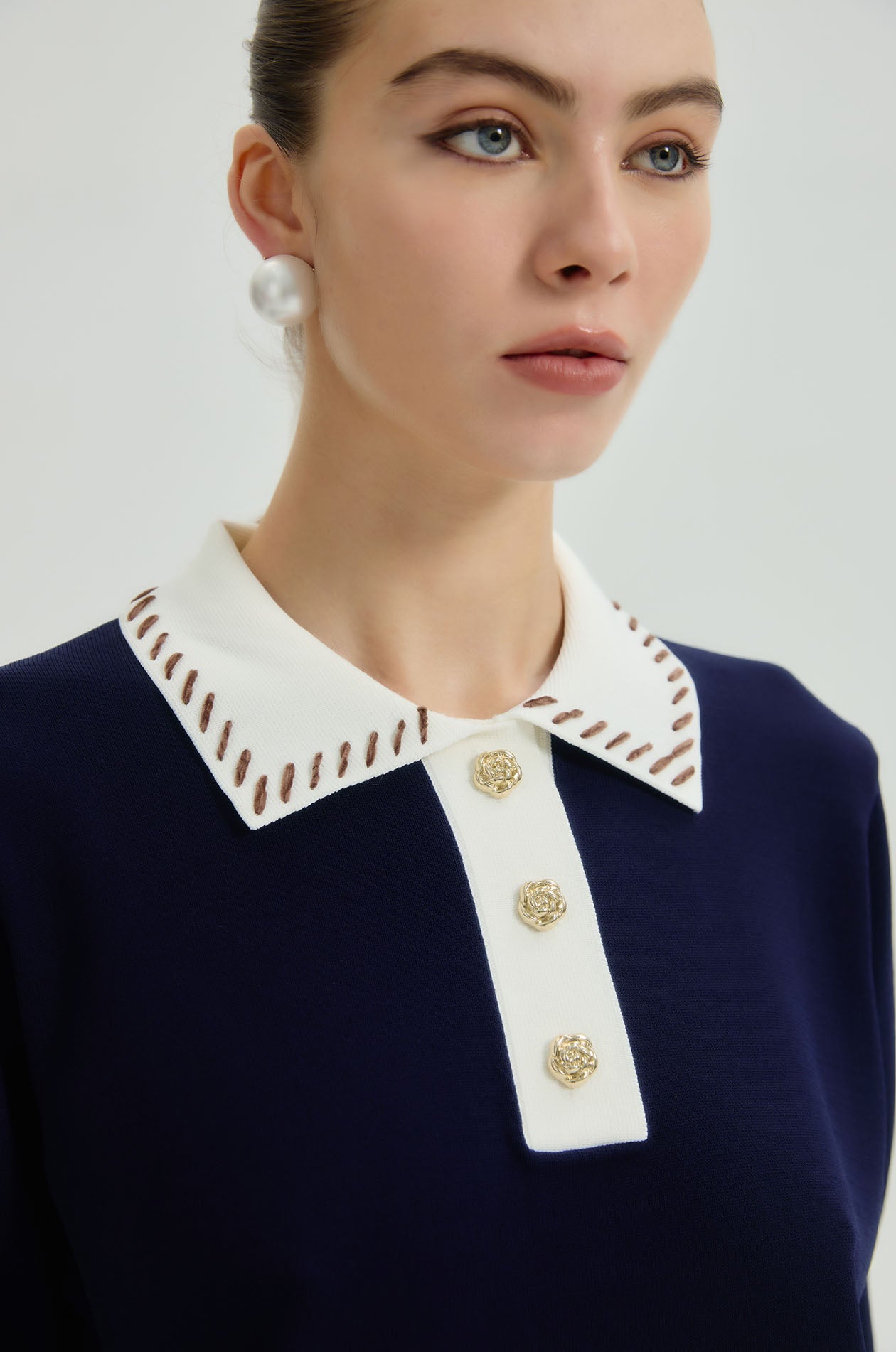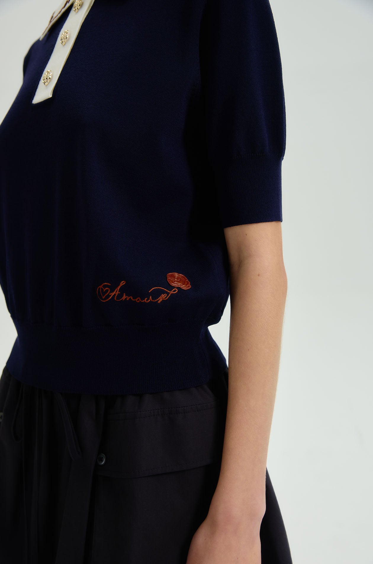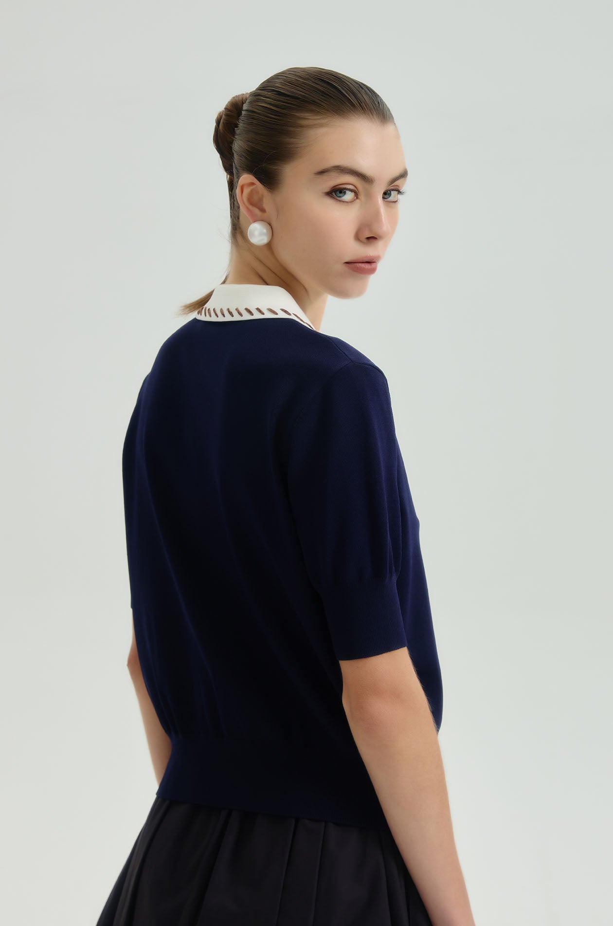 Jaspal The Edit x Proud & Tan | Short-sleeved polo shirt in knit fabric. Regular fit with ribbed edges and an oversized spread collar with stitching detail. Front button closure. Available in navy.