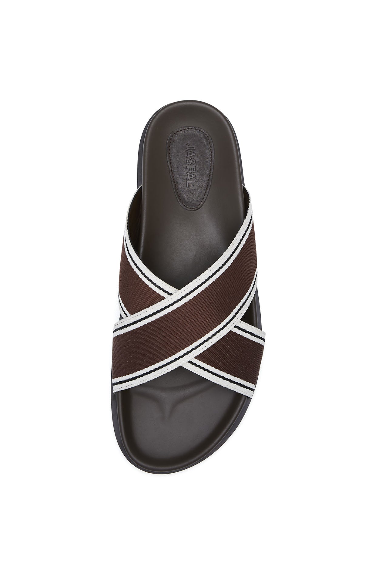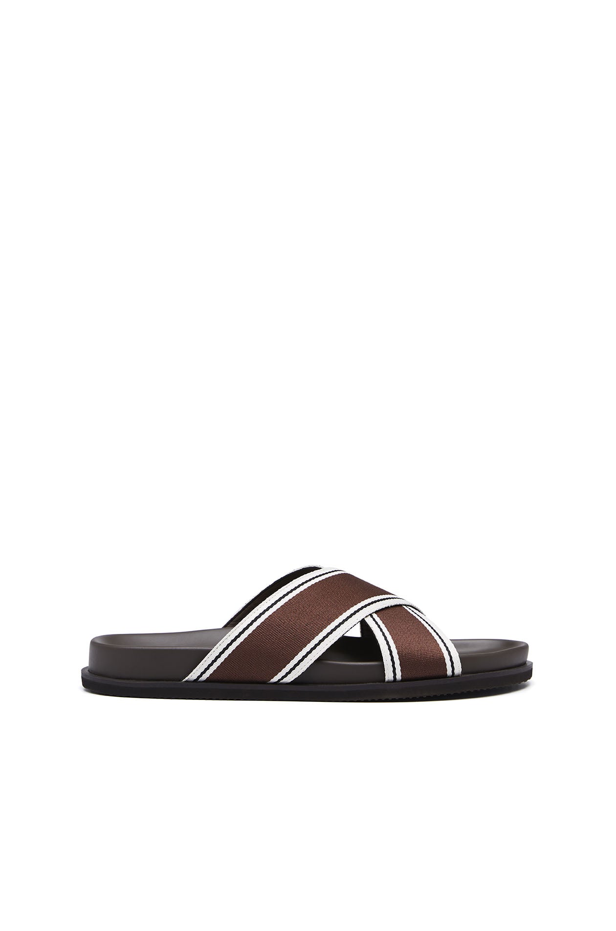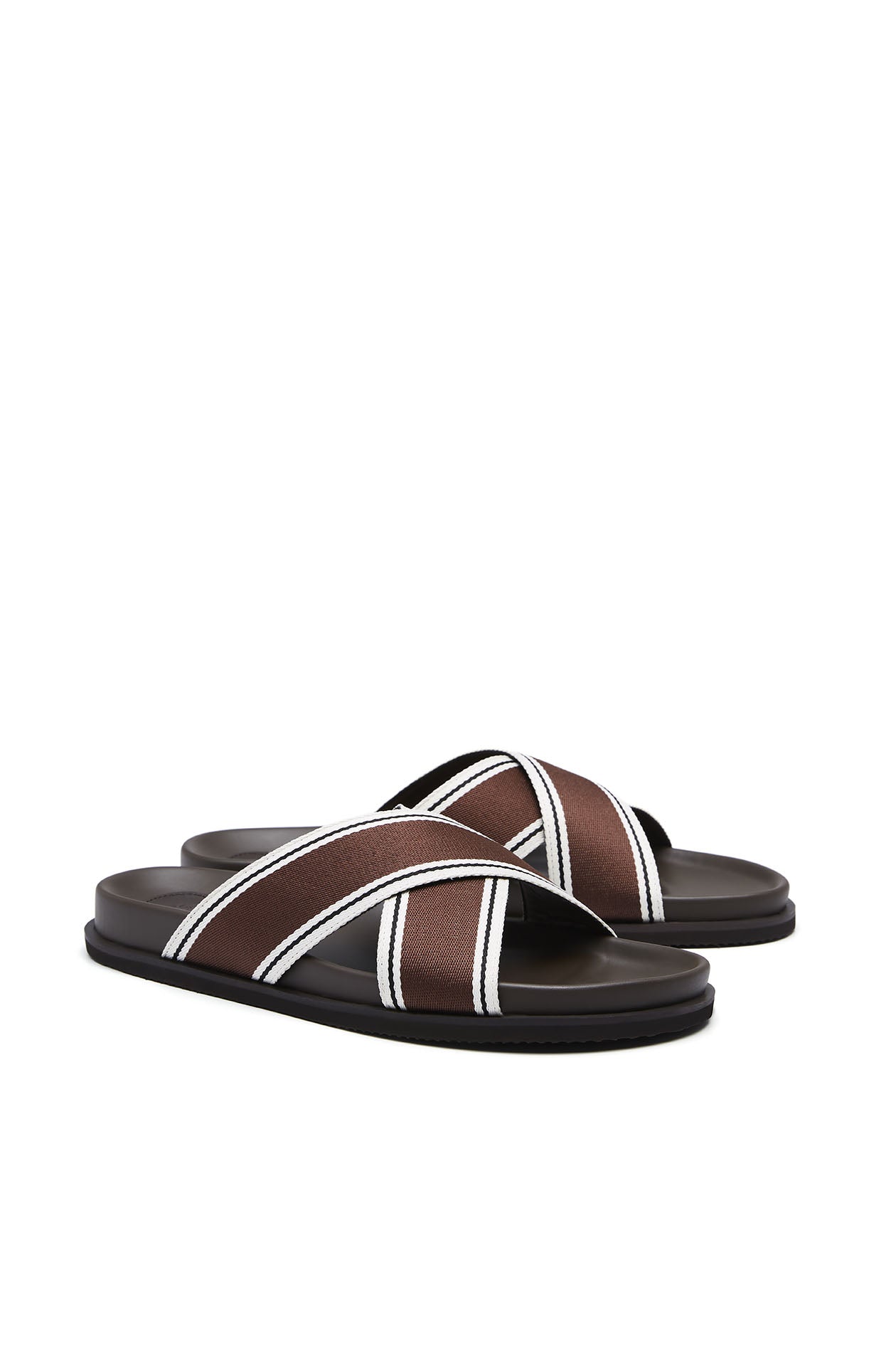 Round, open-toe slides in woven tape featuring crisscross straps and contrast-trim detailing. Faux leather footbed and rubber outsole. Available in black and brown.