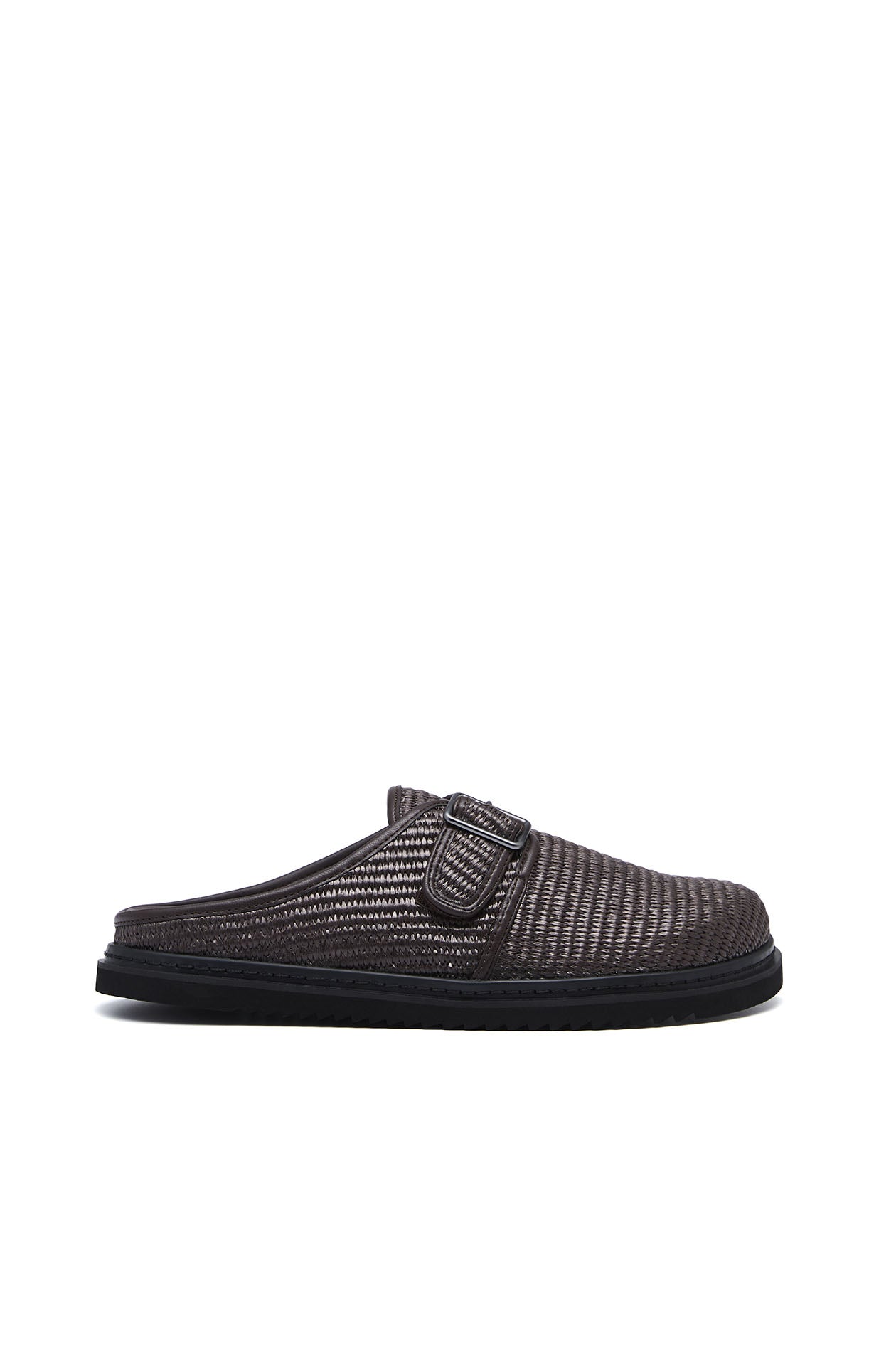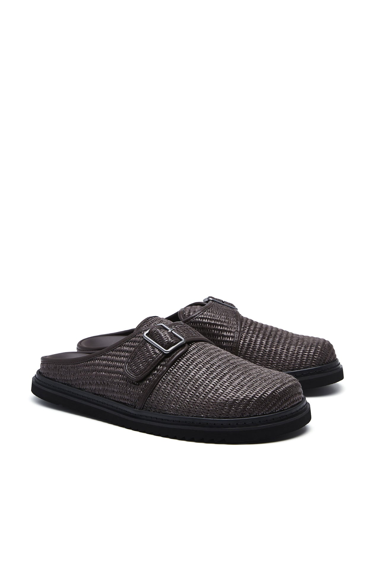 Round-toe mules in faux raffia featuring buckle straps. Faux leather footbed and EVA outsole. Available in brown.