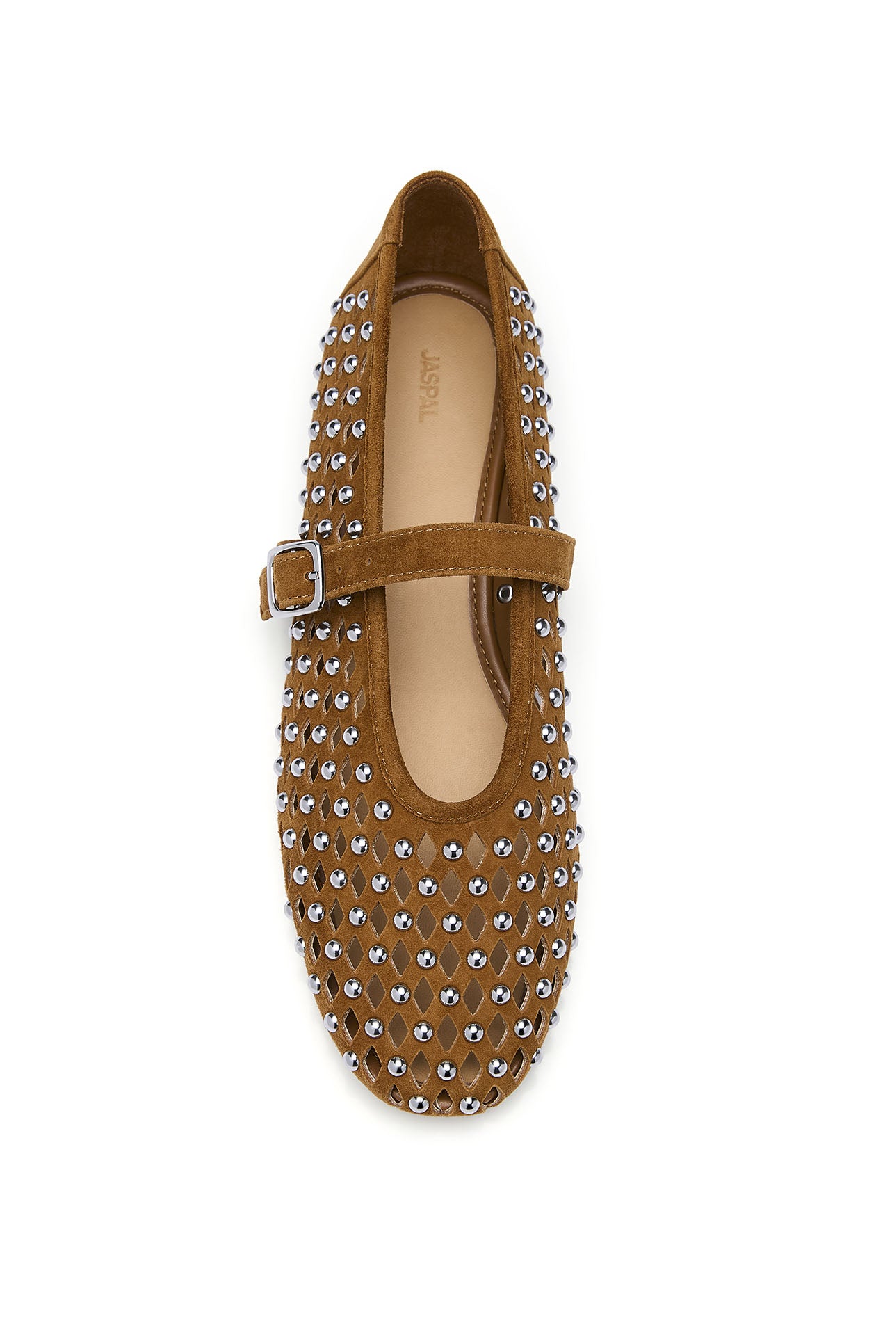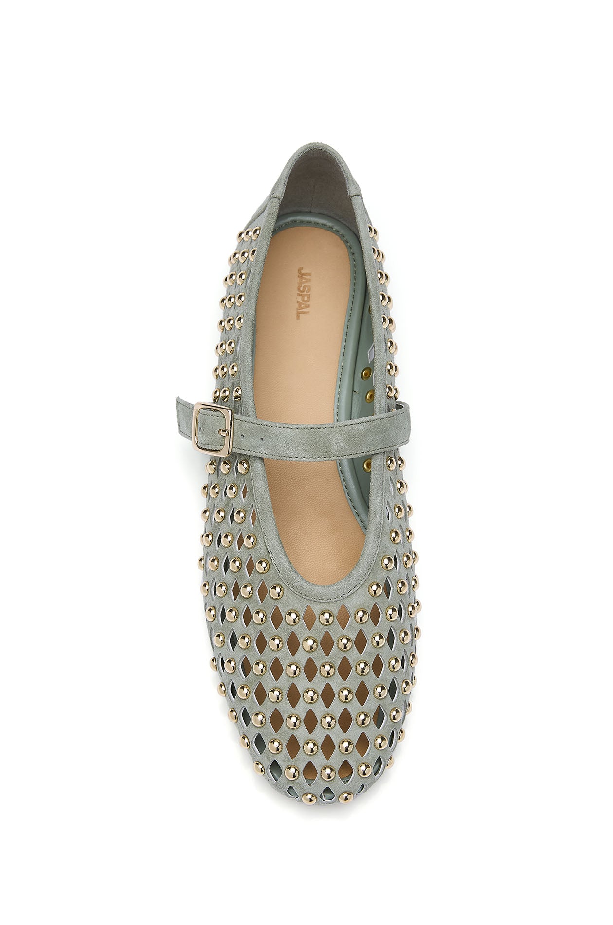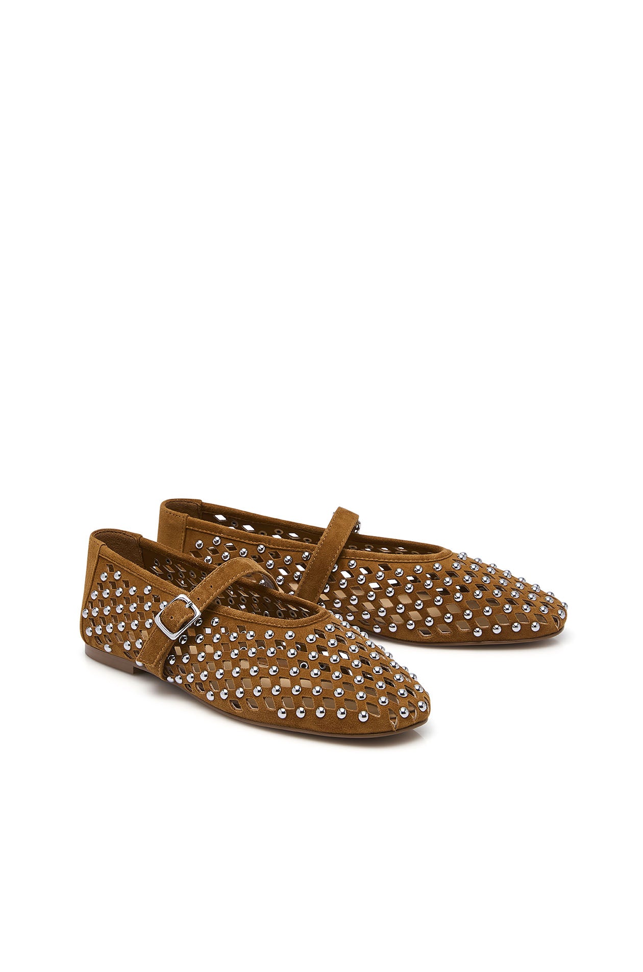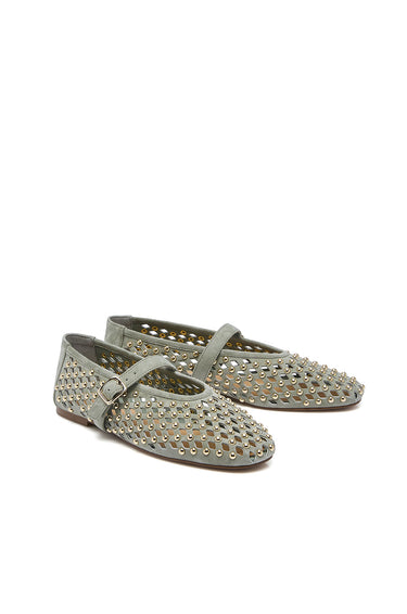 Mary Jane ballerina in cow suede leather, featuring an openwork woven design with rhinestone embellishment. Available in tan and green.